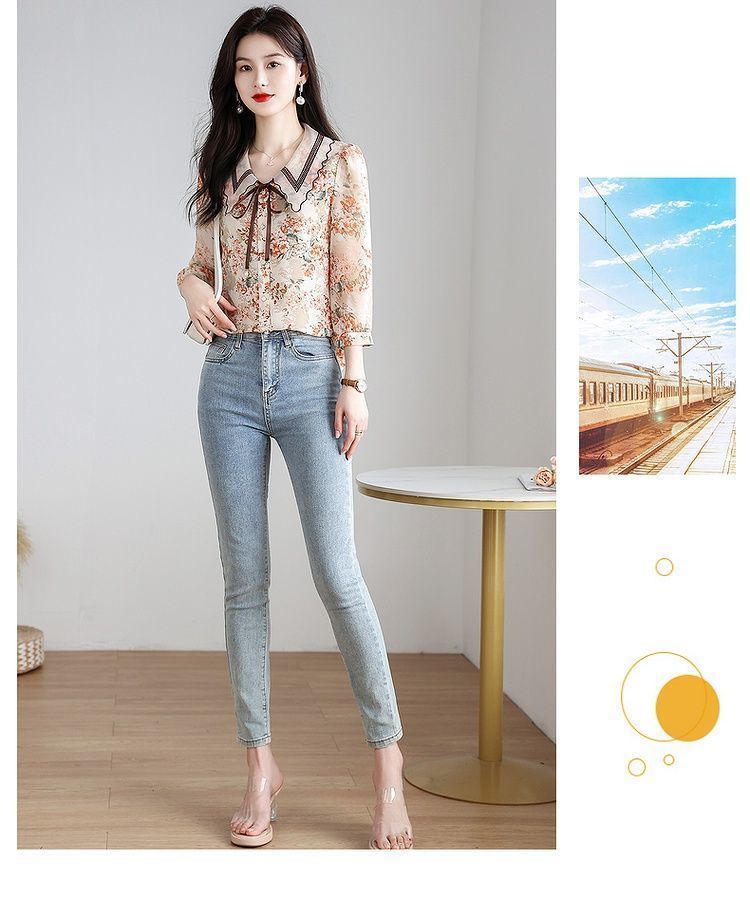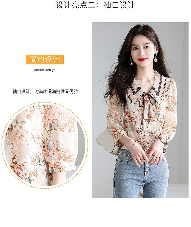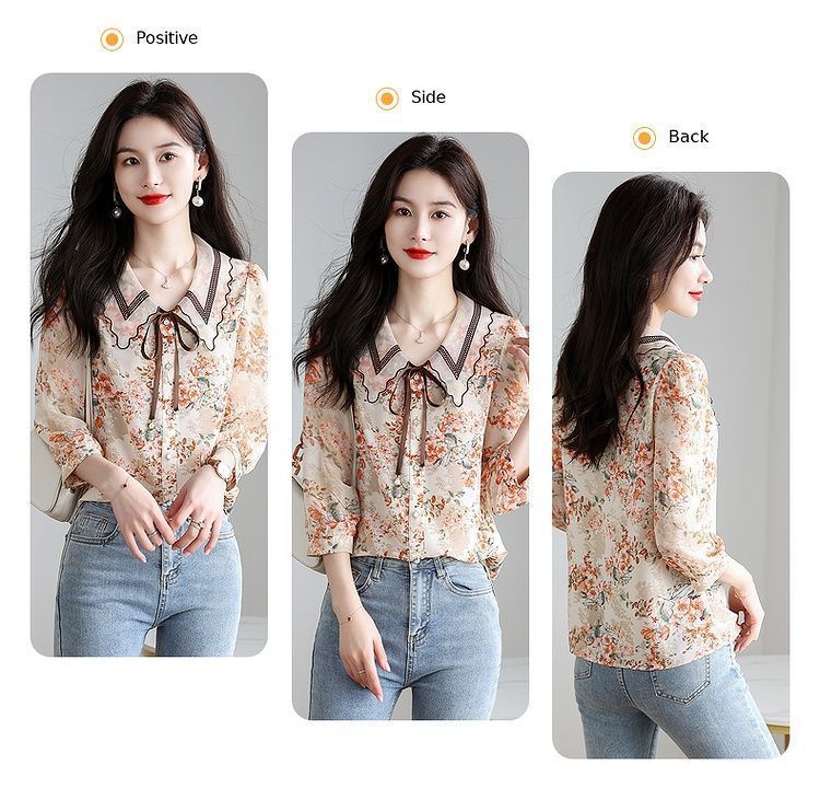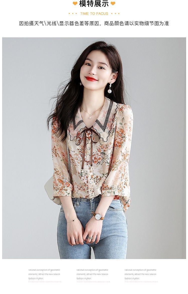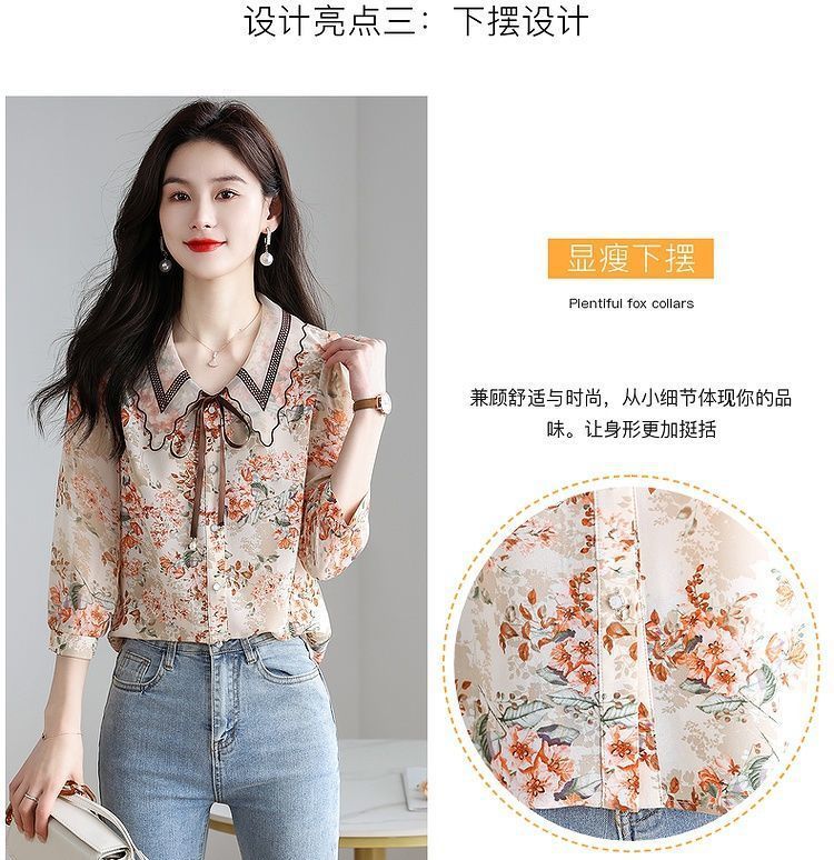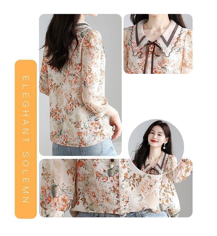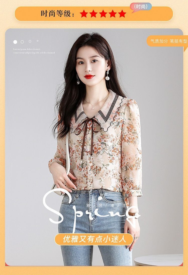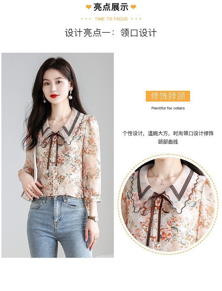 꽃 쉬폰 셔츠 여성의 봄과 여름 2024 새로운 서양식 시대 감소 세련된 하이 엔드 작은 셔츠 7 소매 연령 감소 탑스토어 가기