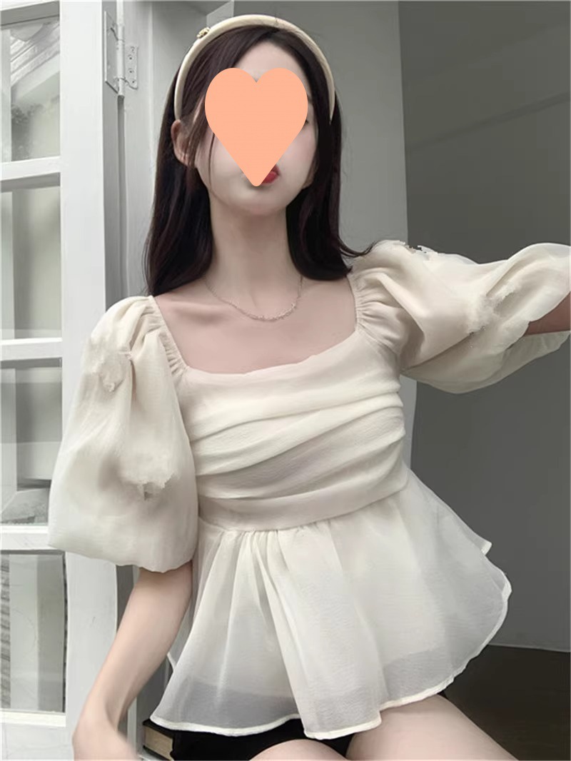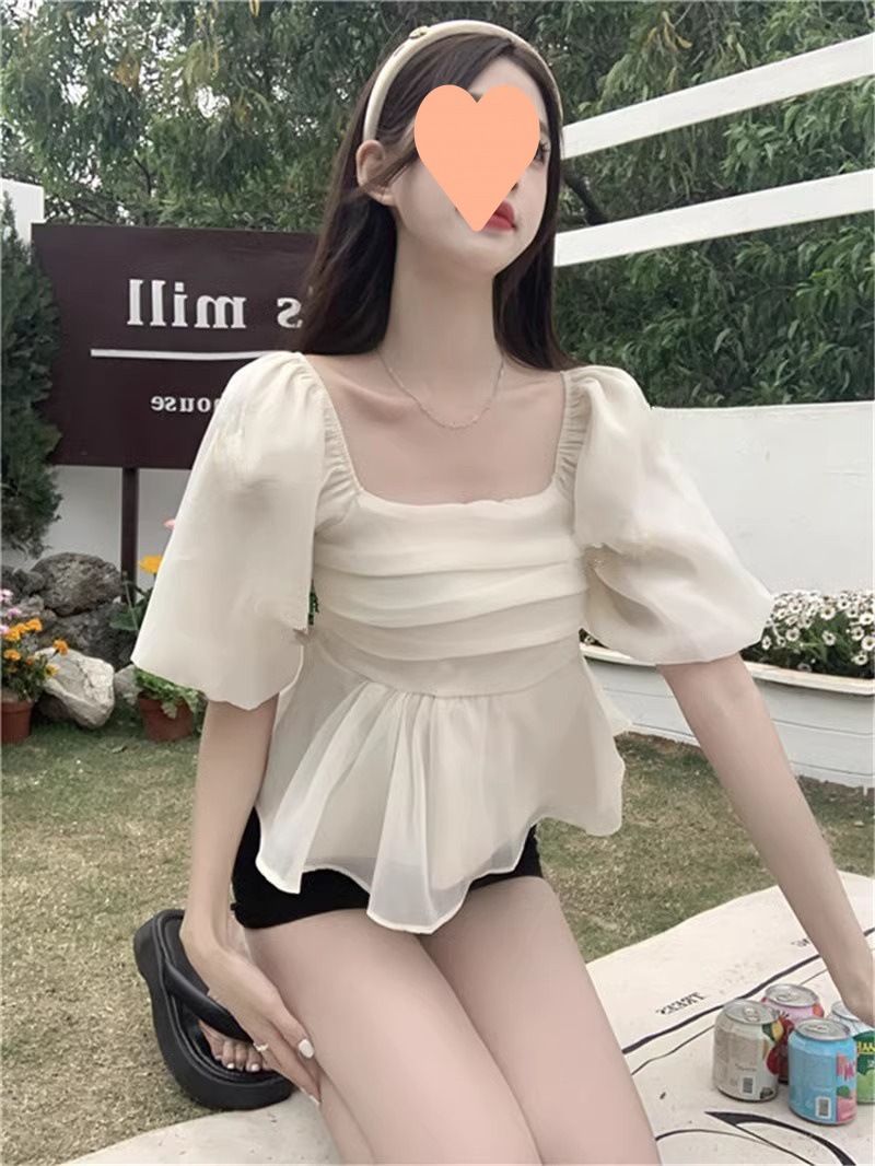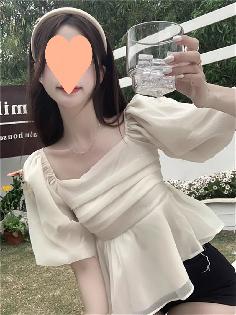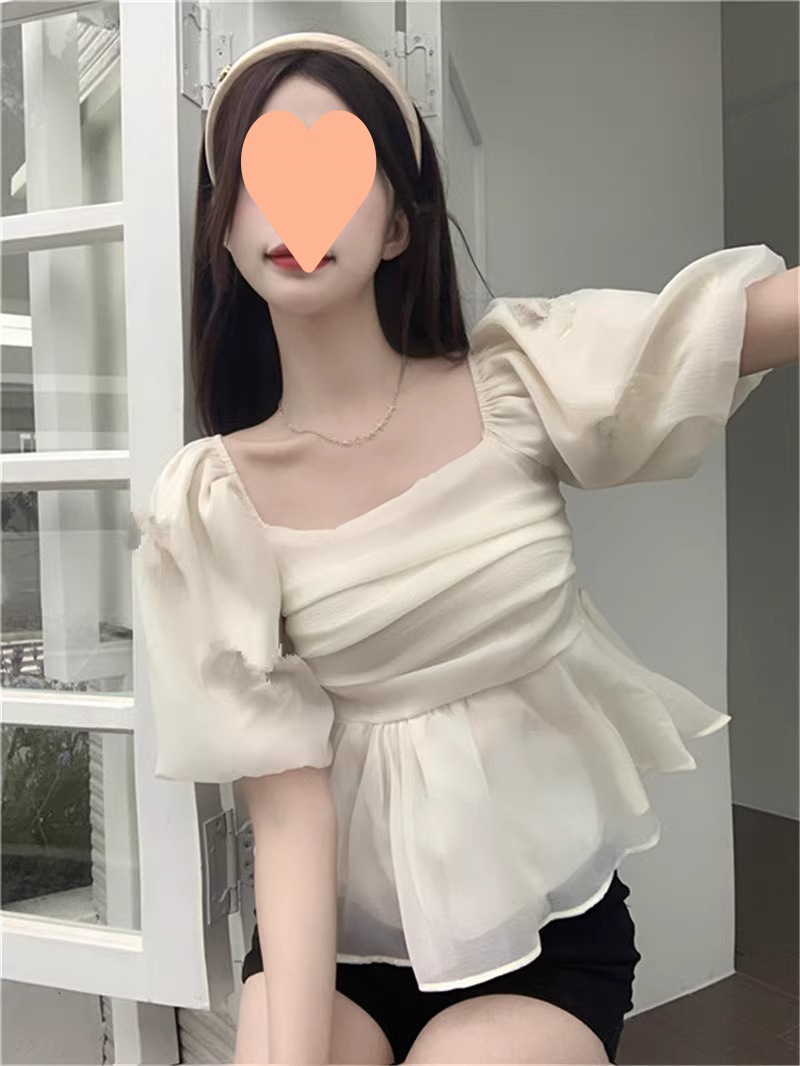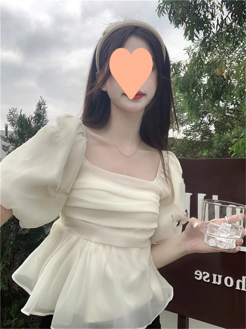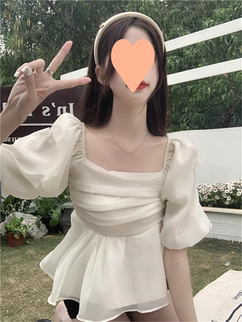 달콤한 스퀘어 칼라 살구색 쉬폰 셔츠 여성 여름 랩 가슴 주름 퍼프 슬리브 탑 웨이스트 슬림 핏 쇼트베이스 셔츠스토어 가기
