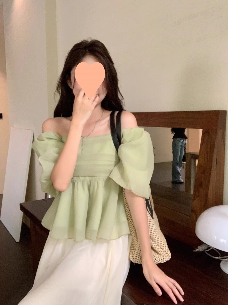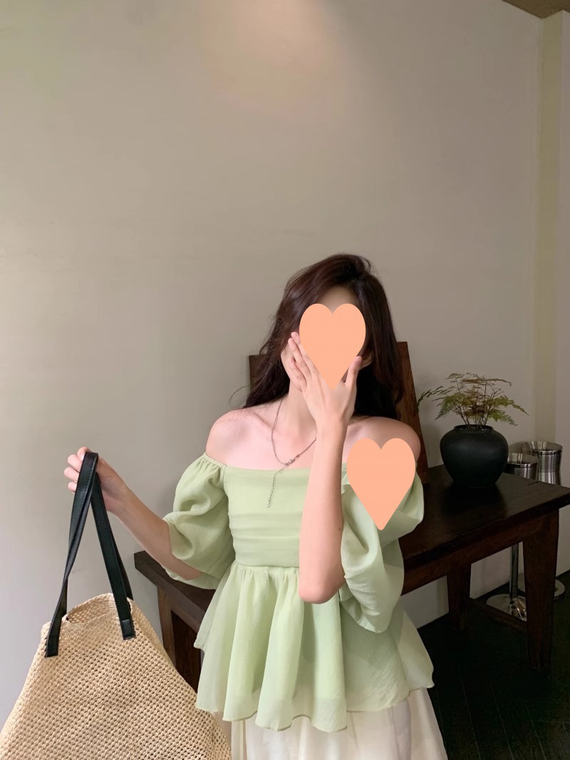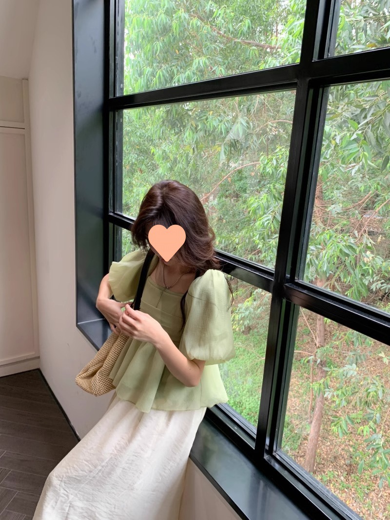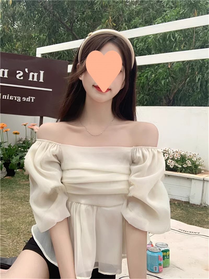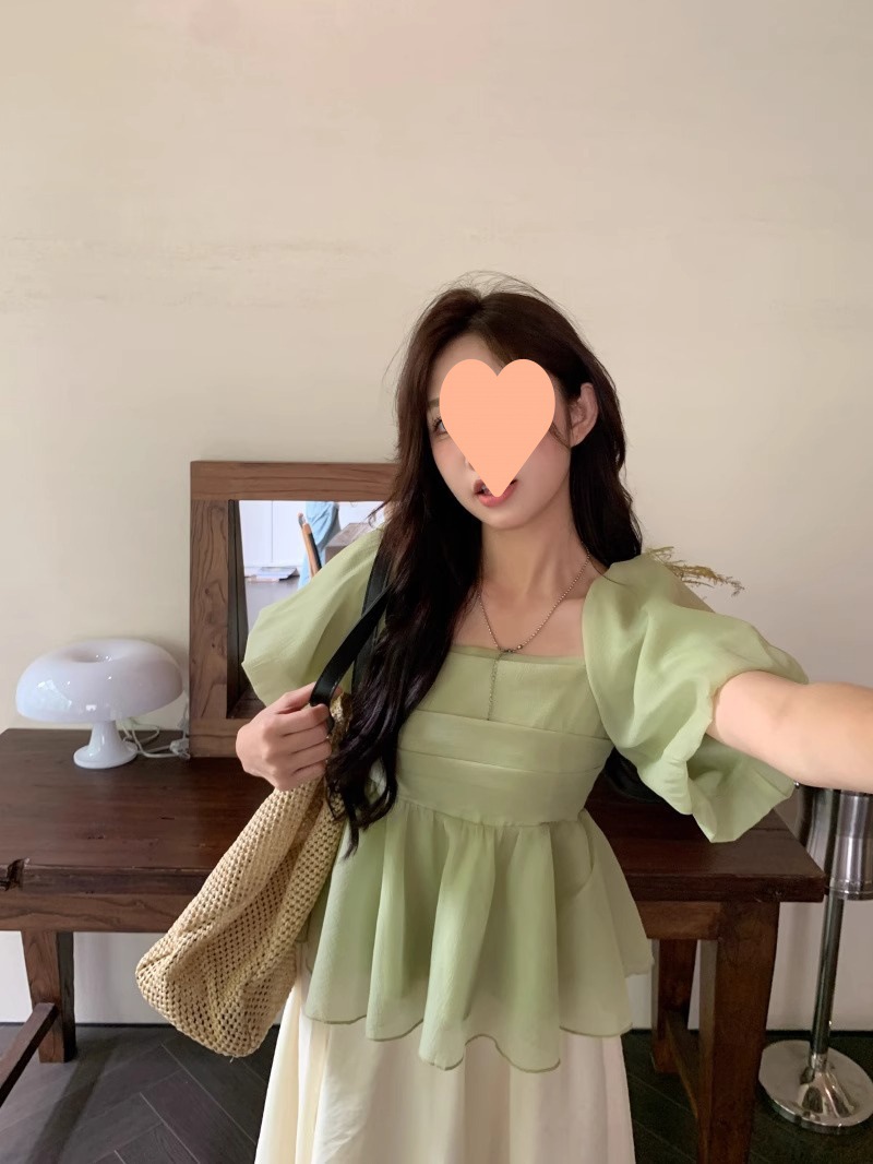 달콤한 스퀘어 칼라 살구색 쉬폰 셔츠 여성 여름 랩 가슴 주름 퍼프 슬리브 탑 웨이스트 슬림 핏 쇼트베이스 셔츠스토어 가기