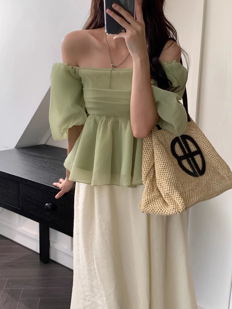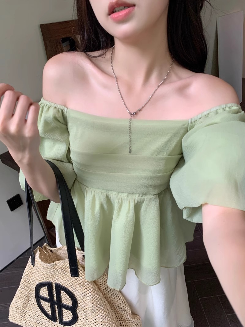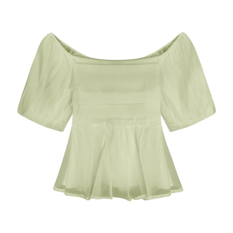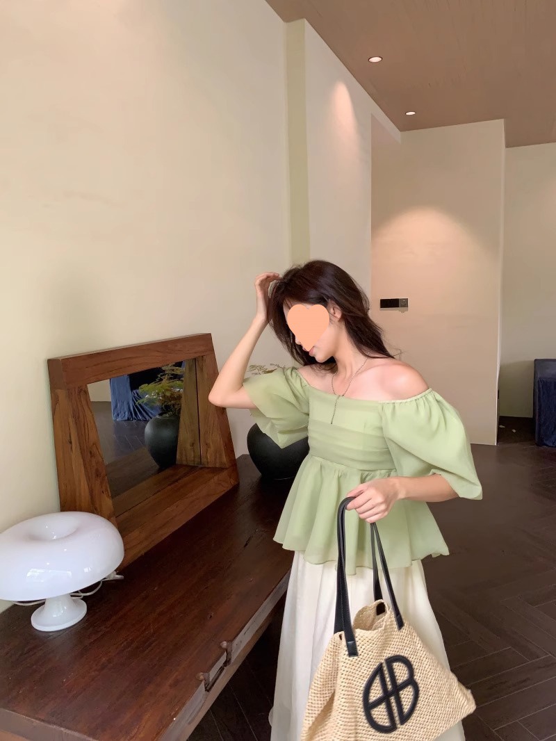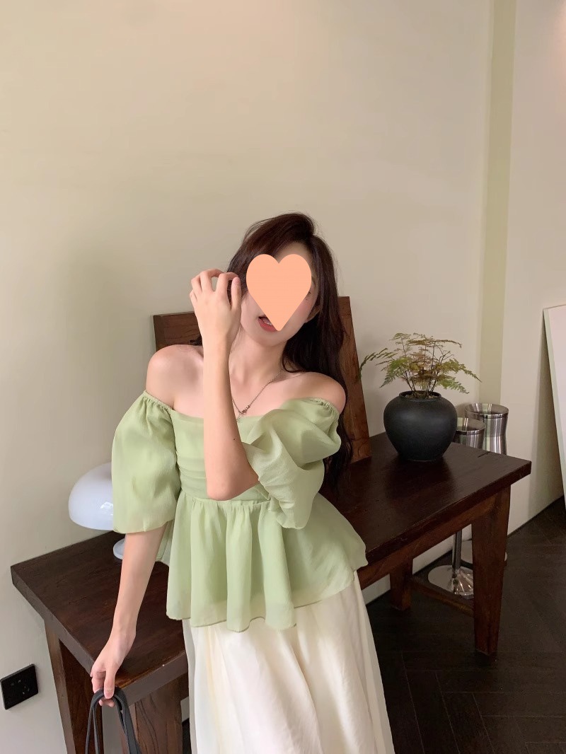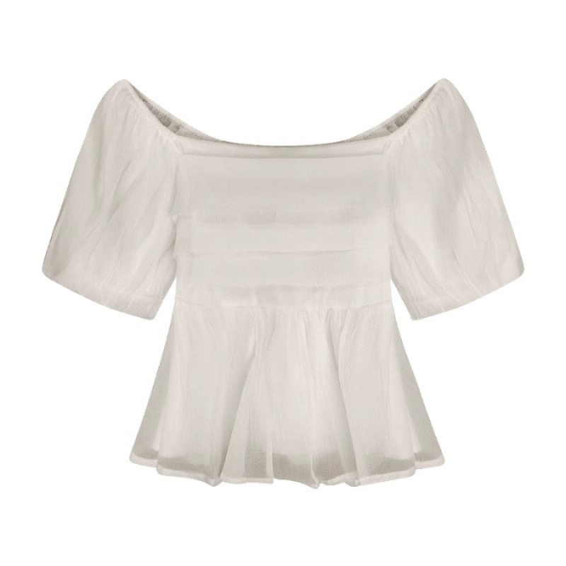 달콤한 스퀘어 칼라 살구색 쉬폰 셔츠 여성 여름 랩 가슴 주름 퍼프 슬리브 탑 웨이스트 슬림 핏 쇼트베이스 셔츠스토어 가기
