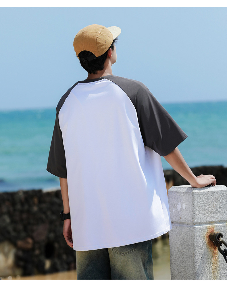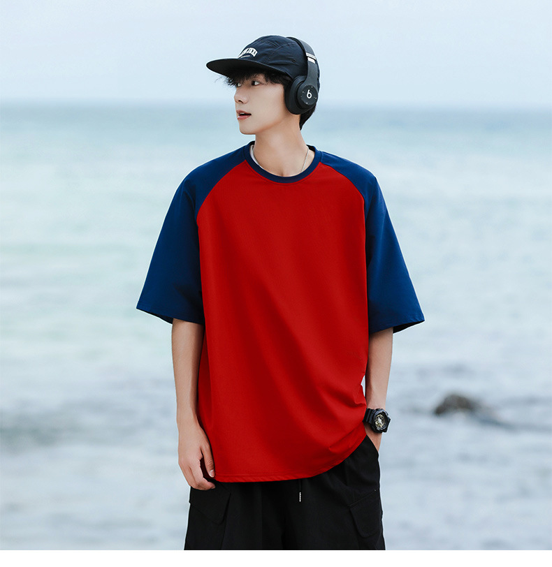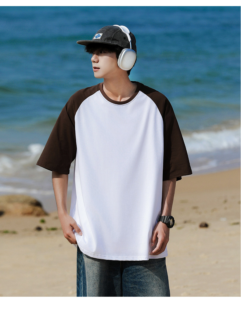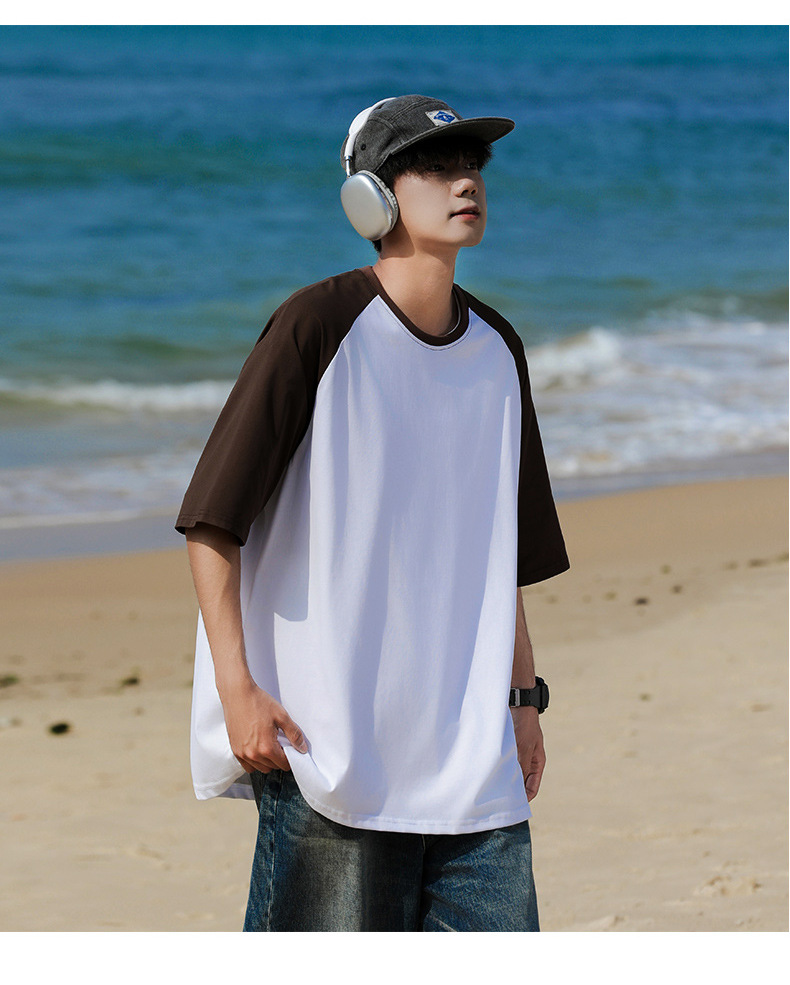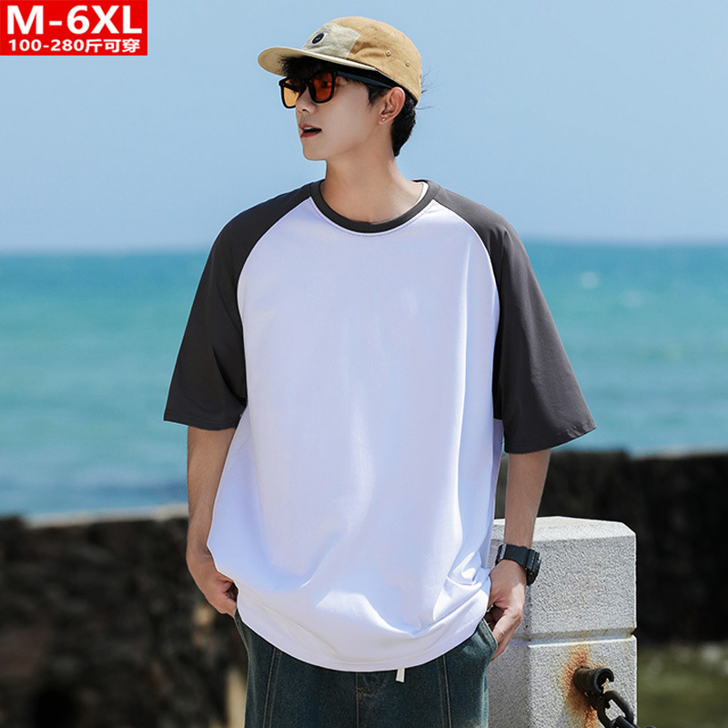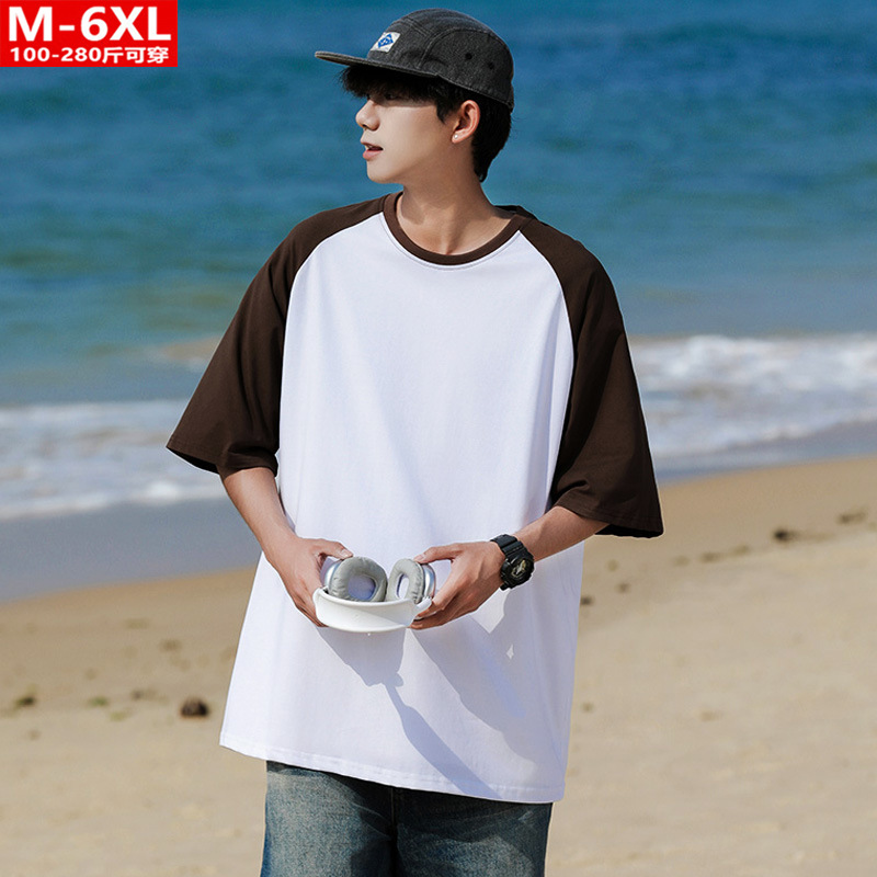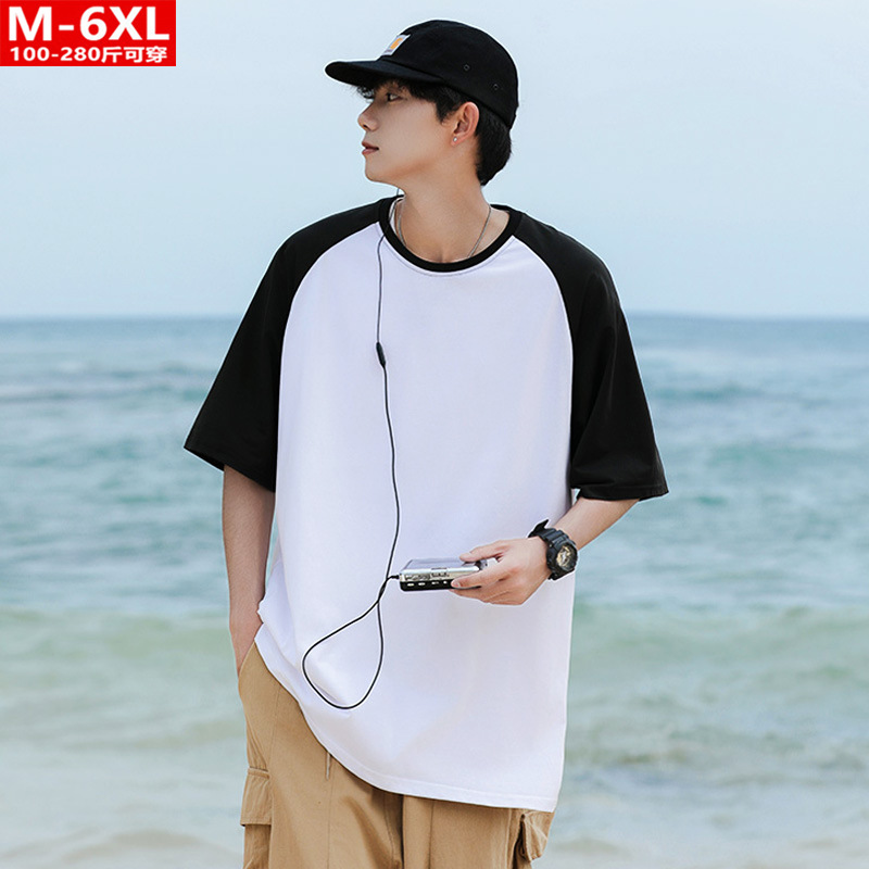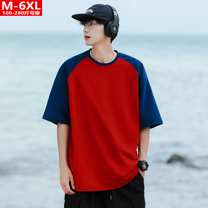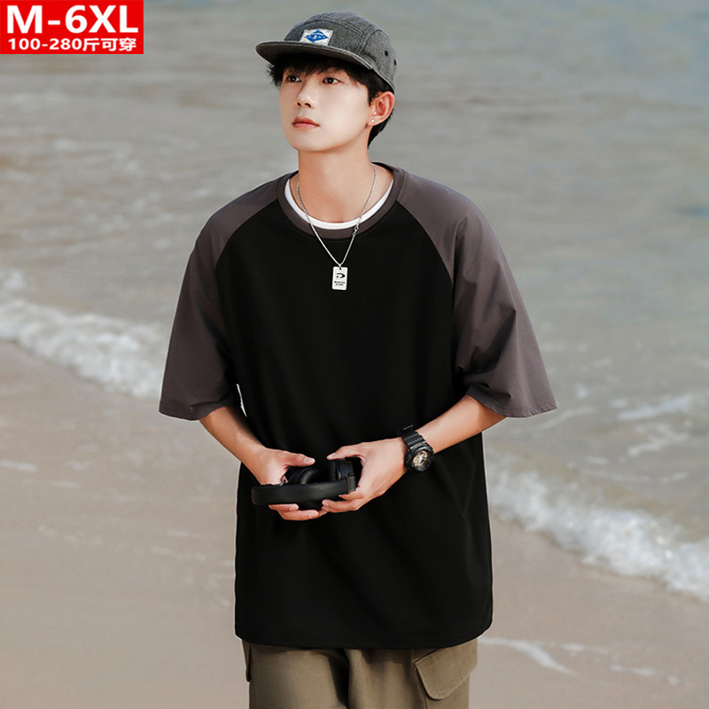 여름 트렌디 한 홍콩 스타일 남성 컬러 블록 라운드 넥 반팔 티셔츠 지방 남성 플러스 사이즈 대형 루즈 단색 티셔츠