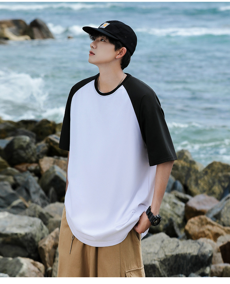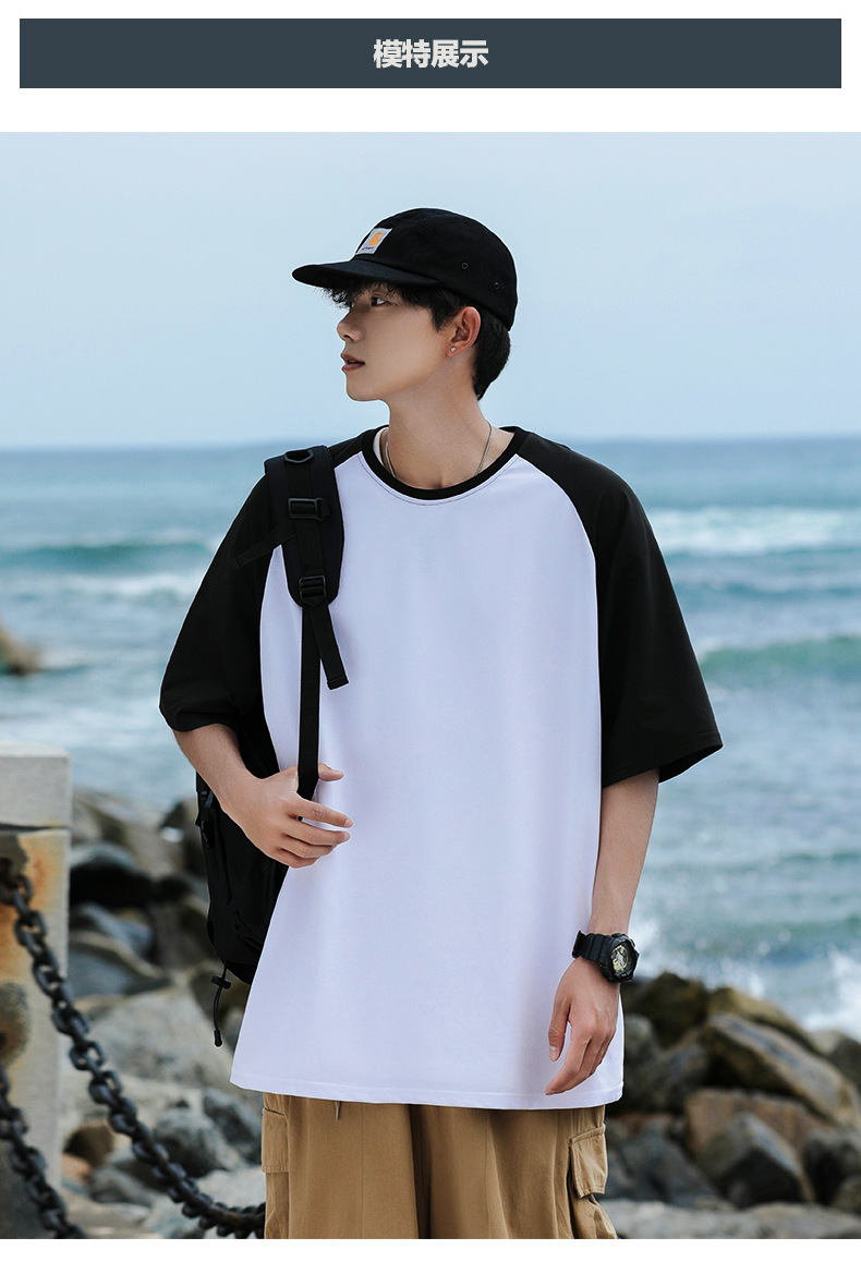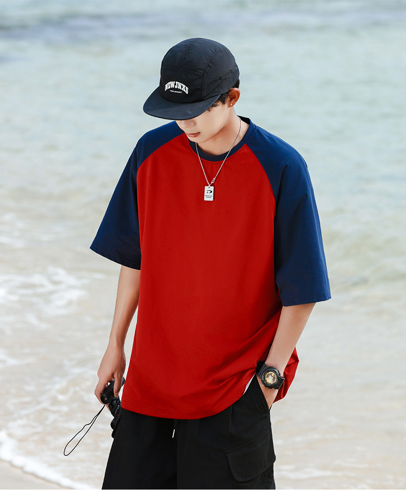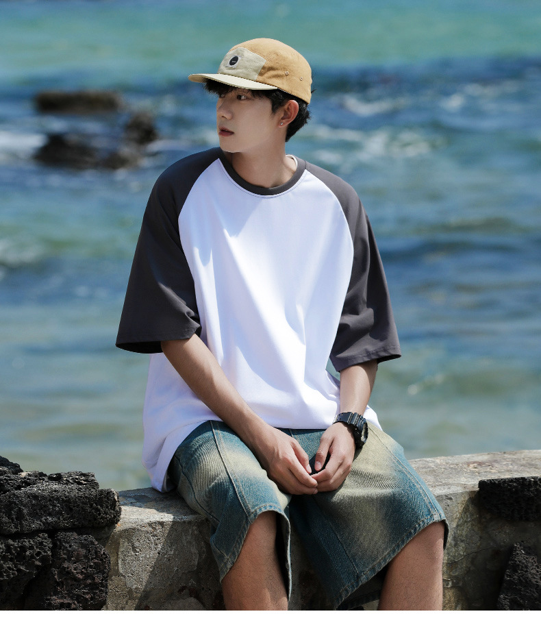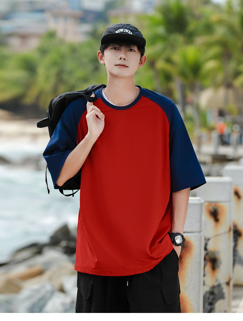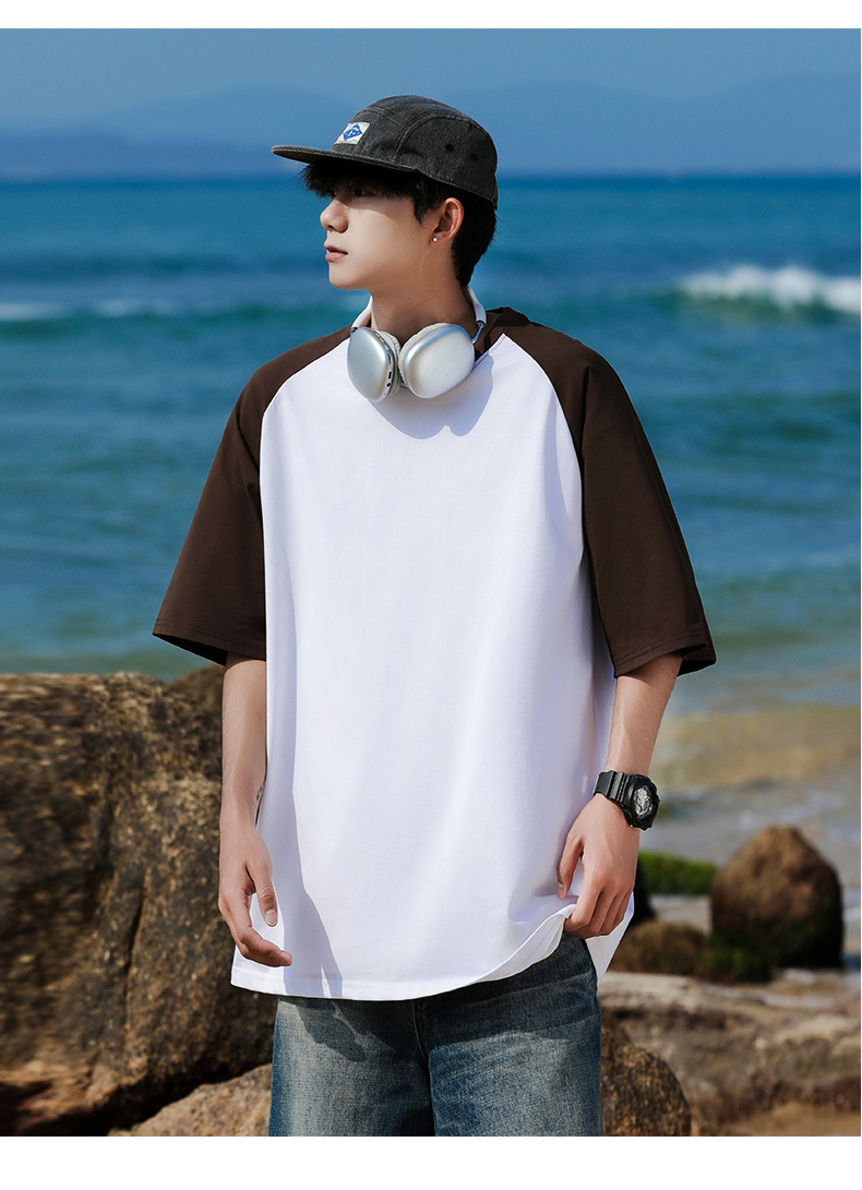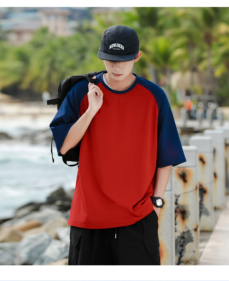 여름 트렌디 한 홍콩 스타일 남성 컬러 블록 라운드 넥 반팔 티셔츠 지방 남성 플러스 사이즈 대형 루즈 단색 티셔츠