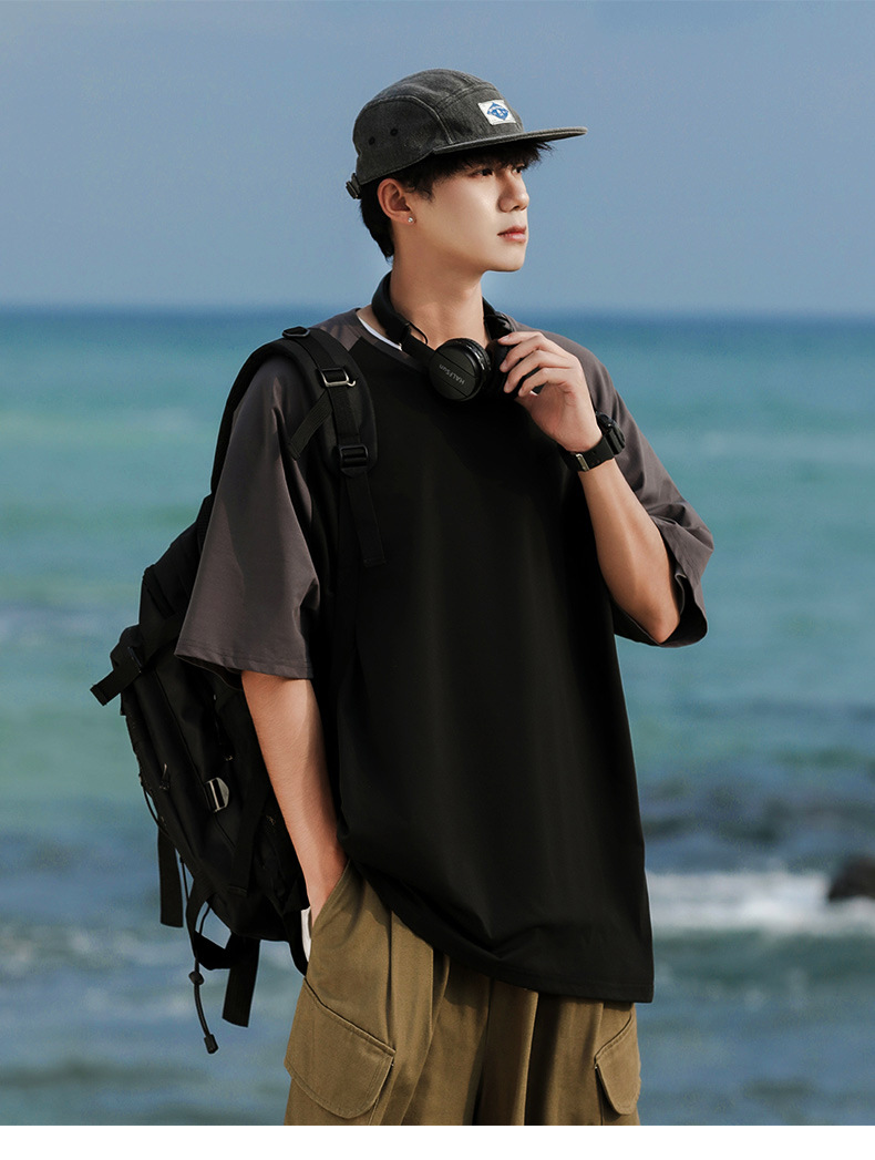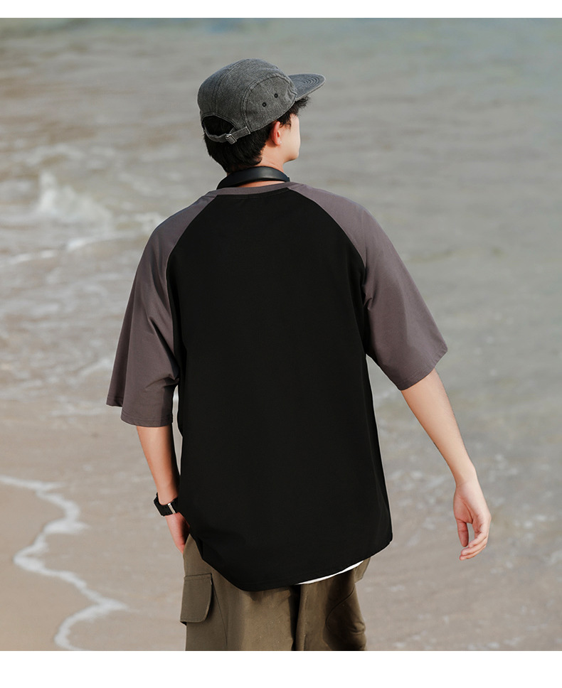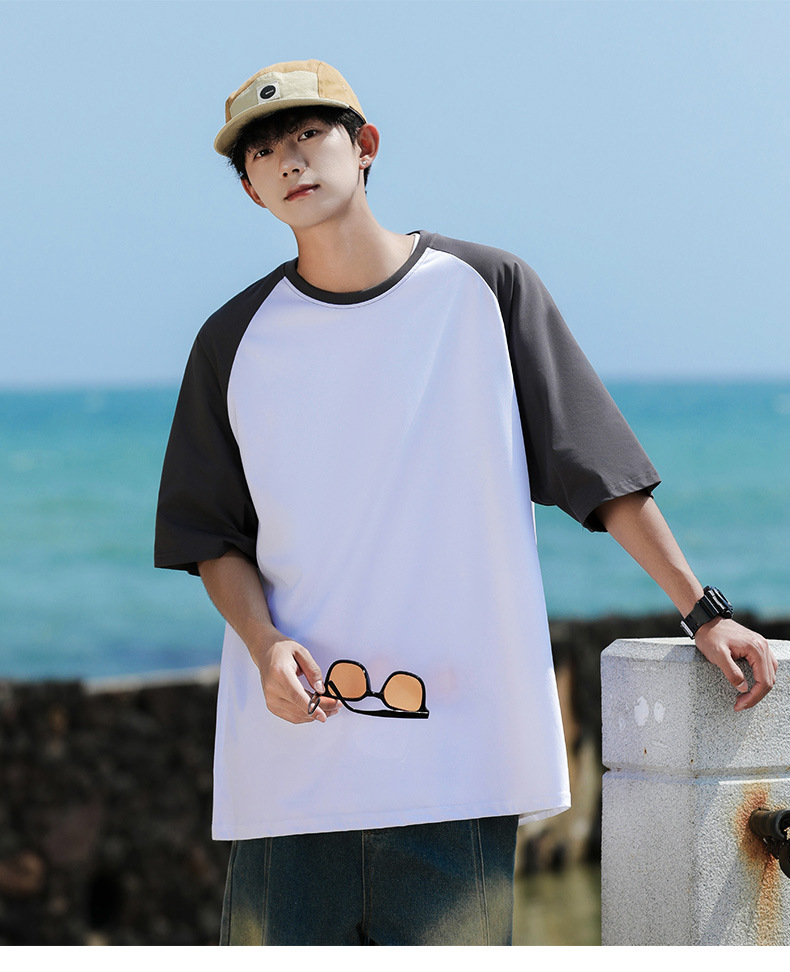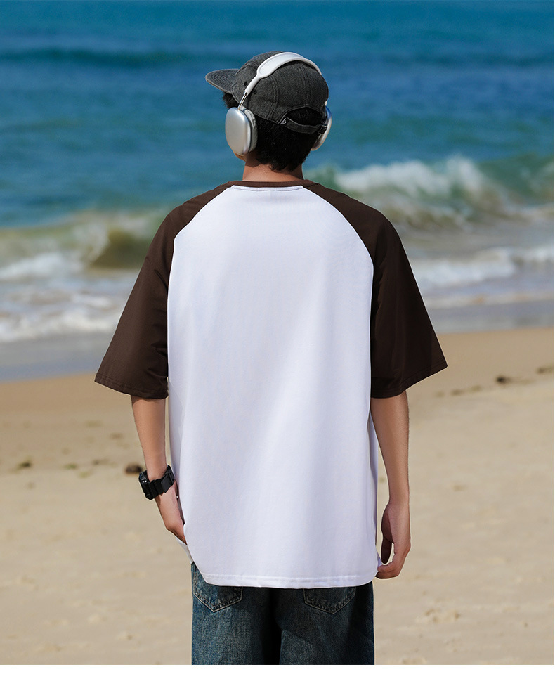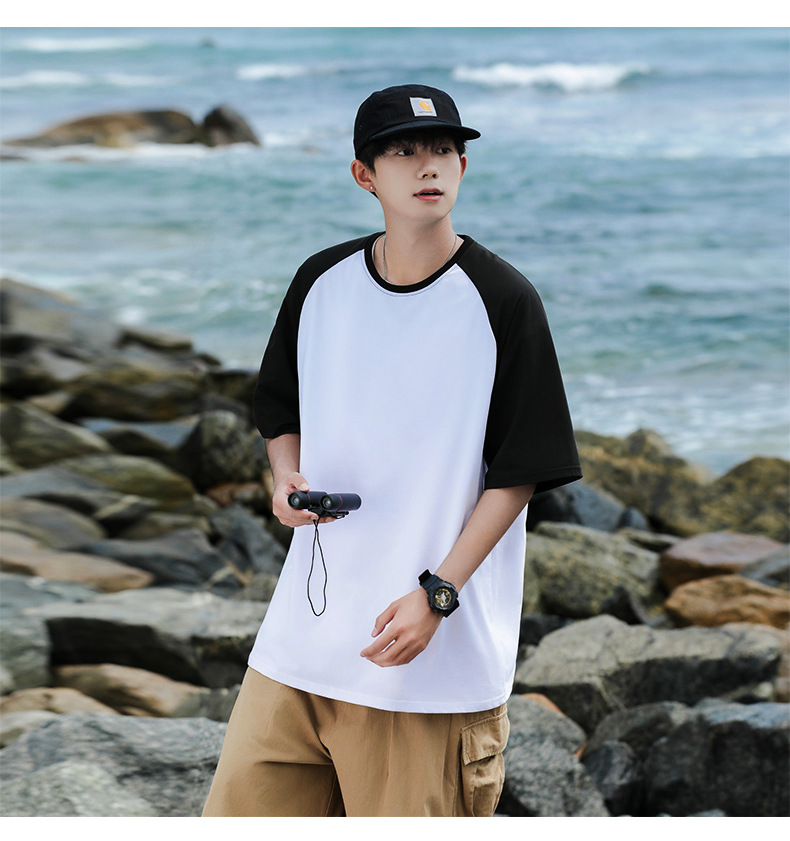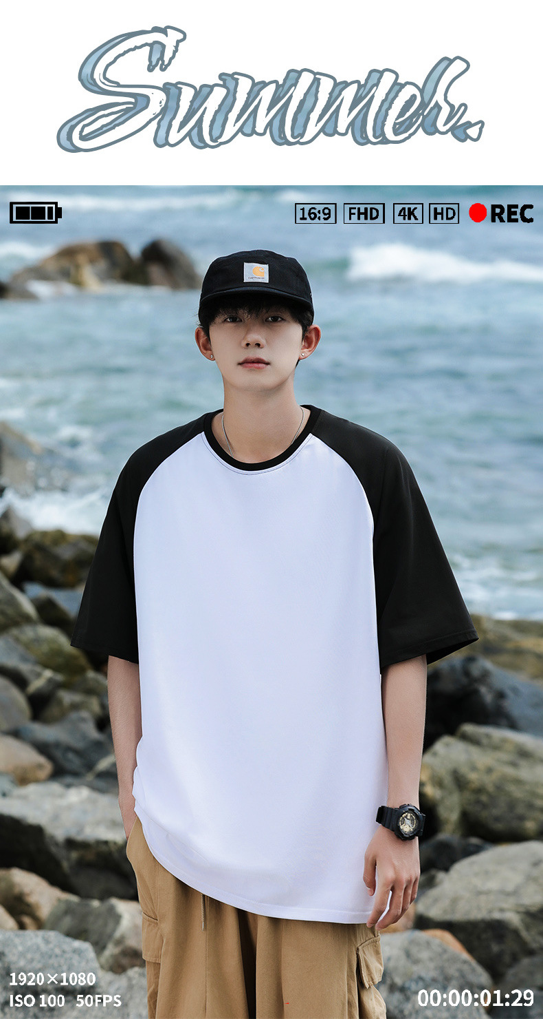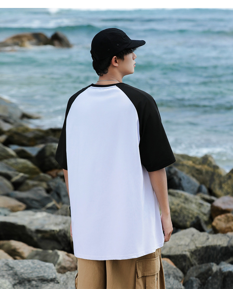 여름 트렌디 한 홍콩 스타일 남성 컬러 블록 라운드 넥 반팔 티셔츠 지방 남성 플러스 사이즈 대형 루즈 단색 티셔츠