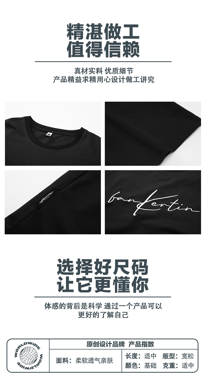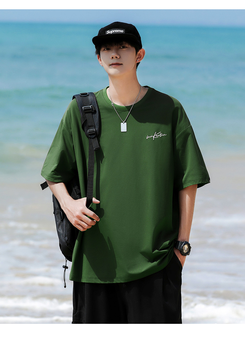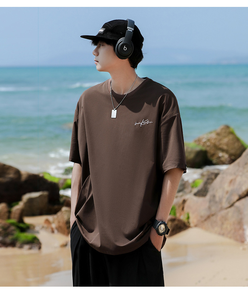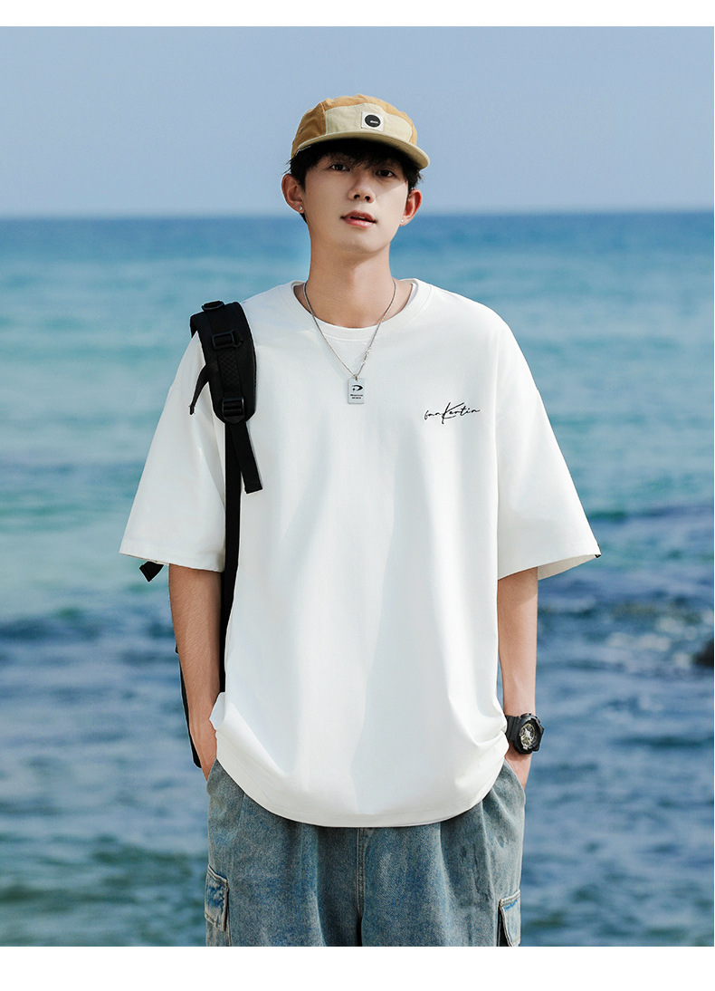 여름 트렌디 한 홍콩 스타일 남성 자수 크루 넥 반팔 티셔츠 통통한 남성 플러스 사이즈 대형 루즈 단색 티셔츠스토어 가기