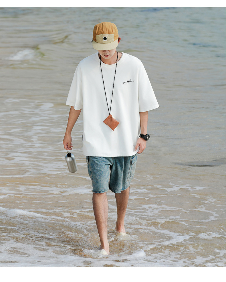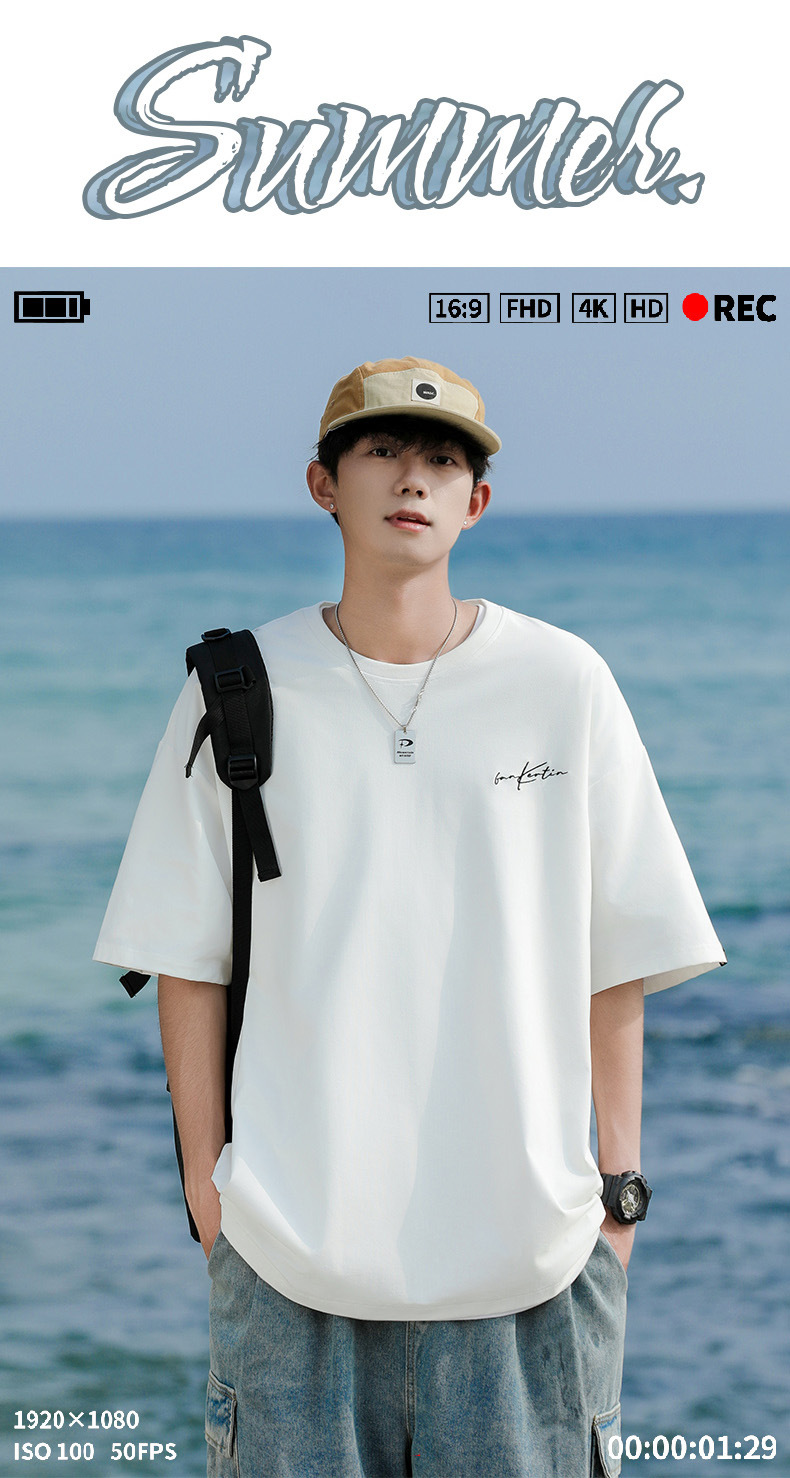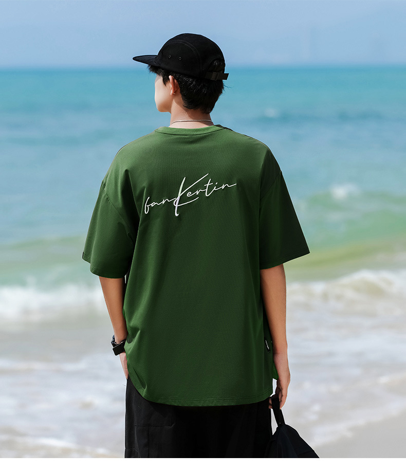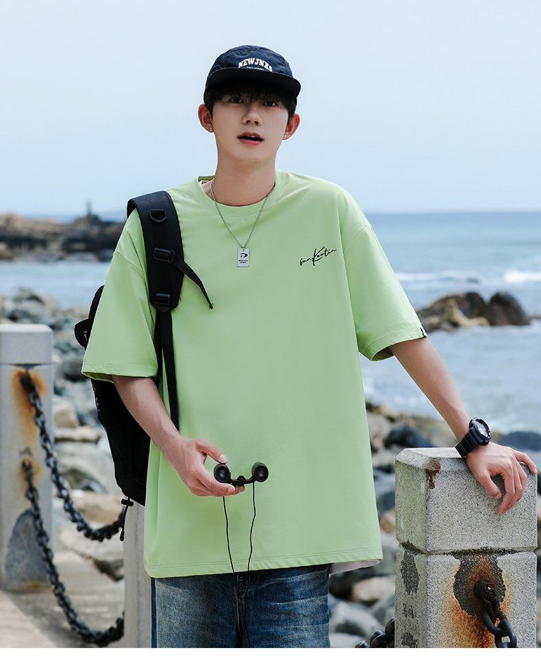 여름 트렌디 한 홍콩 스타일 남성 자수 크루 넥 반팔 티셔츠 통통한 남성 플러스 사이즈 대형 루즈 단색 티셔츠스토어 가기