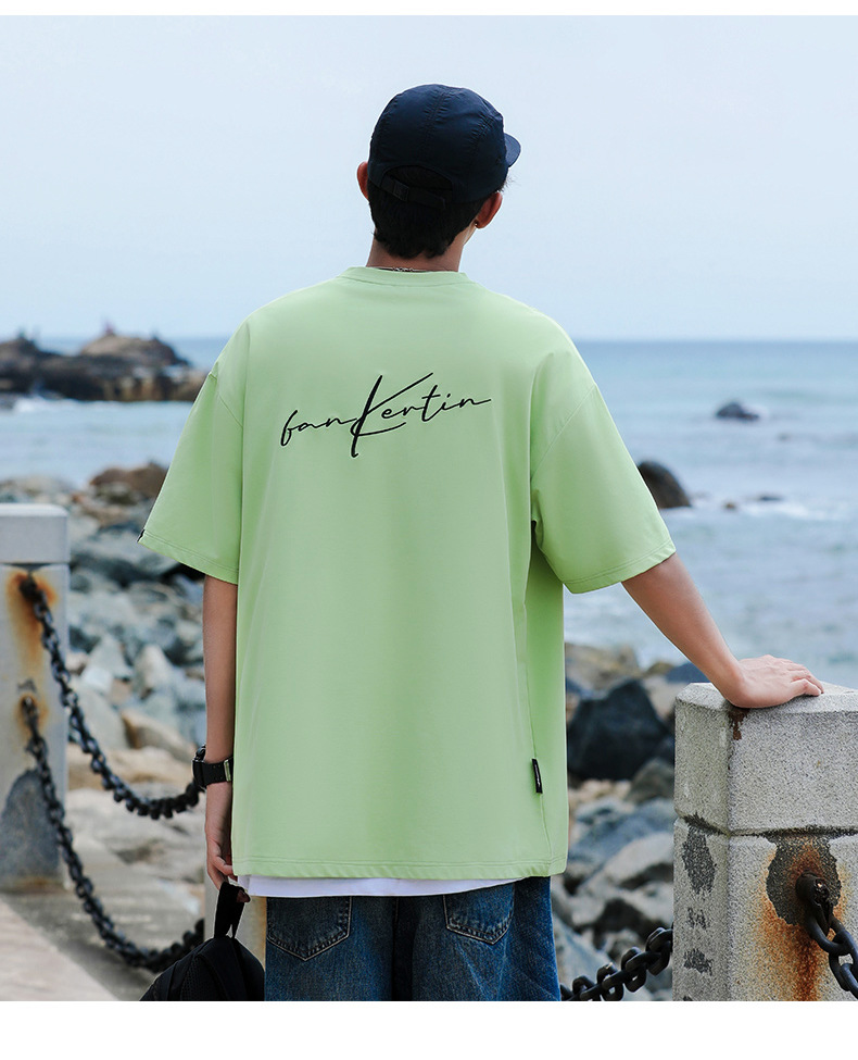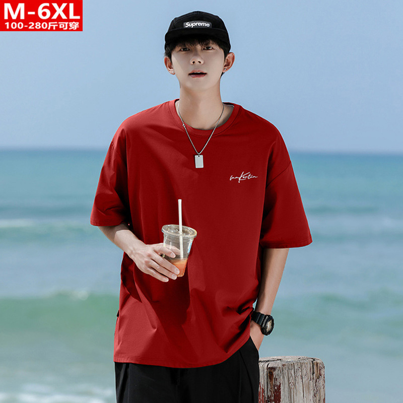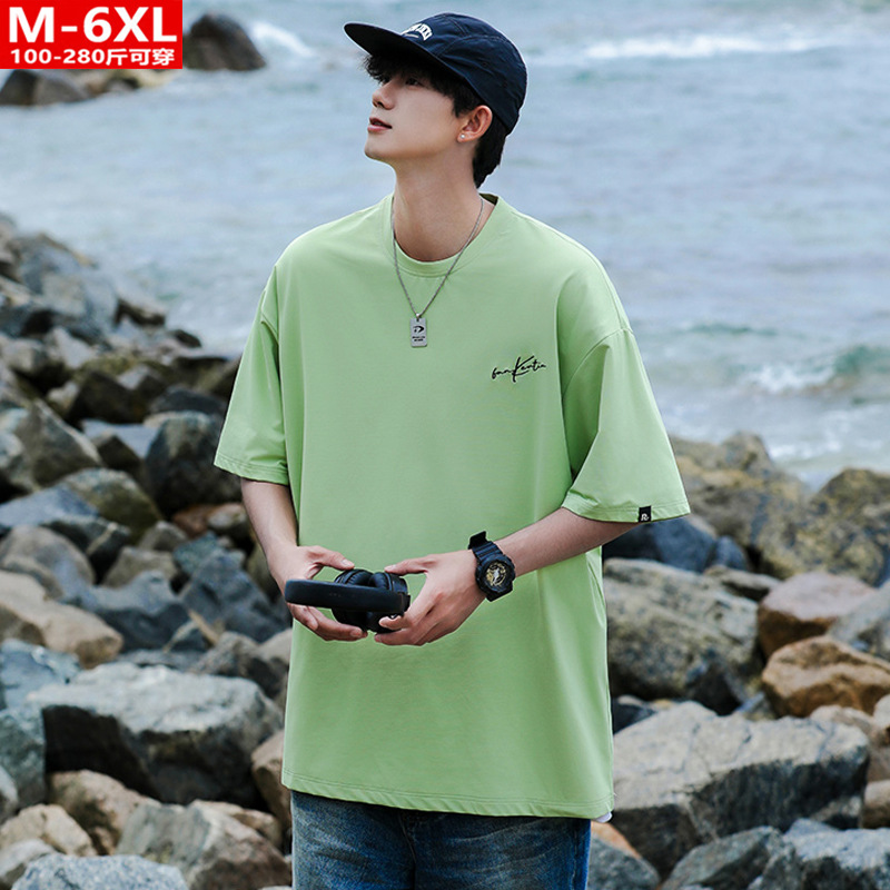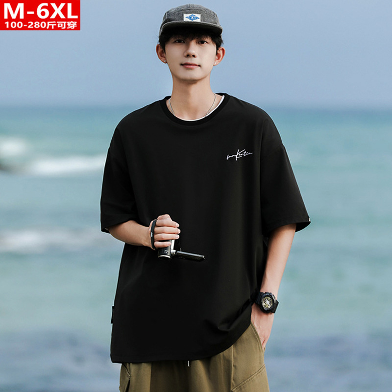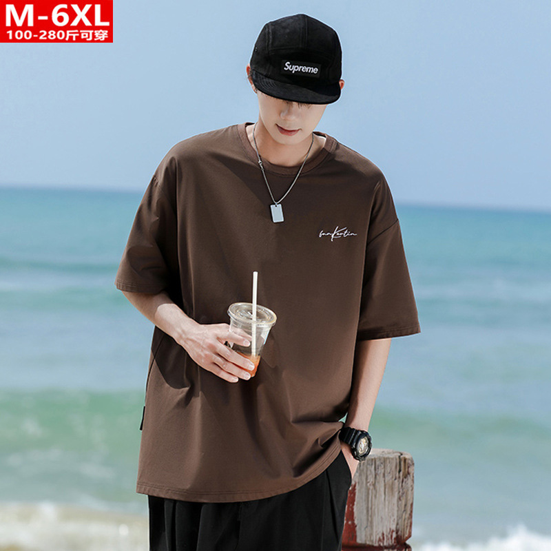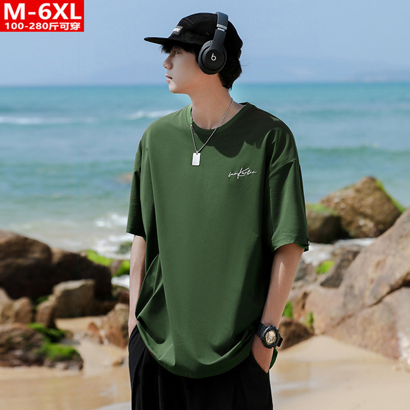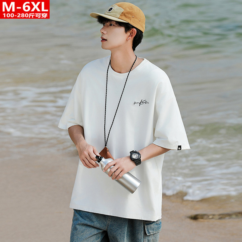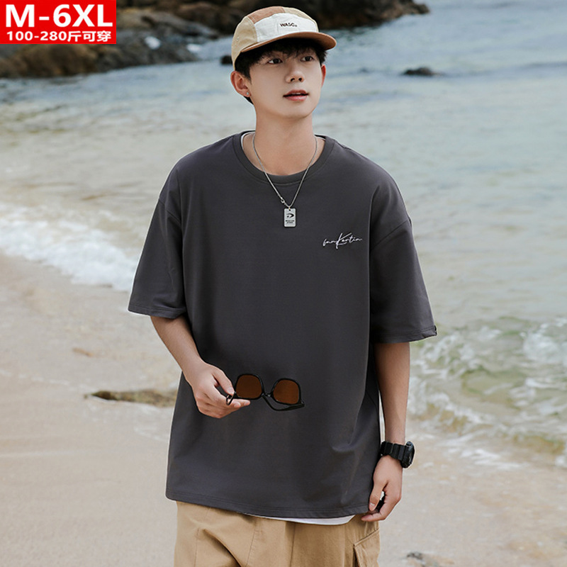 여름 트렌디 한 홍콩 스타일 남성 자수 크루 넥 반팔 티셔츠 통통한 남성 플러스 사이즈 대형 루즈 단색 티셔츠
