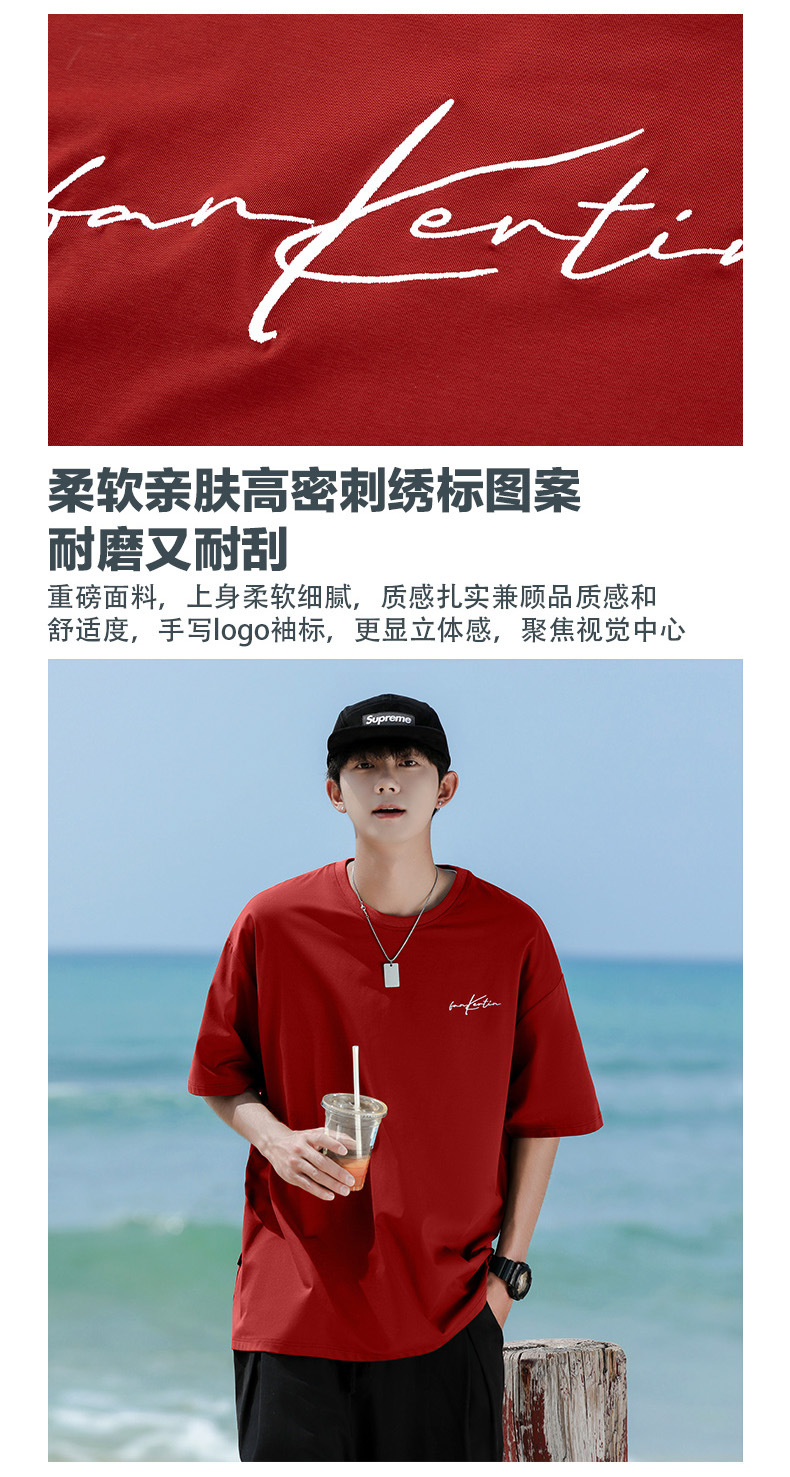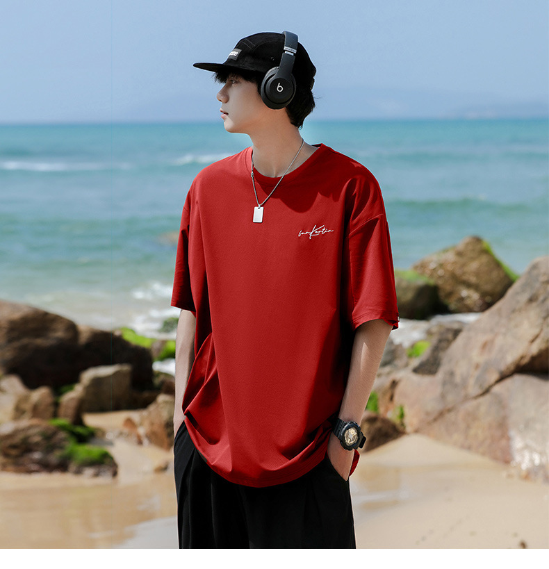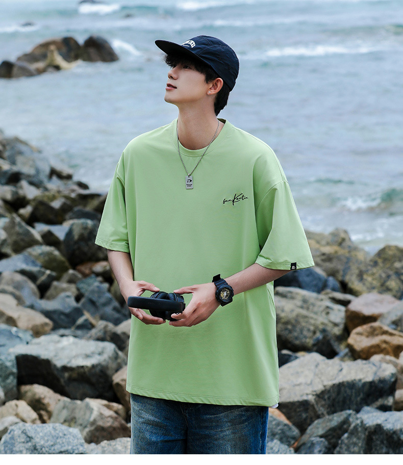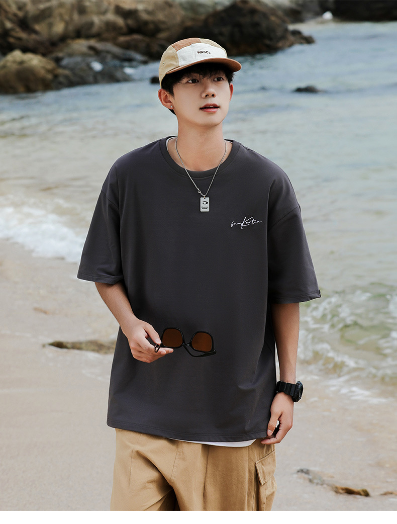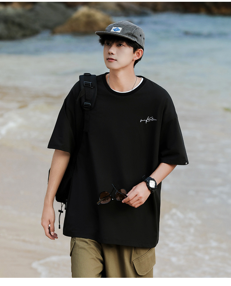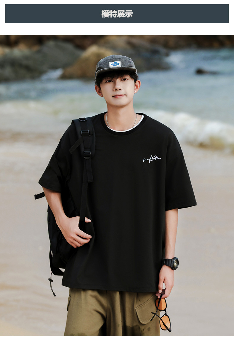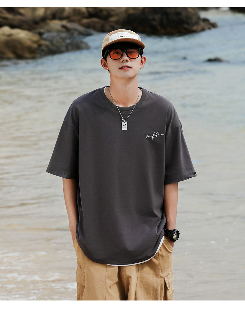 여름 트렌디 한 홍콩 스타일 남성 자수 크루 넥 반팔 티셔츠 통통한 남성 플러스 사이즈 대형 루즈 단색 티셔츠