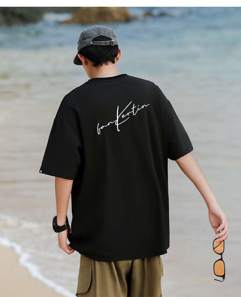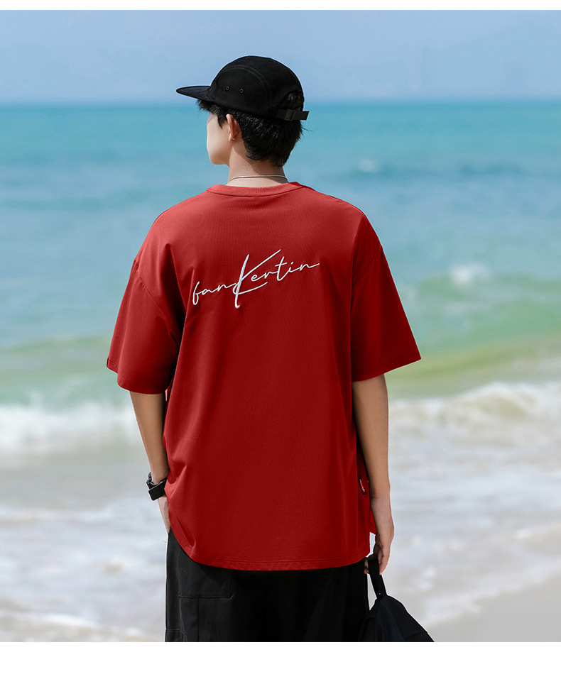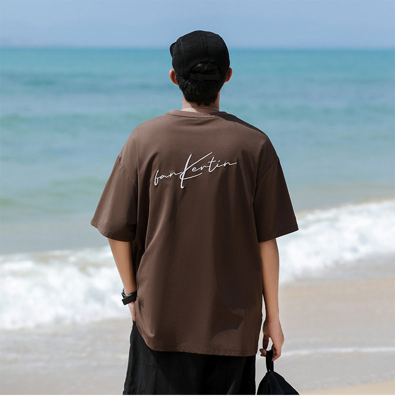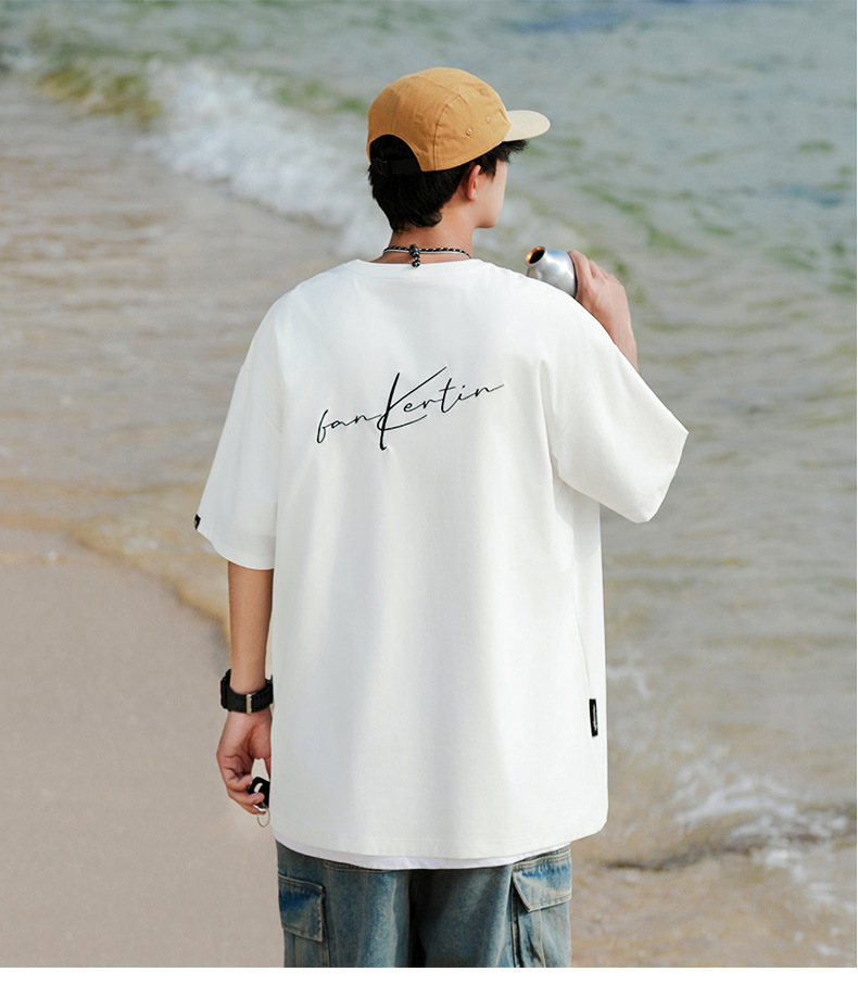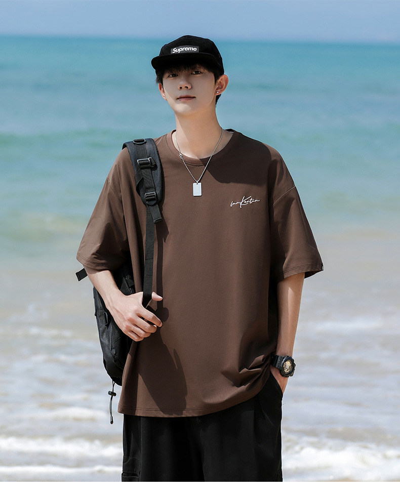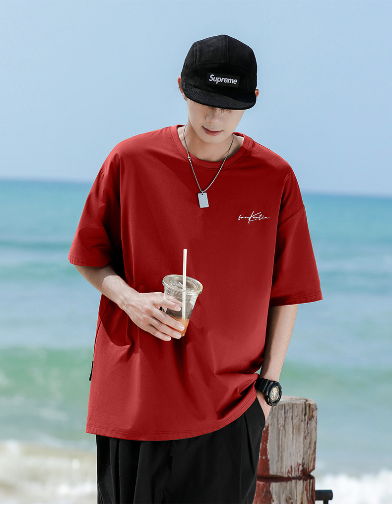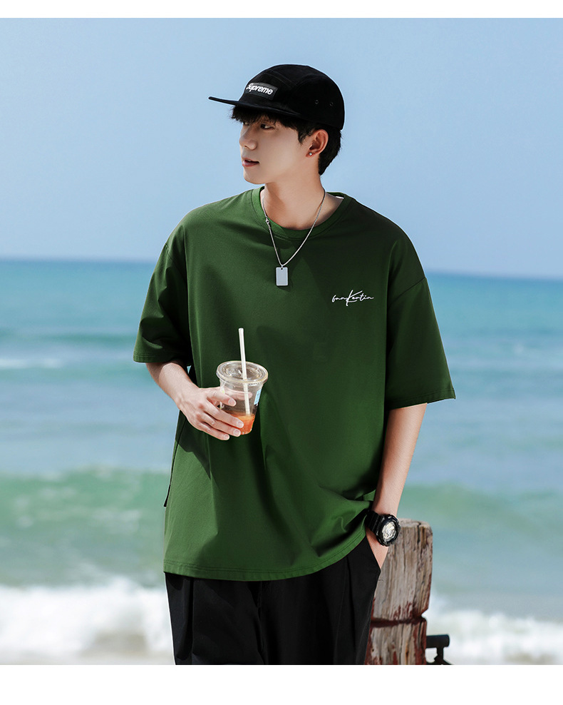 여름 트렌디 한 홍콩 스타일 남성 자수 크루 넥 반팔 티셔츠 통통한 남성 플러스 사이즈 대형 루즈 단색 티셔츠