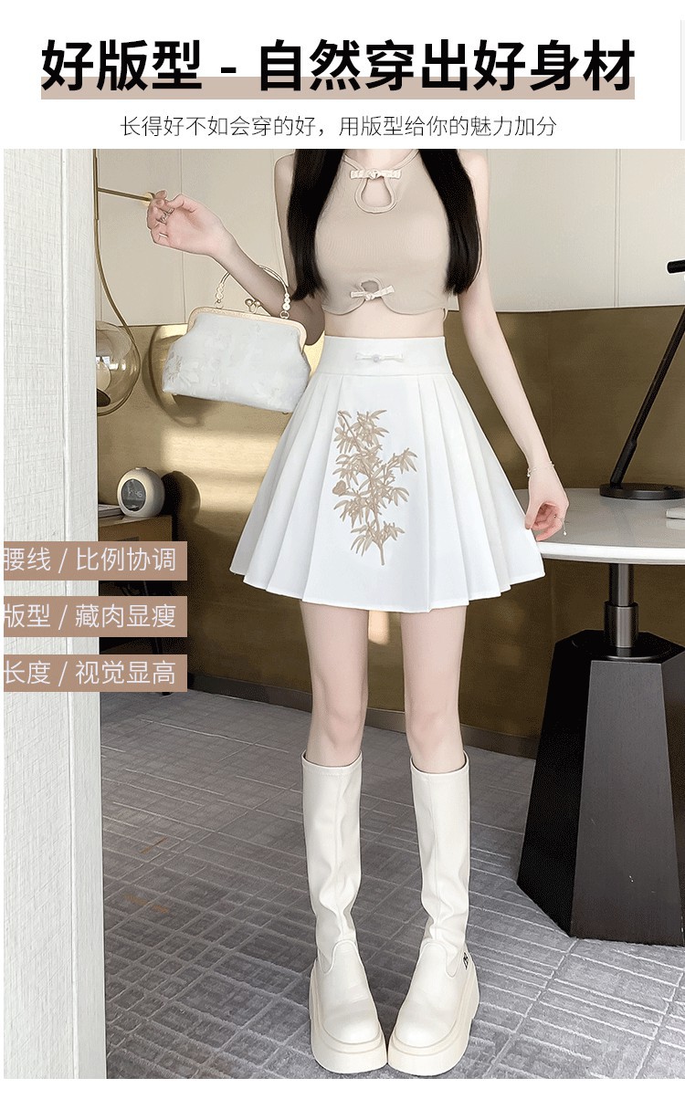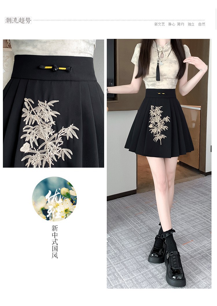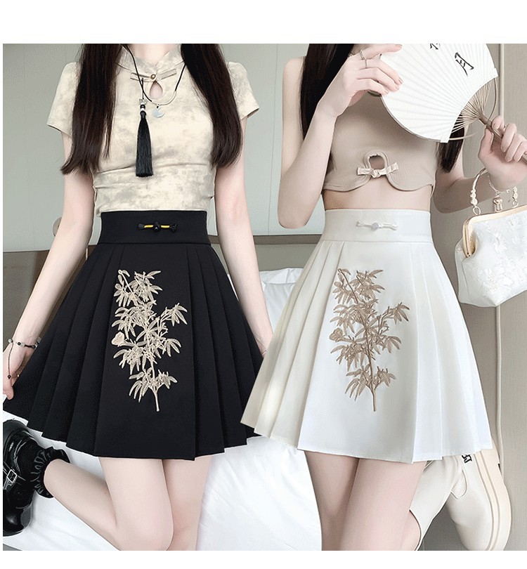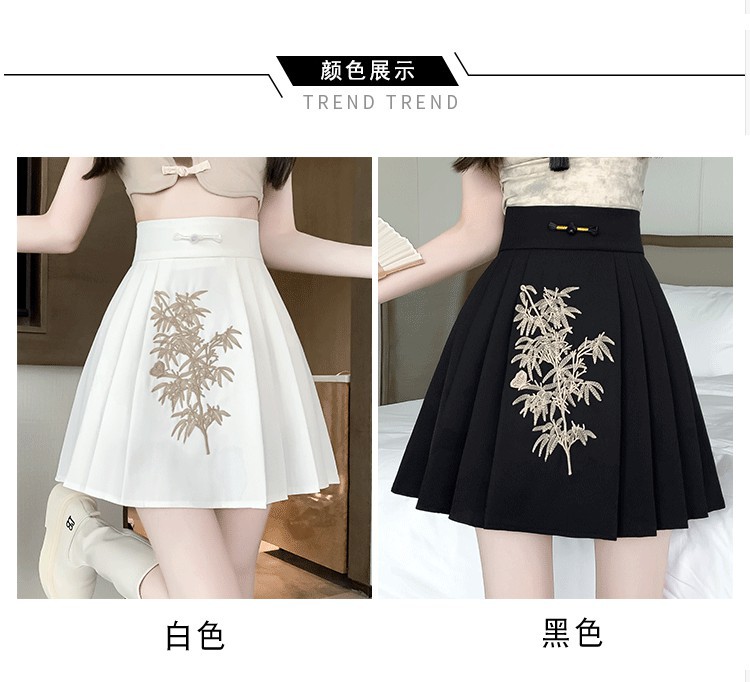 실제 촬영 비디오 3 표준 2024 새로운 중국 스타일 자수 스커트 여성의 높은 허리 엉덩이 커버 얇은 주름 A 라인 스커트스토어 가기