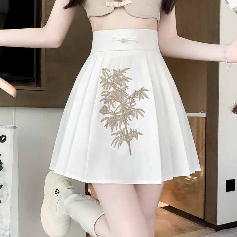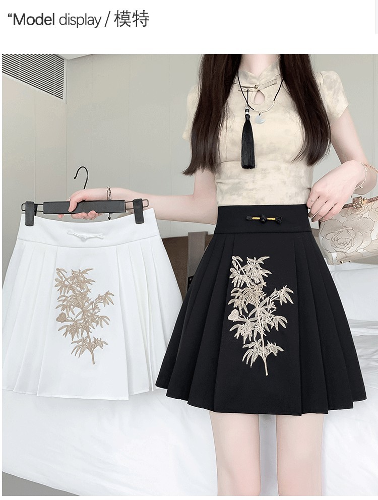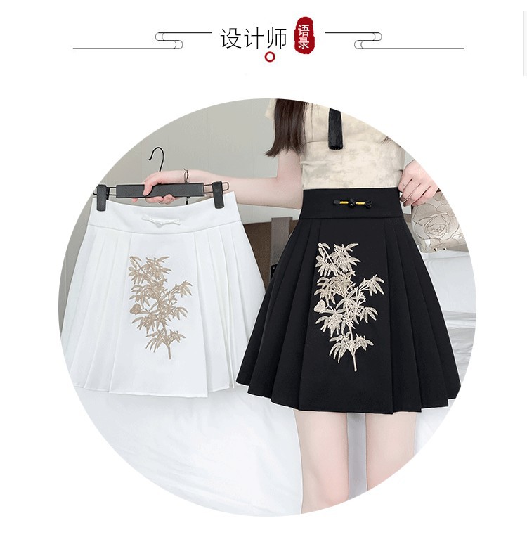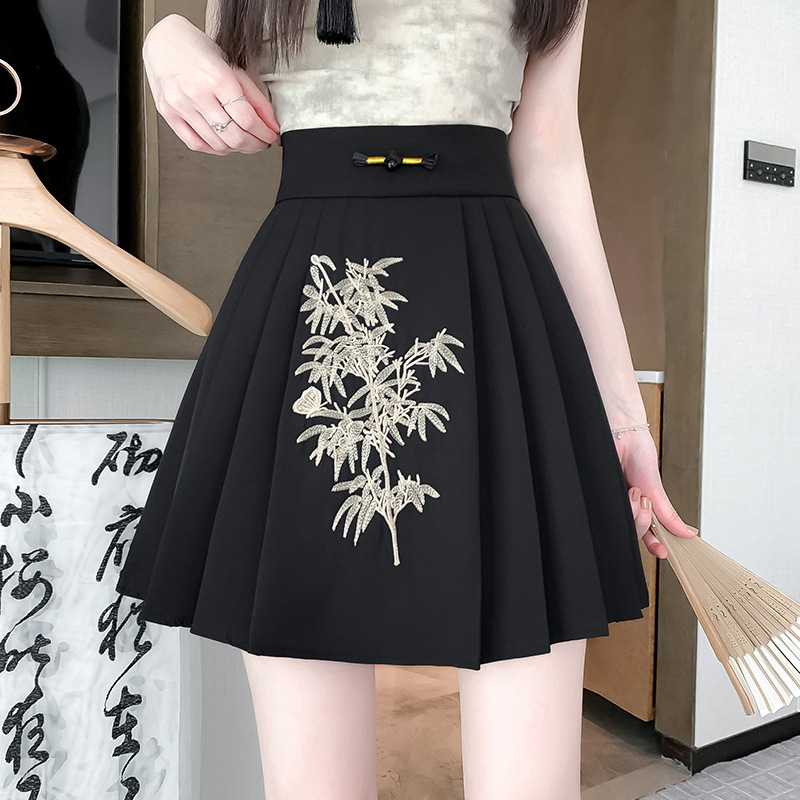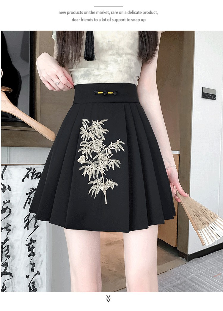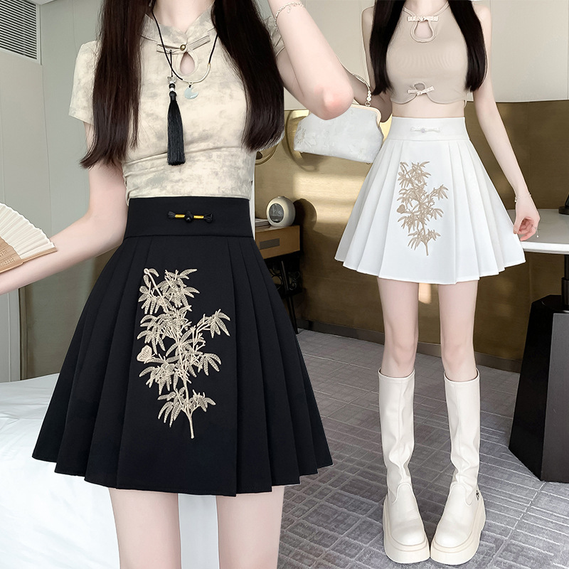 실제 촬영 비디오 3 표준 2024 새로운 중국 스타일 자수 스커트 여성의 높은 허리 엉덩이 커버 얇은 주름 A 라인 스커트