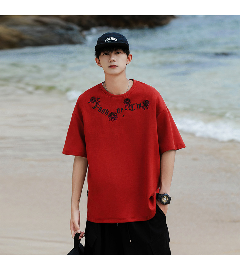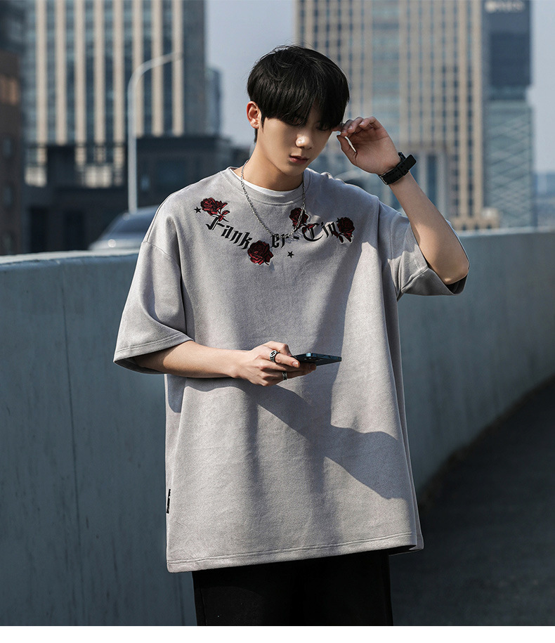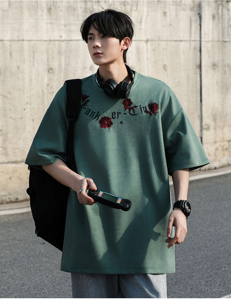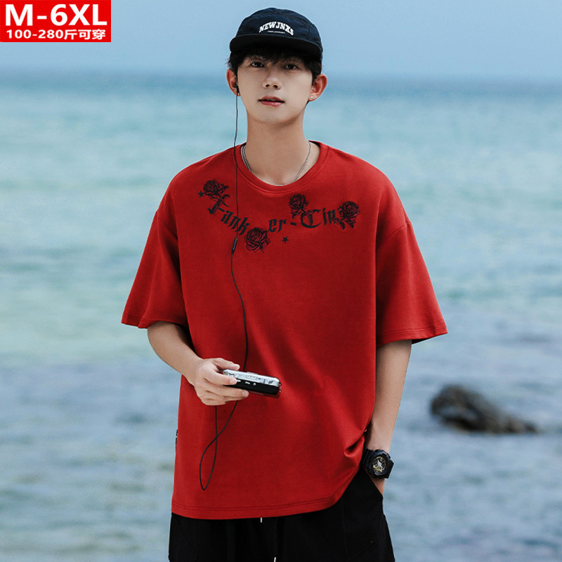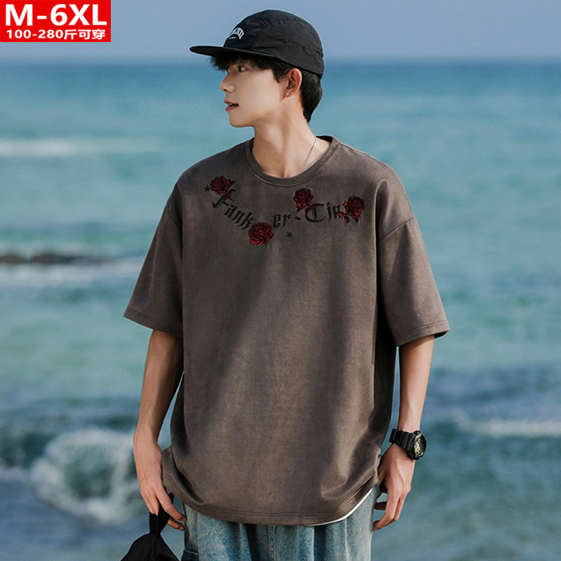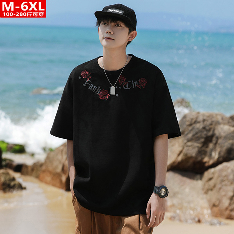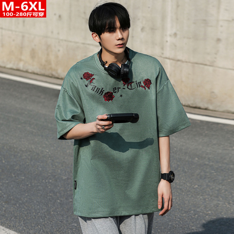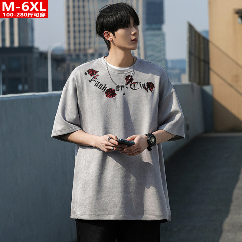 여름 트렌디 한 홍콩 스타일 남성 자수 크루 넥 반팔 티셔츠 통통한 남성 플러스 사이즈 대형 루즈 단색 티셔츠