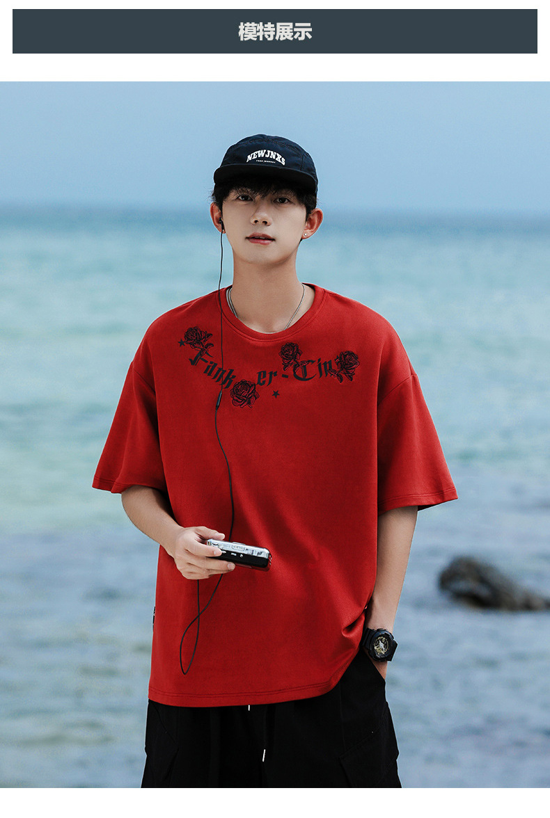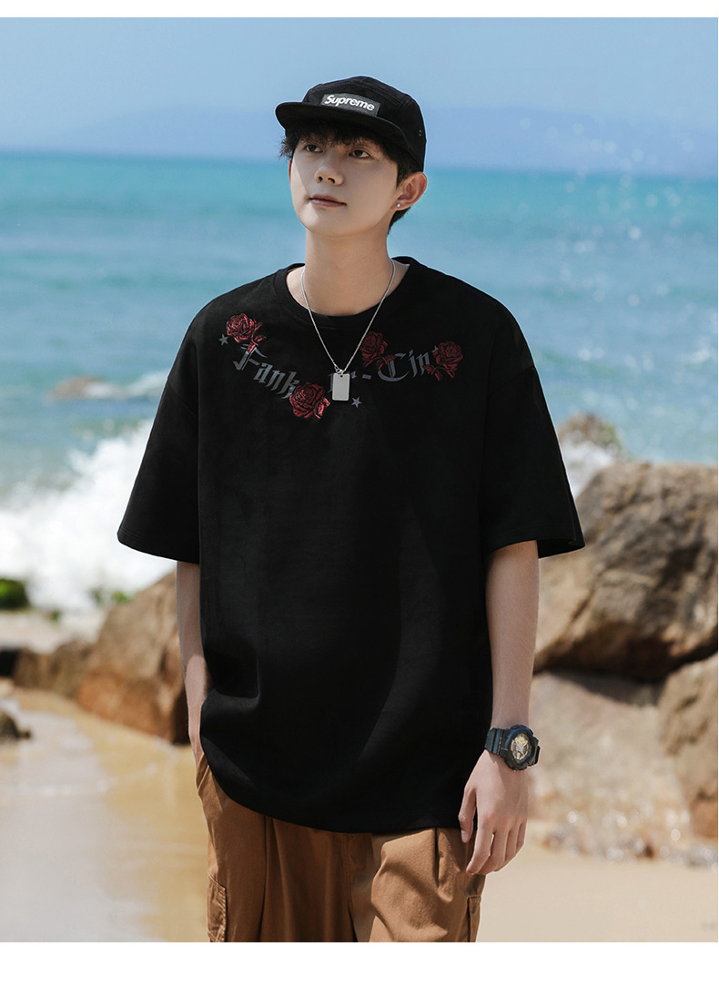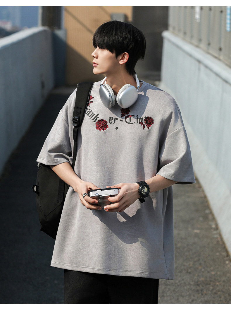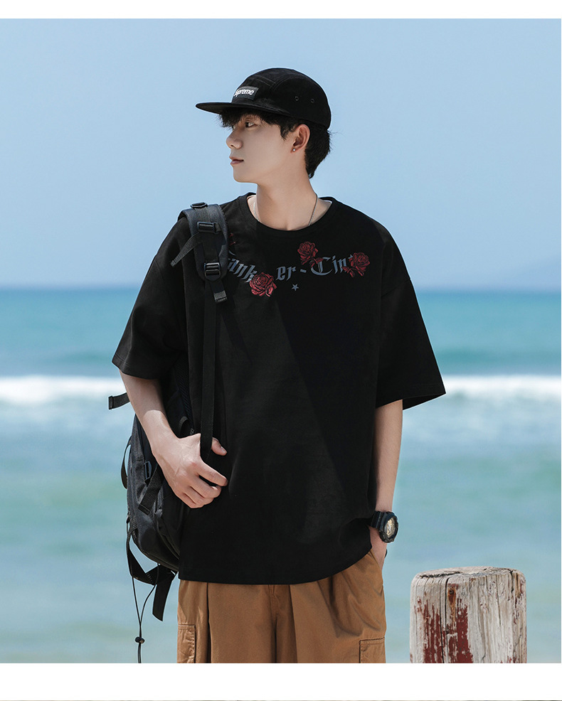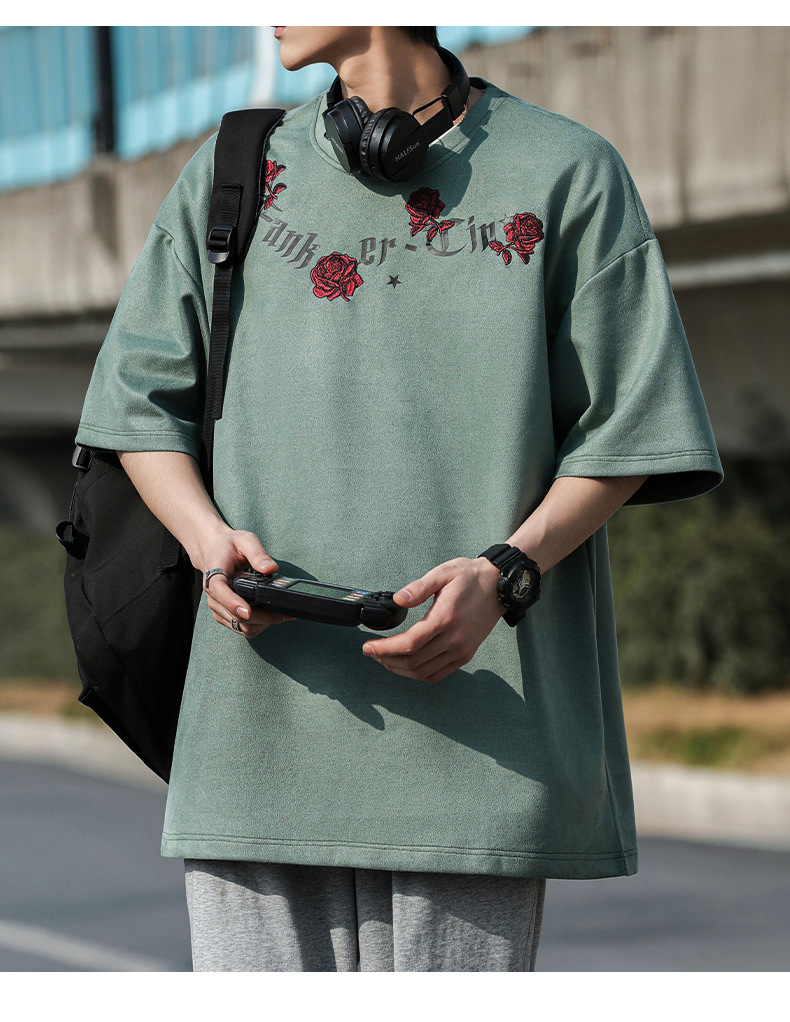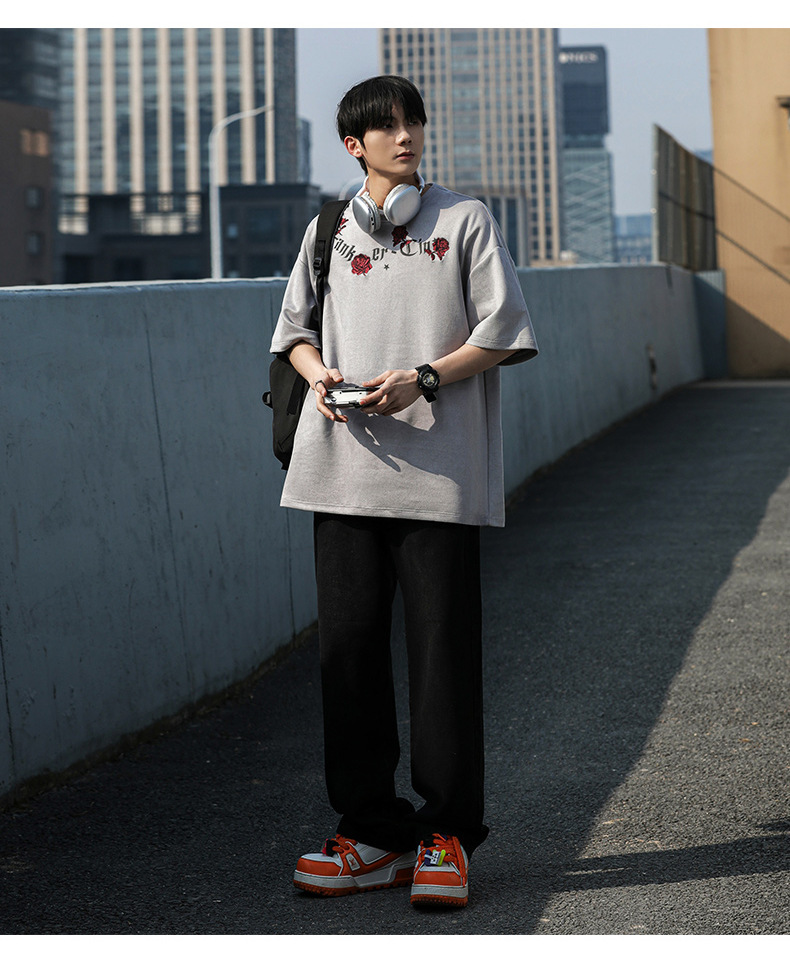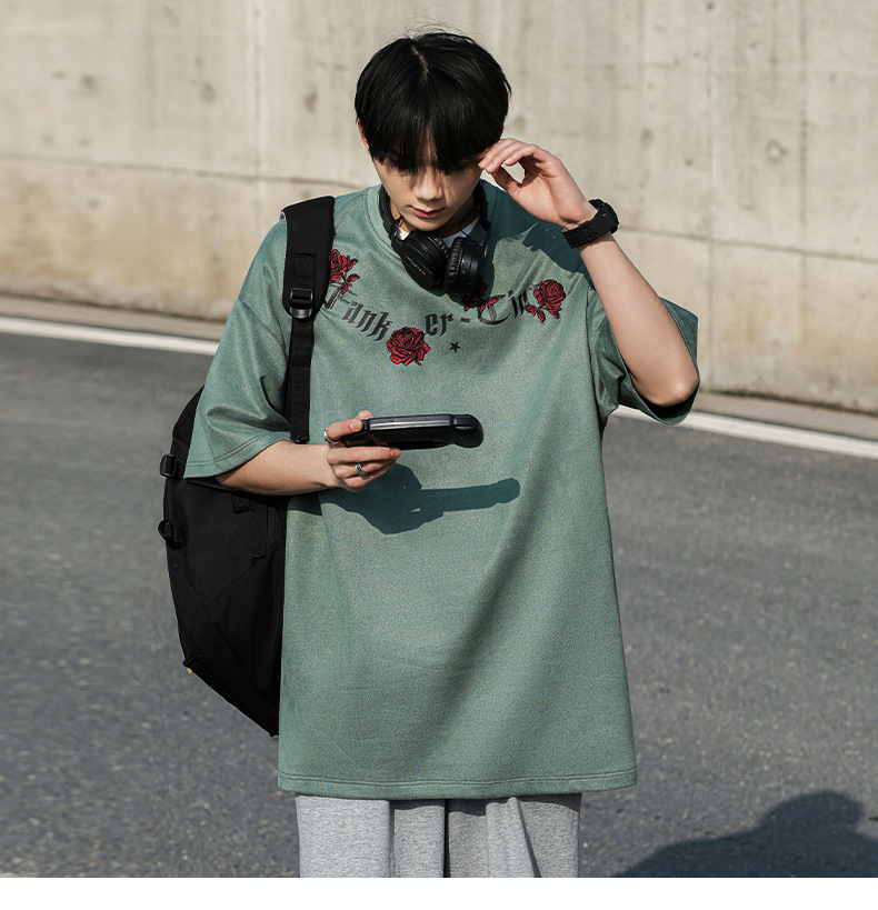 여름 트렌디 한 홍콩 스타일 남성 자수 크루 넥 반팔 티셔츠 통통한 남성 플러스 사이즈 대형 루즈 단색 티셔츠