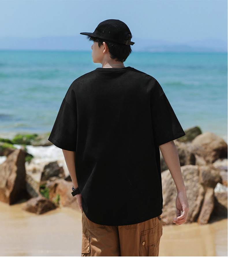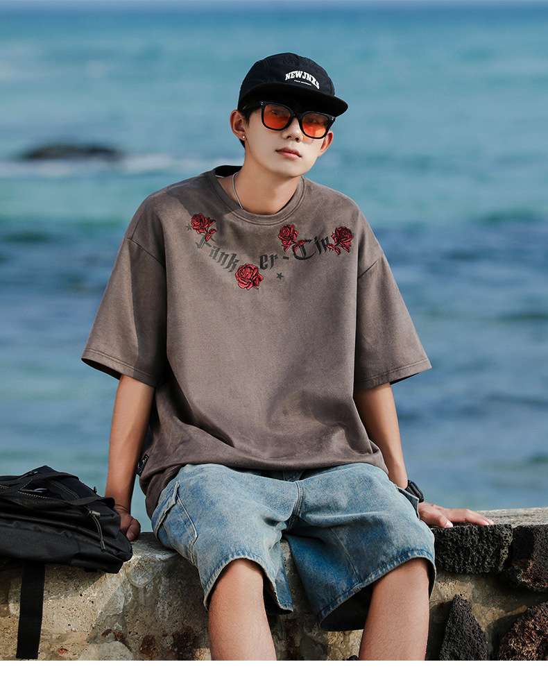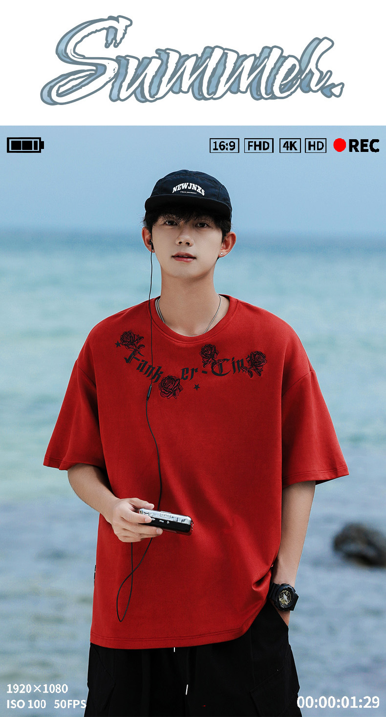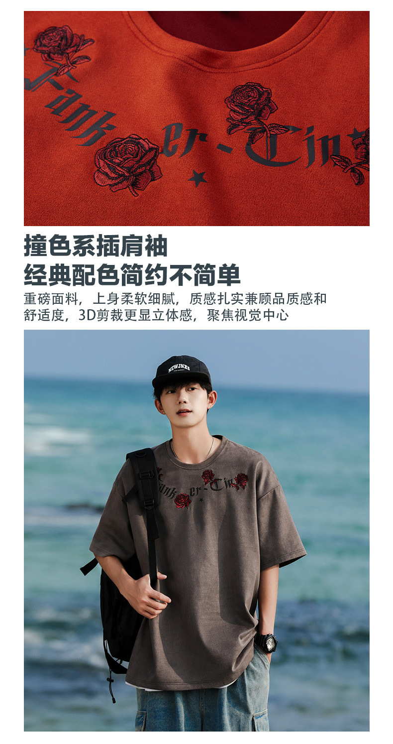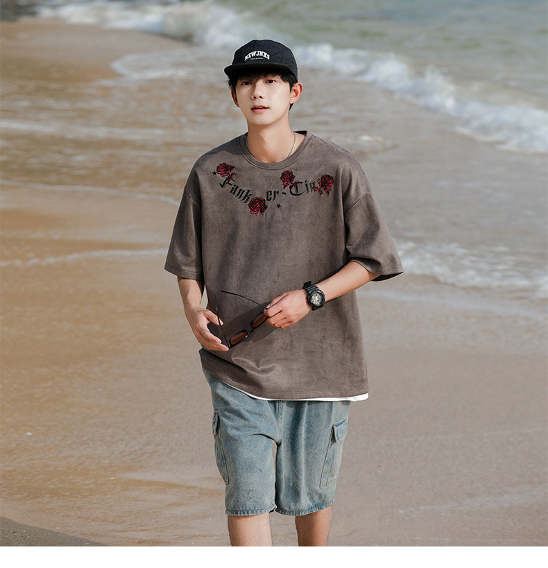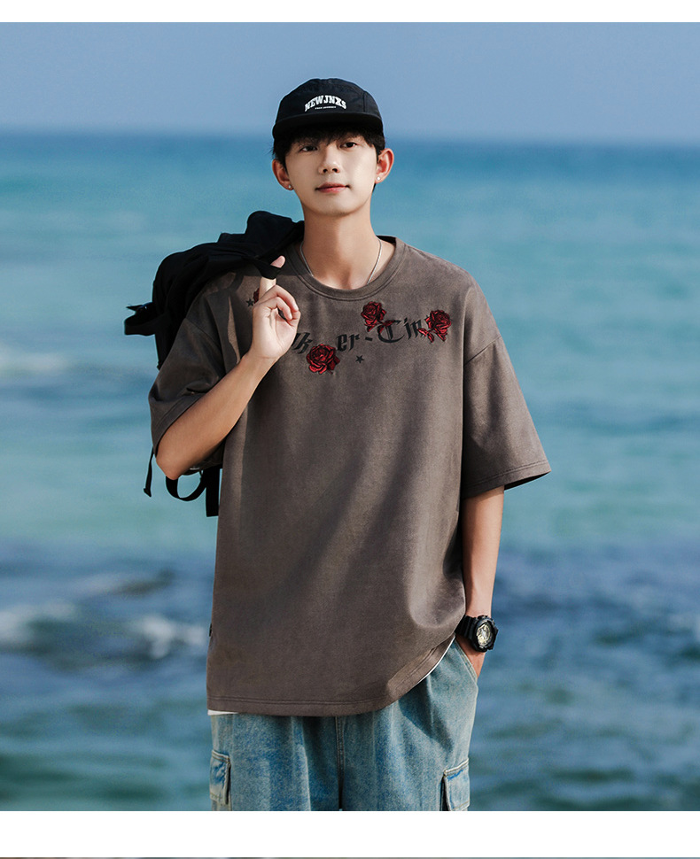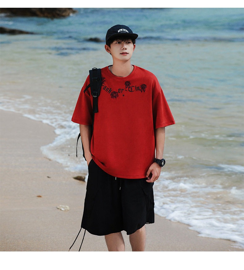 여름 트렌디 한 홍콩 스타일 남성 자수 크루 넥 반팔 티셔츠 통통한 남성 플러스 사이즈 대형 루즈 단색 티셔츠