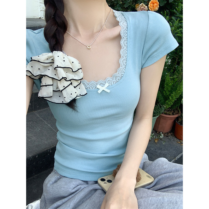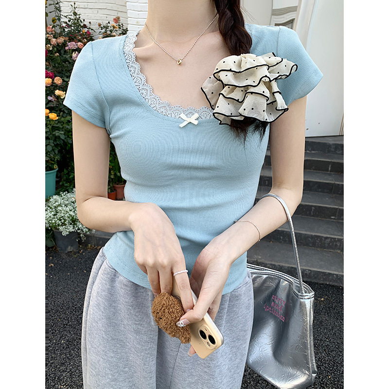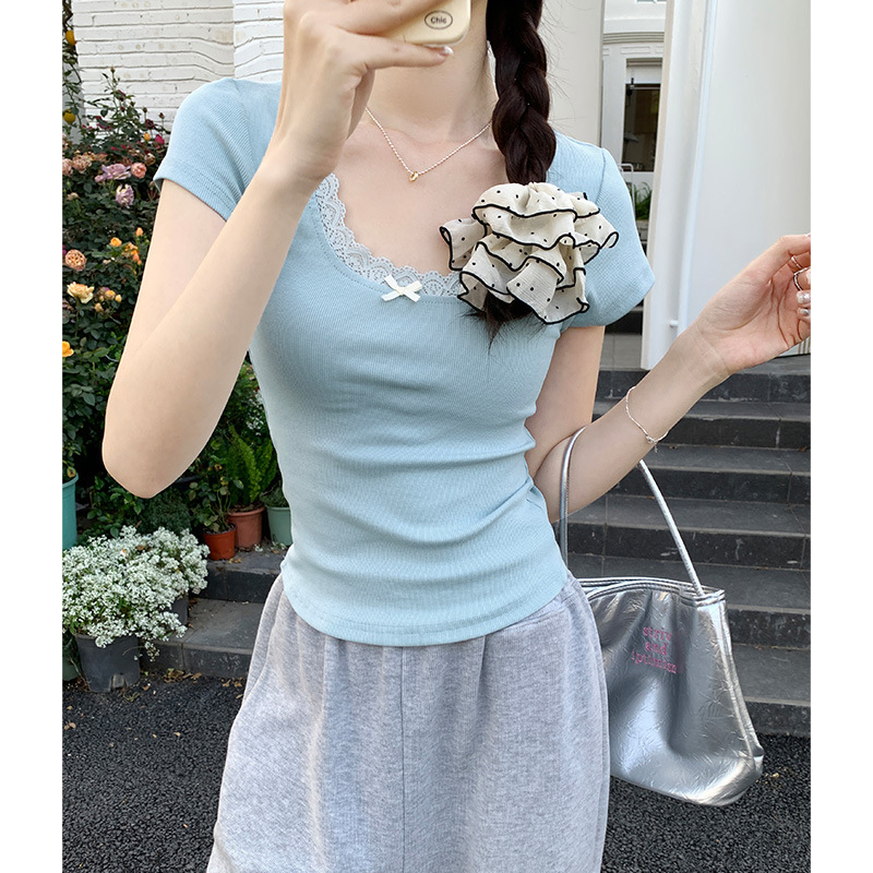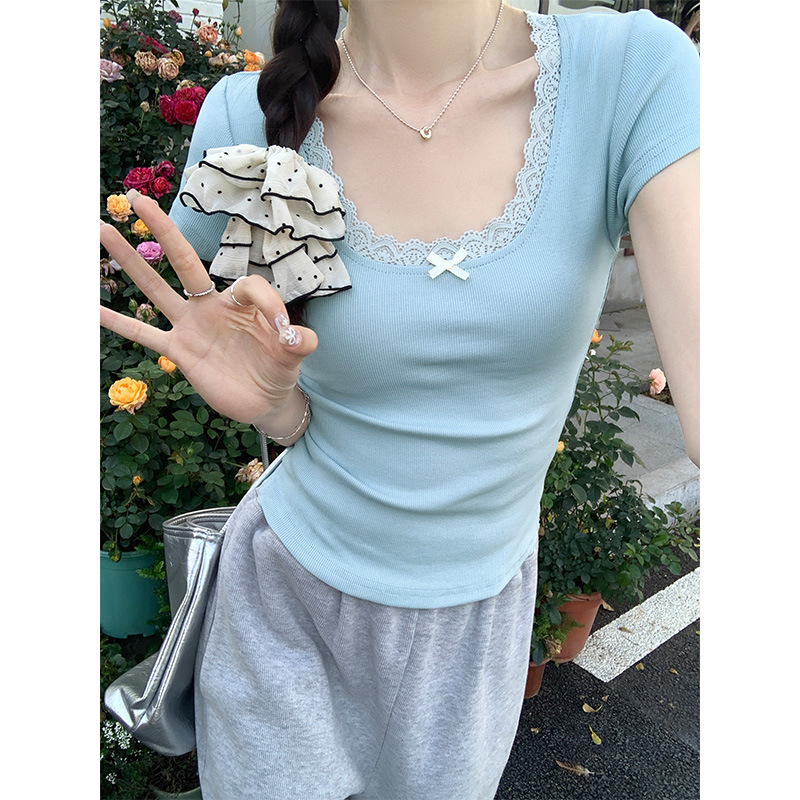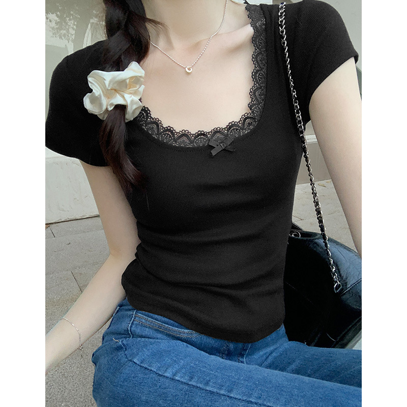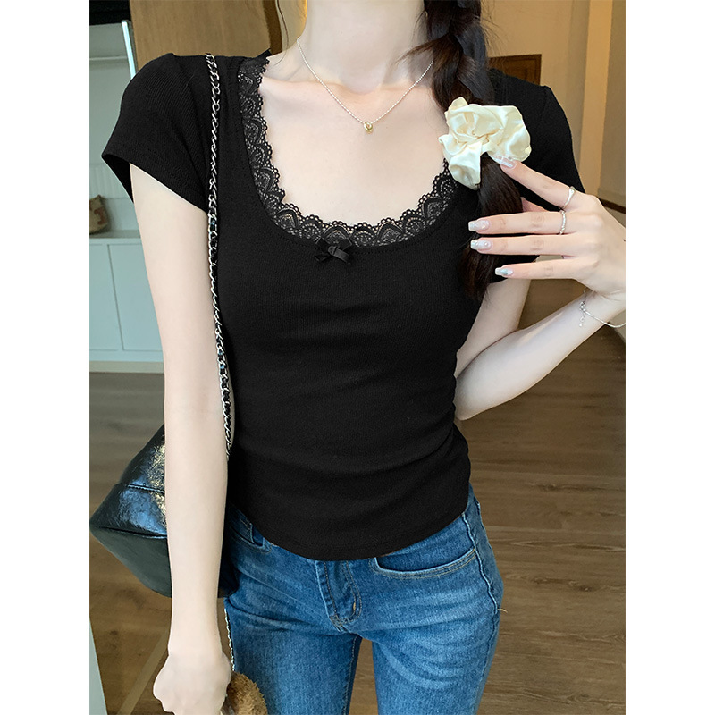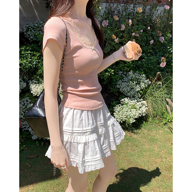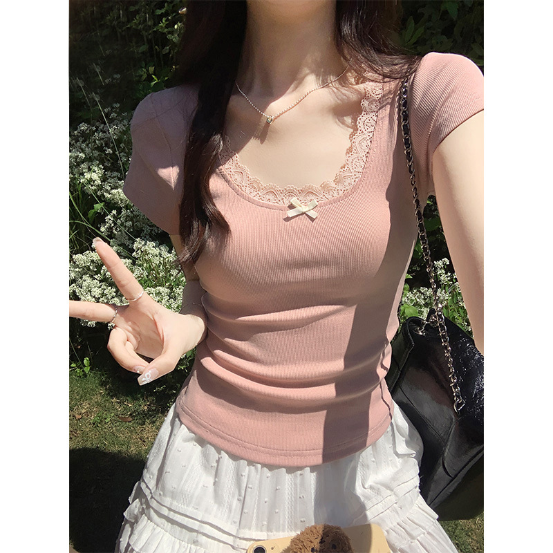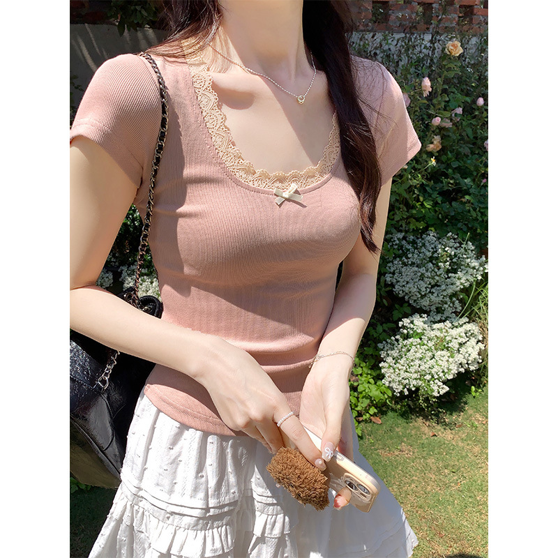 리얼 샷 퓨어 U 넥 핑크 레이스 반팔 티셔츠 여성용 2024 여름 쇼트 탑스토어 가기
