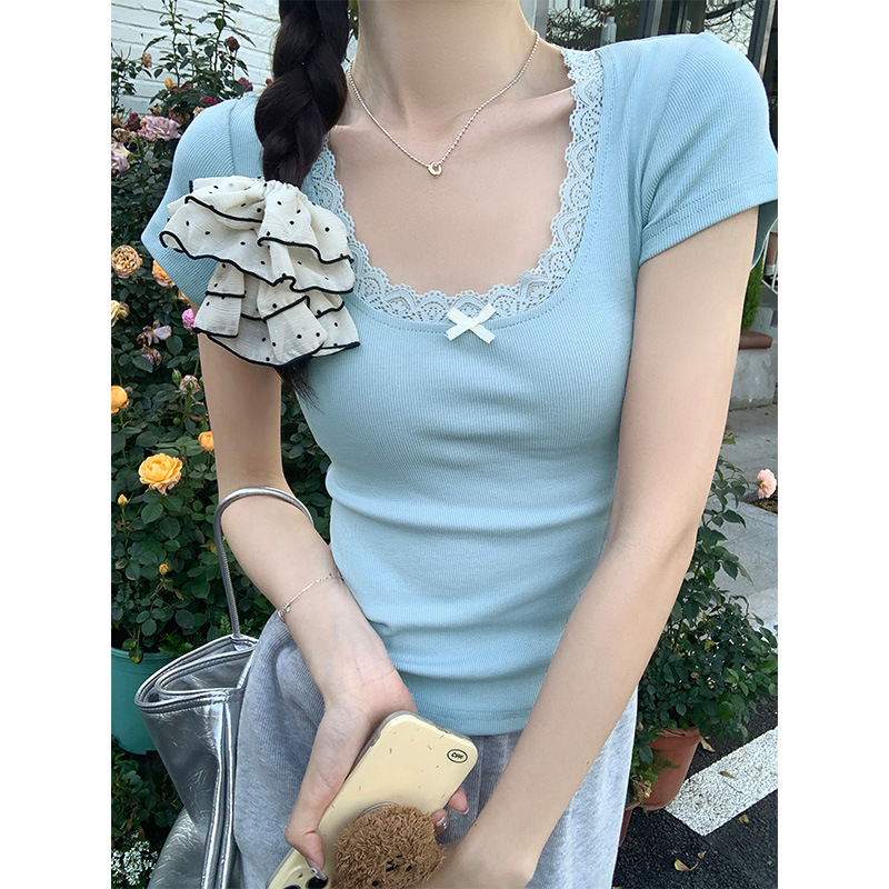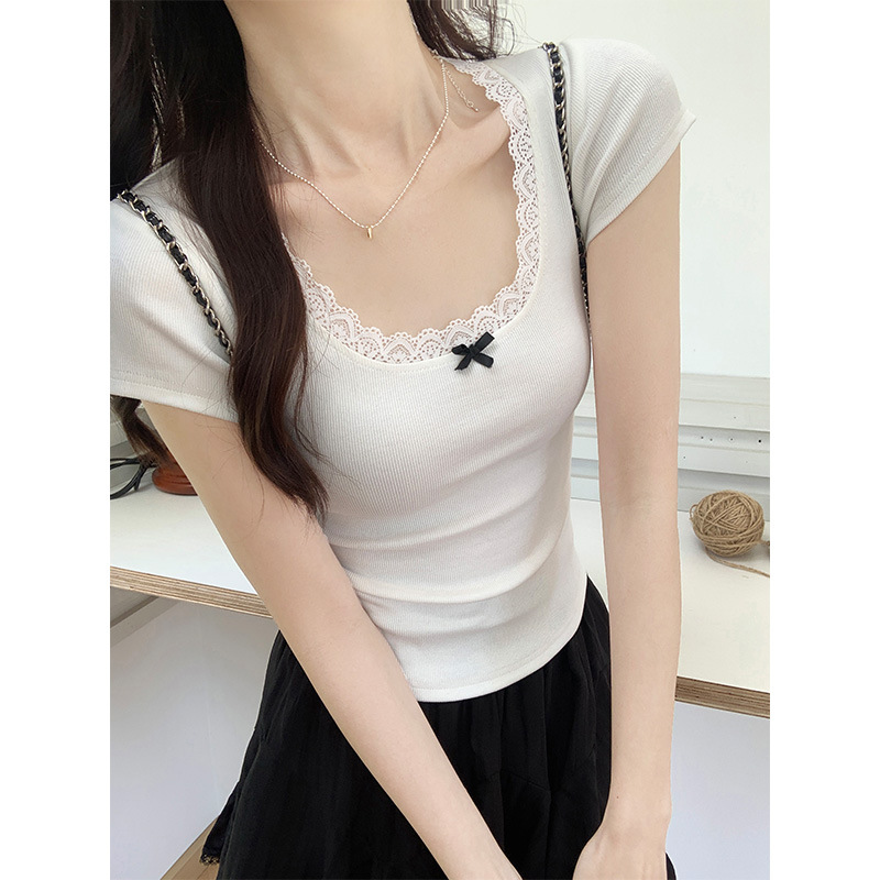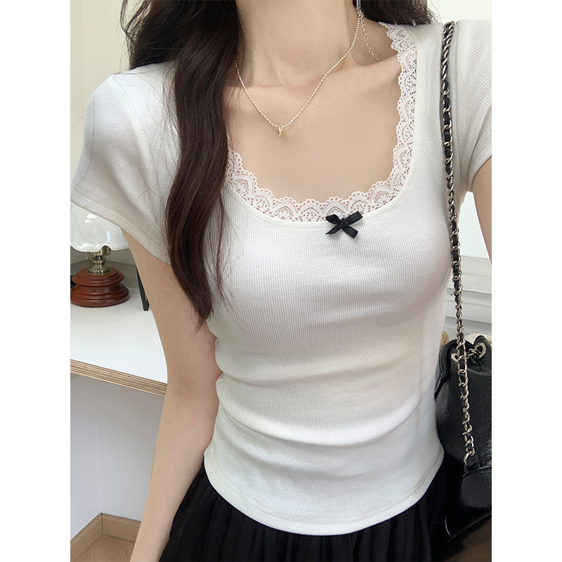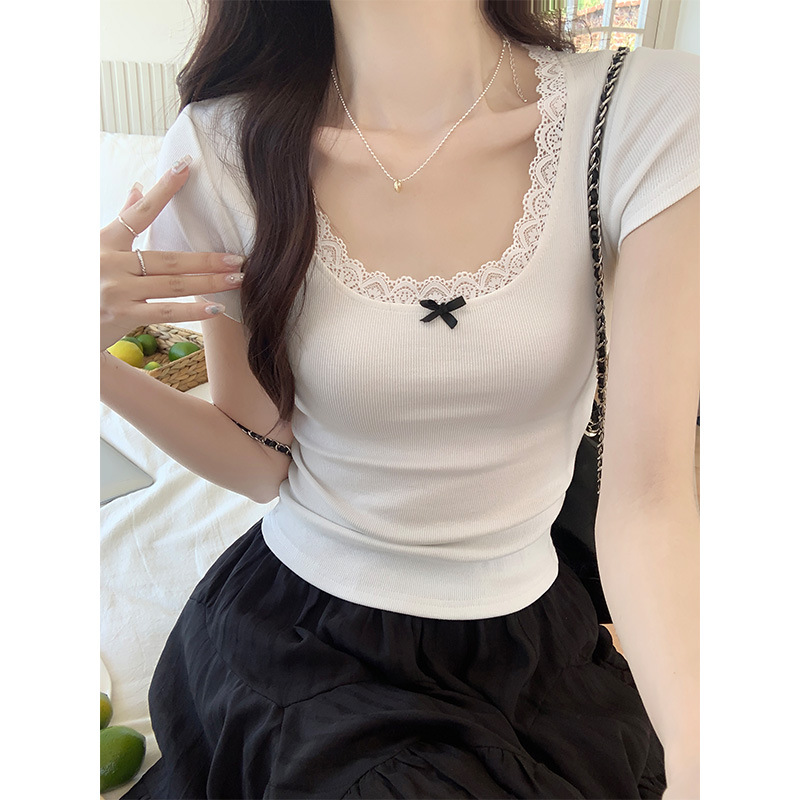 实拍实价纯欲u领粉色花边蕾丝短袖T恤女夏季蝴蝶结内搭短款上衣