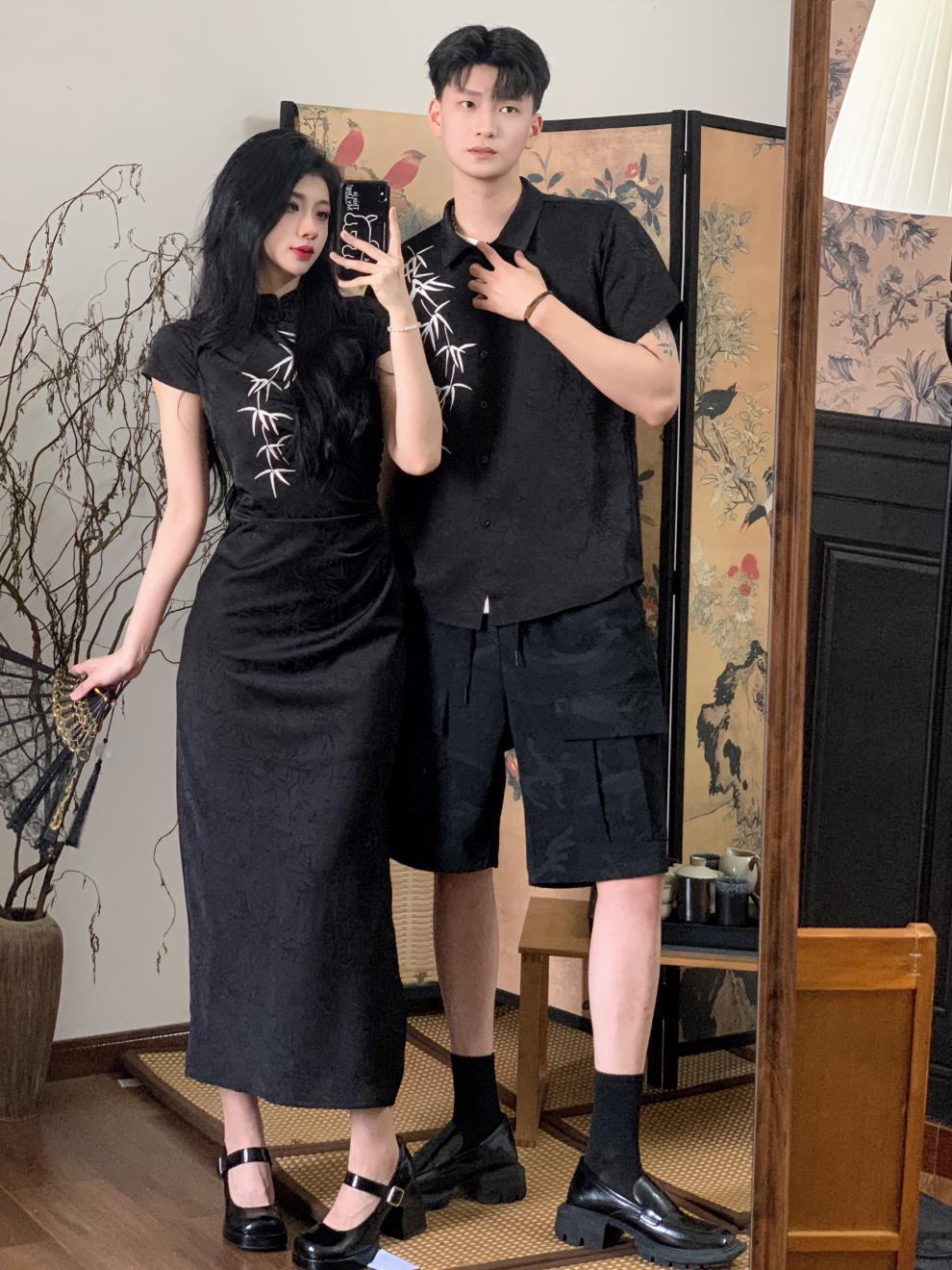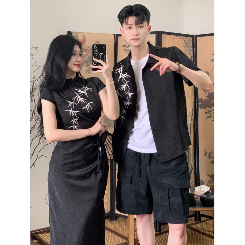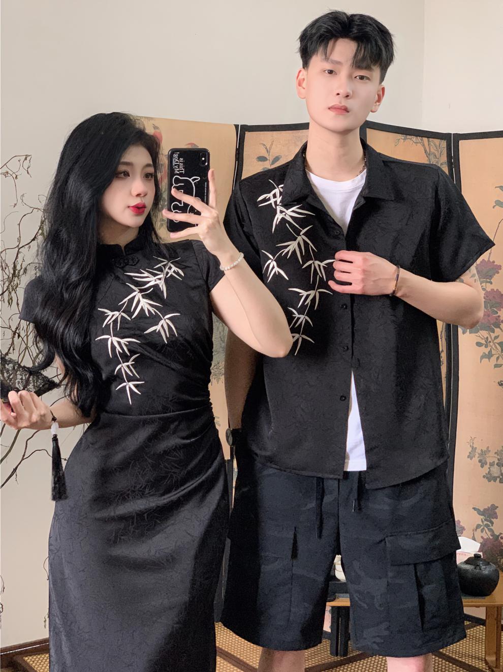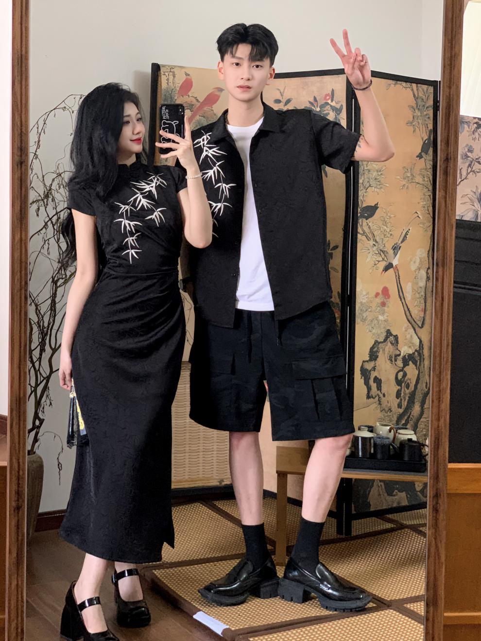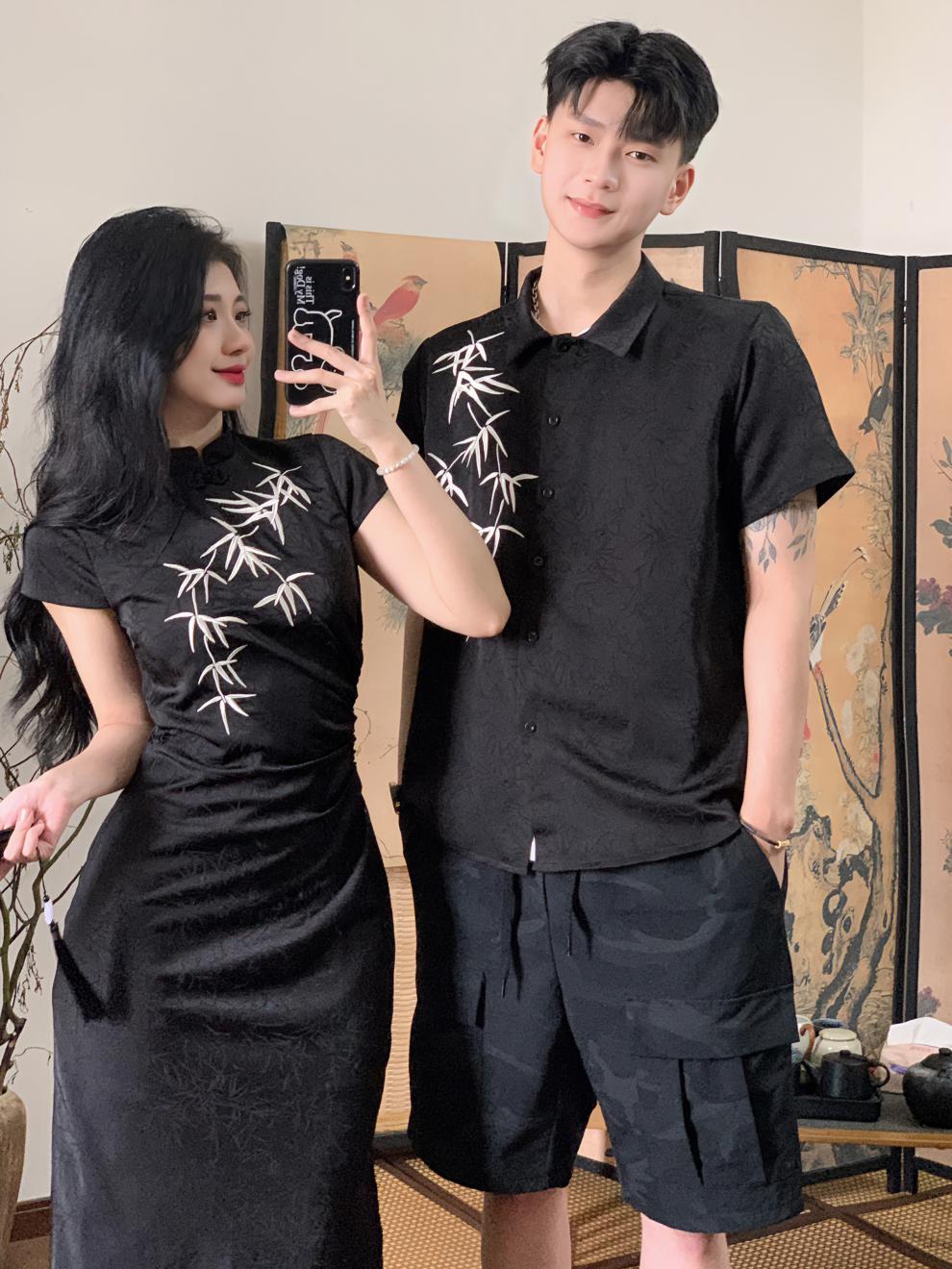2024 년 여름 새 커플 옷 반팔 인쇄 청삼 국가 스타일 커플 옷 남성 국가 스타일 셔츠스토어 가기