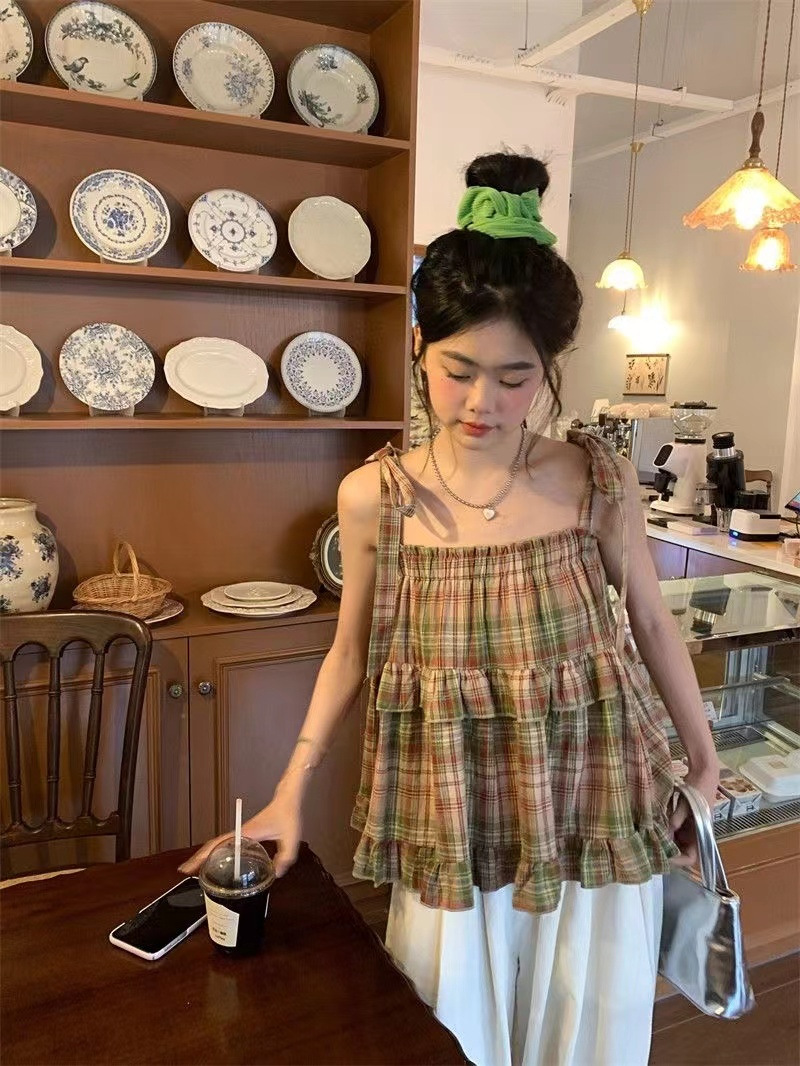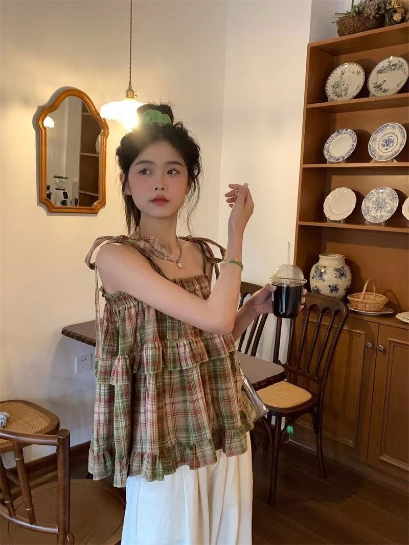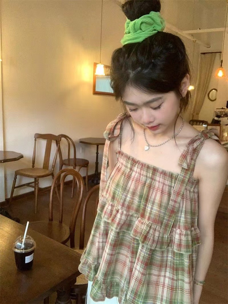 달콤한 소녀 셔츠 레트로 레이스 업 스퀘어 칼라 조끼 신선한 스타일 격자 무늬 인형 셔츠 짧은 달콤한 쿨 슬링 탑