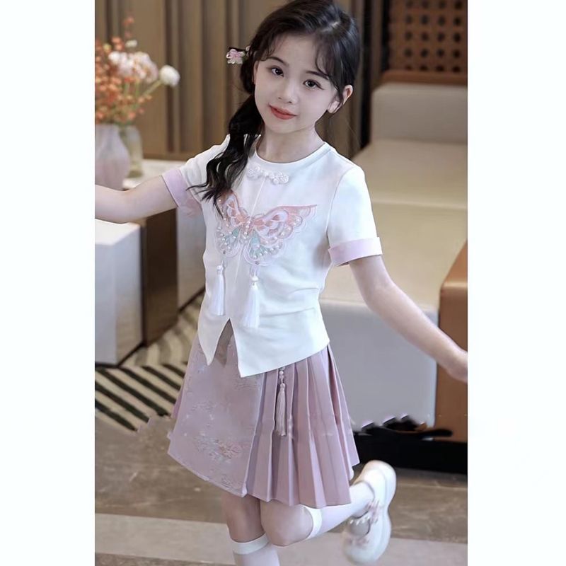 소녀 말 얼굴 치마 세트 2024 년 여름 새로운 어린이 국가 스타일 반팔 자수 티셔츠 여름 중국식 투피스 세트