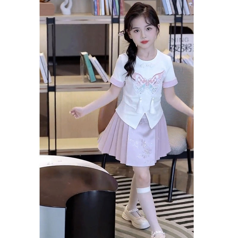 소녀 말 얼굴 치마 세트 2024 년 여름 새로운 어린이 국가 스타일 반팔 자수 티셔츠 여름 중국식 투피스 세트스토어 가기