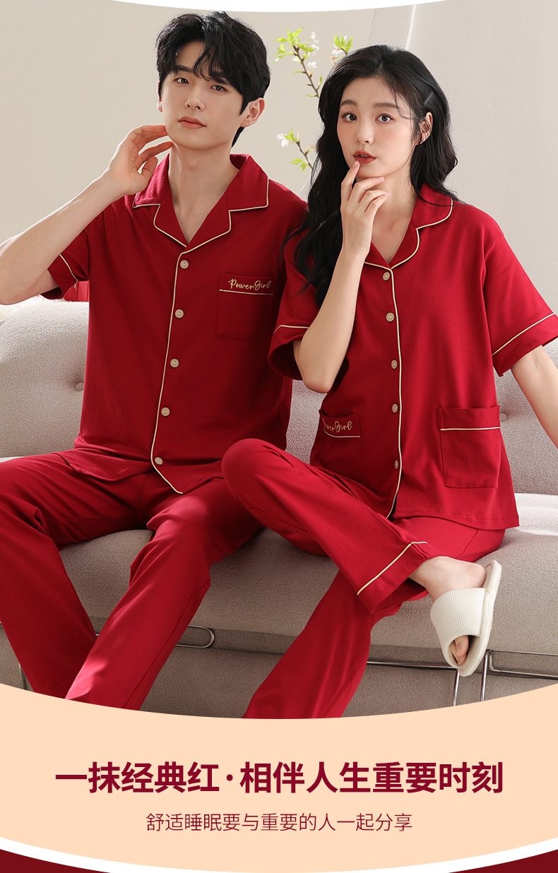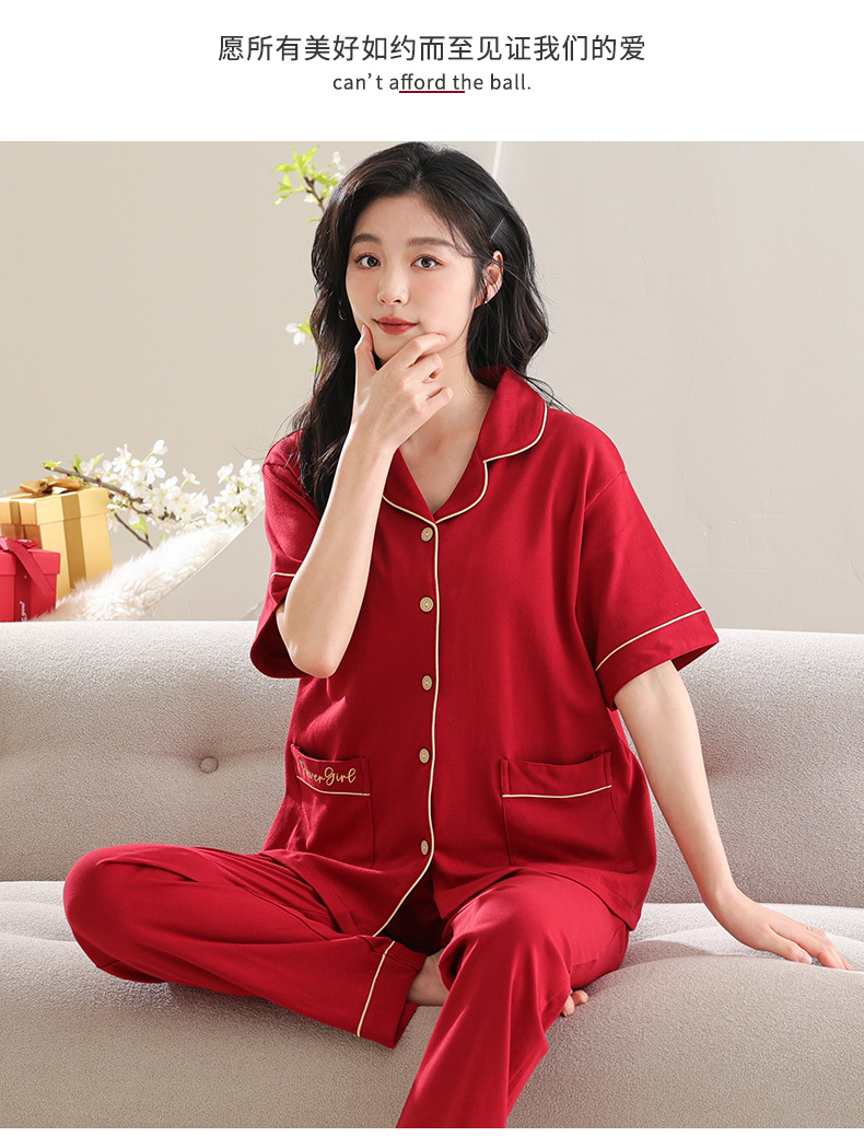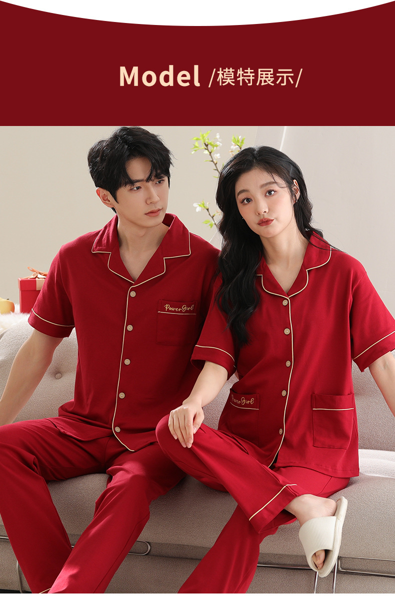 커플 잠옷 여성용 반팔 바지 여름 얇은 편안한 코튼 세트 남성 레드 웨딩 신혼 홈 옷스토어 가기