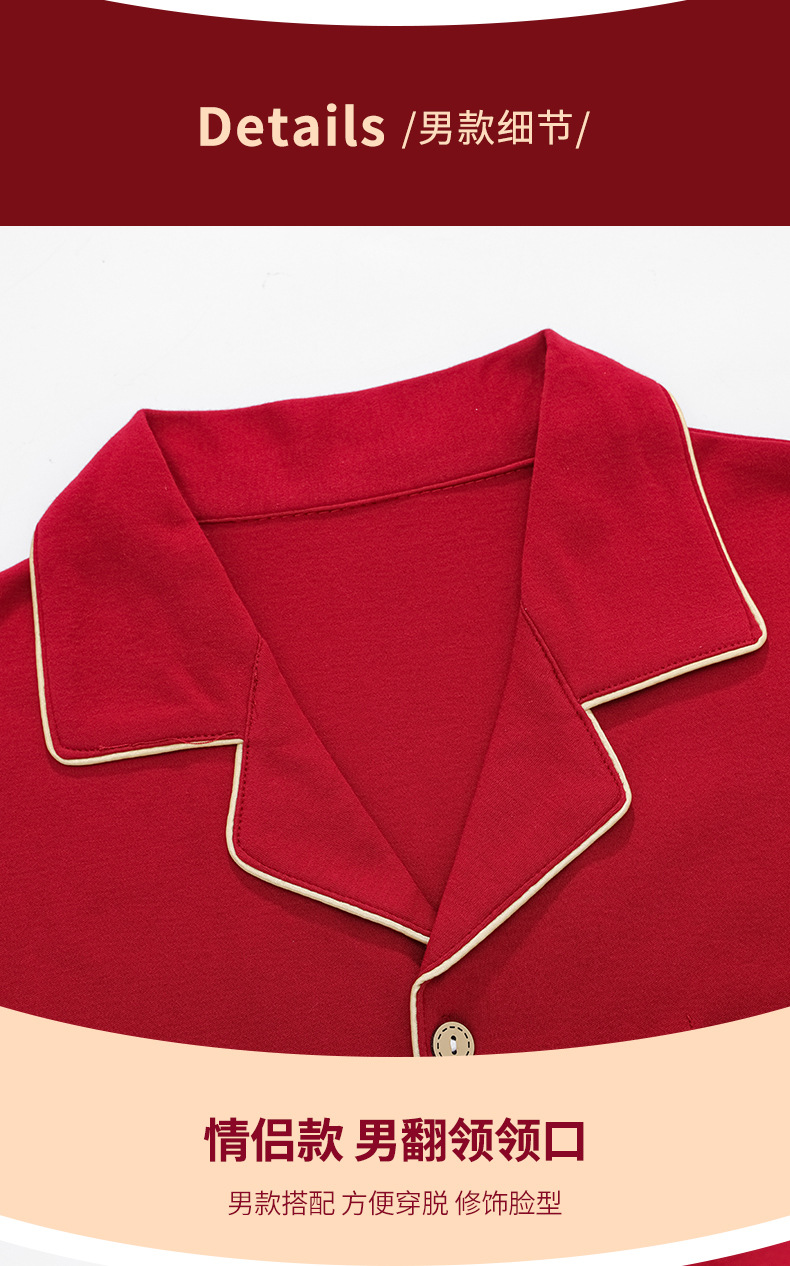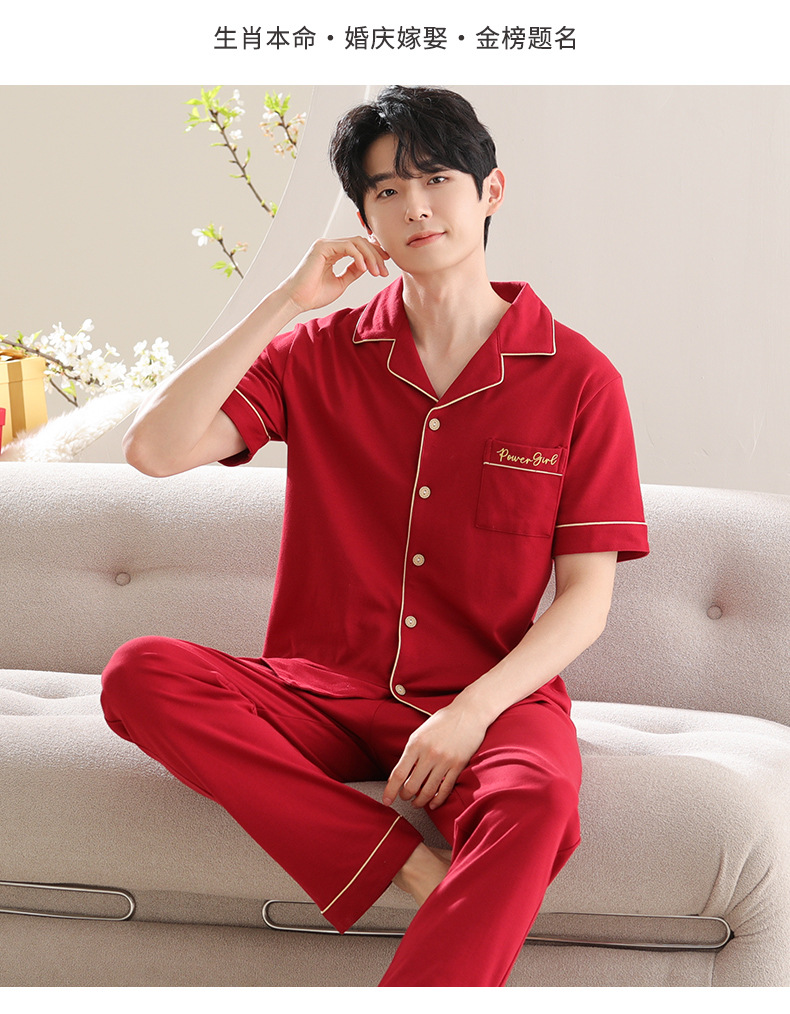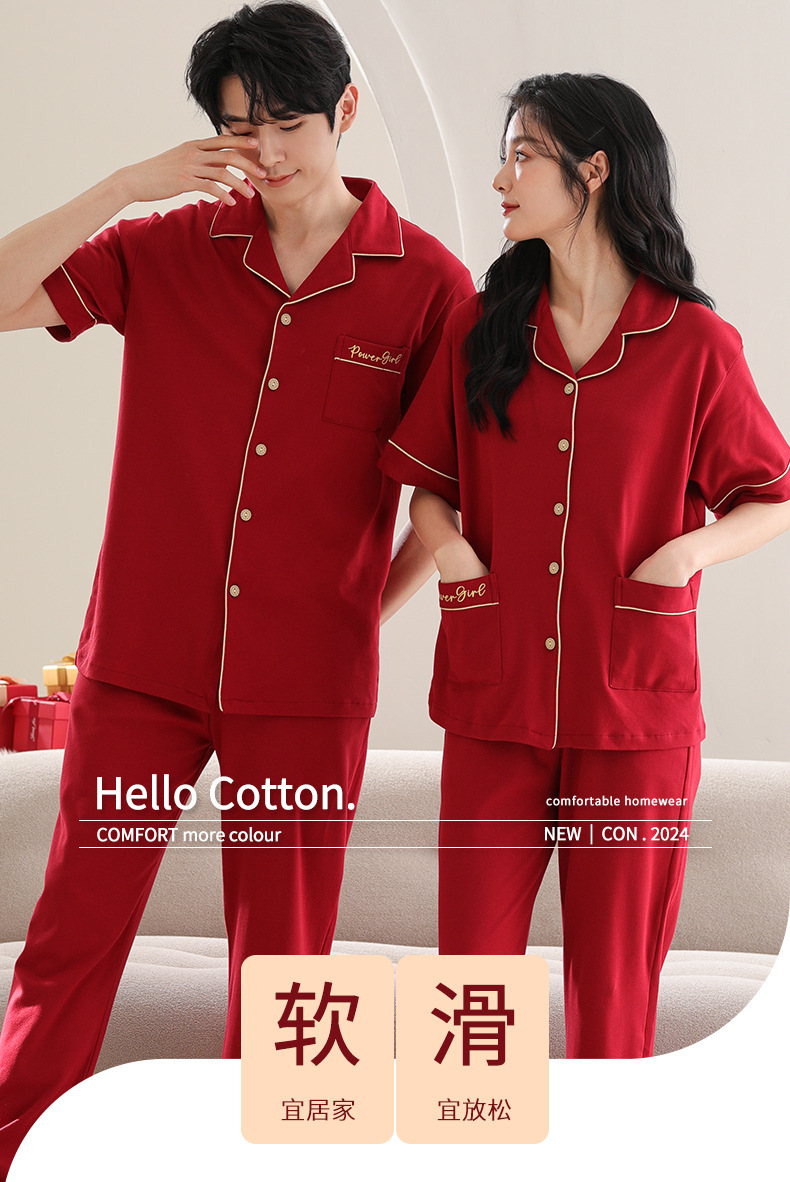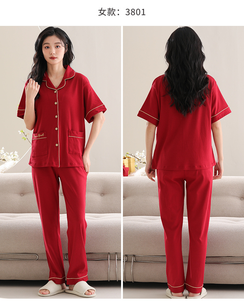 커플 잠옷 여성용 반팔 바지 여름 얇은 편안한 코튼 세트 남성 레드 웨딩 신혼 홈 옷스토어 가기