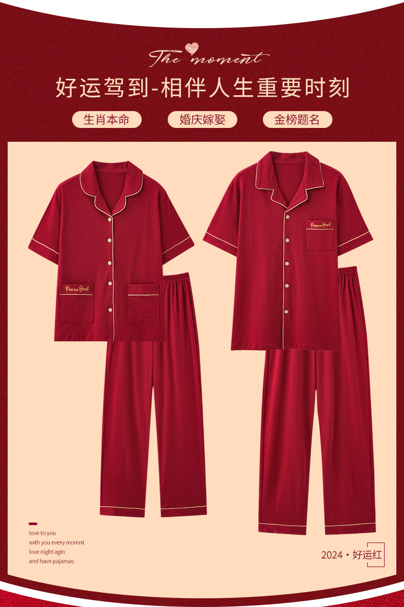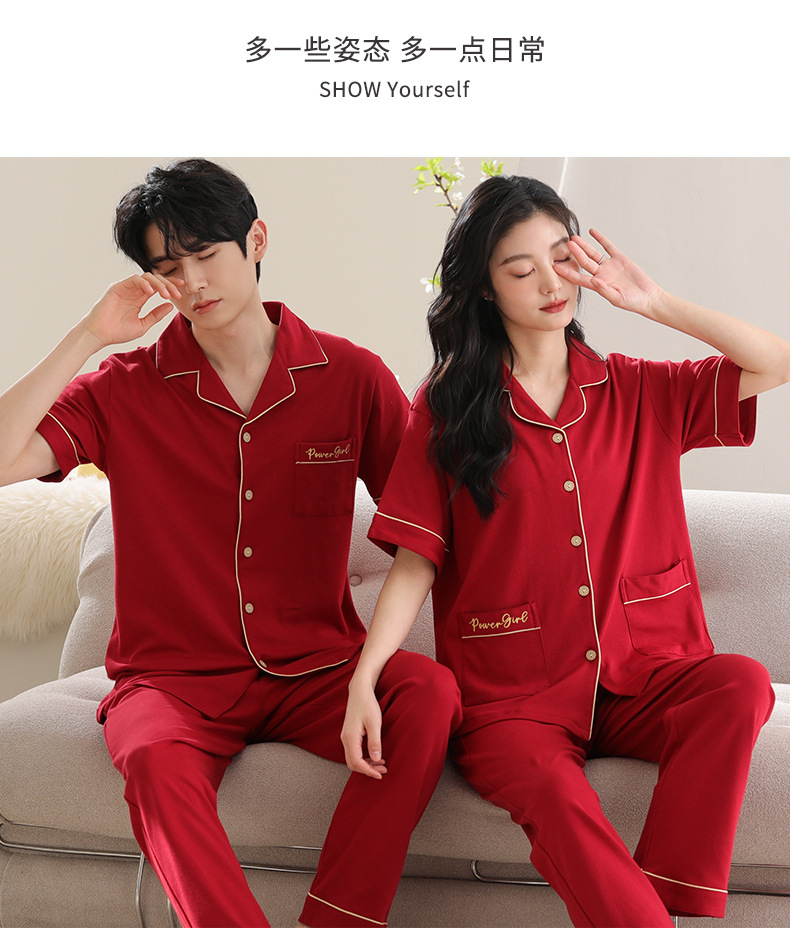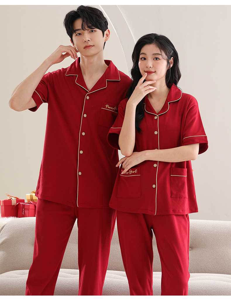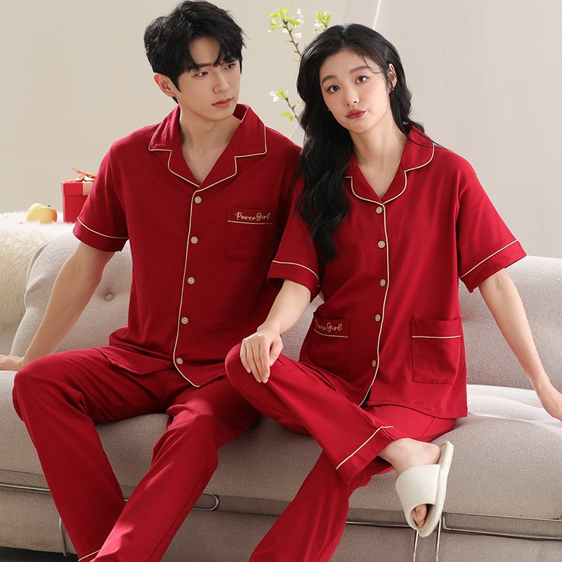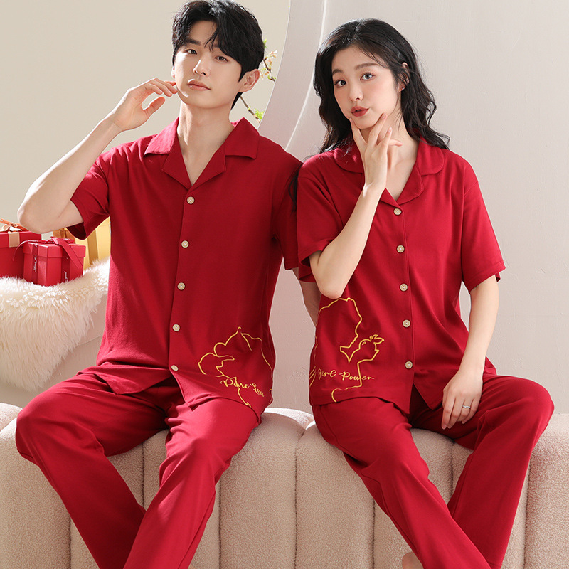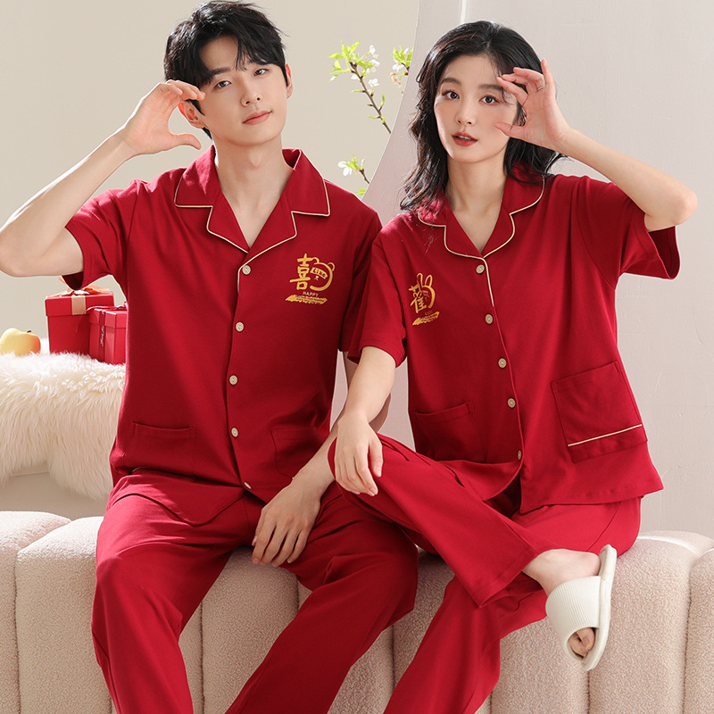 커플 잠옷 여성용 반팔 바지 여름 얇은 편안한 코튼 세트 남성 레드 웨딩 신혼 홈 옷