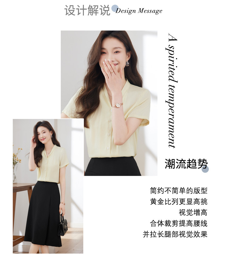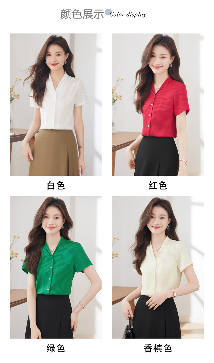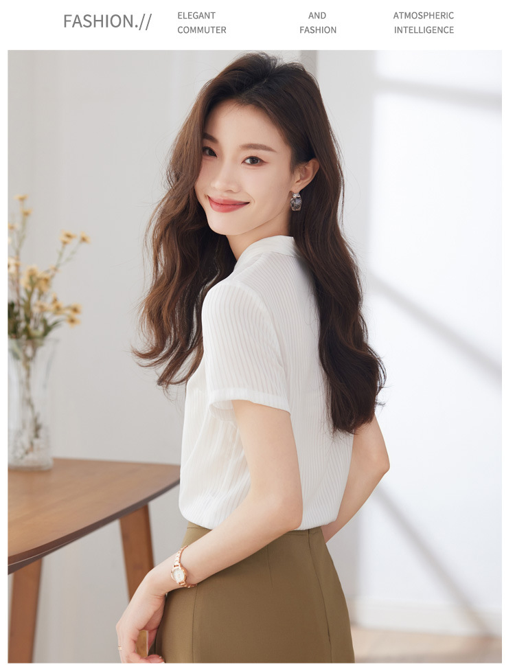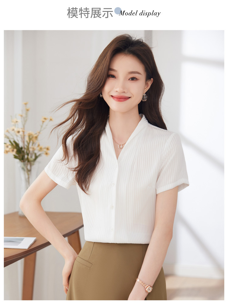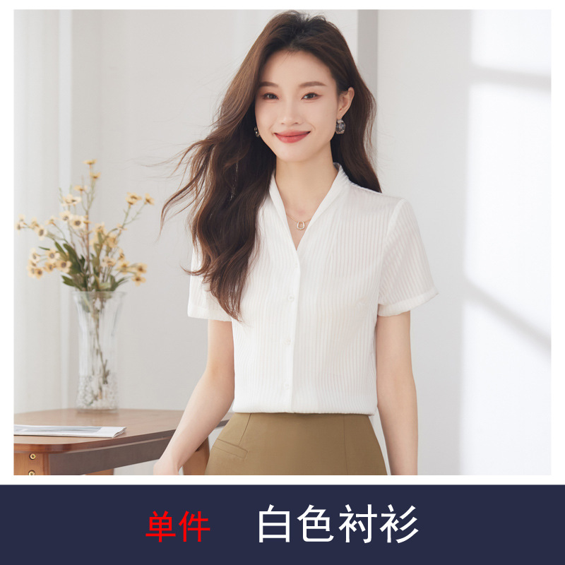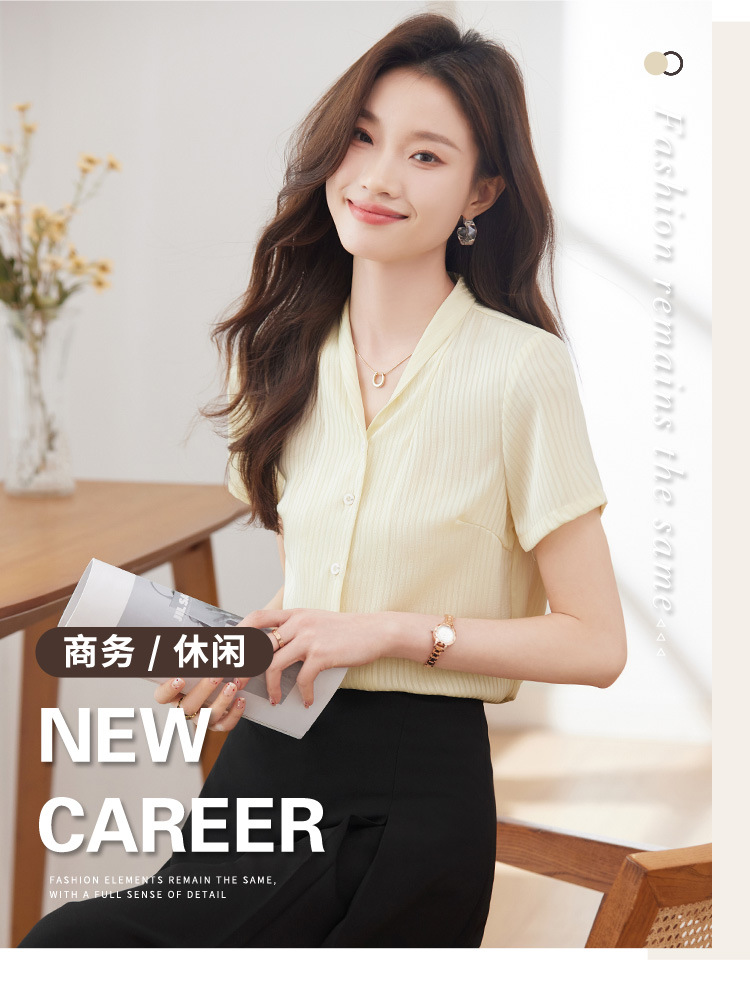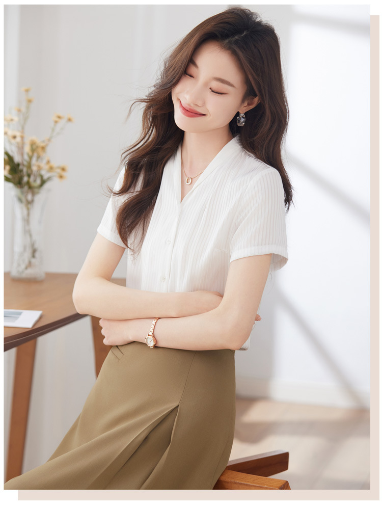 여름 2024 새로운 프랑스 스타일 우아한 셔츠 여성용 V 넥 슬림 핏 반팔 셔츠 우아한 OL 통근 탑 워크 의류스토어 가기
