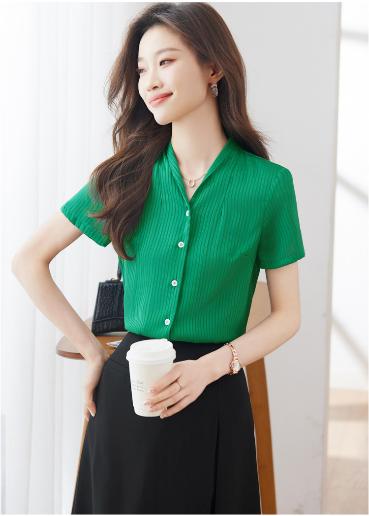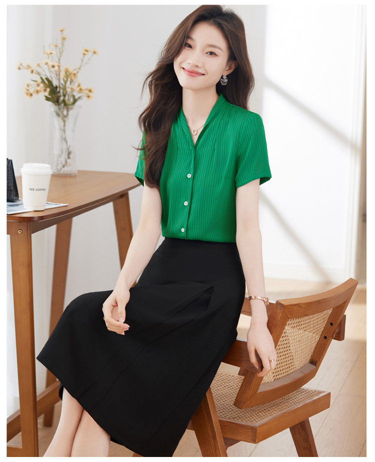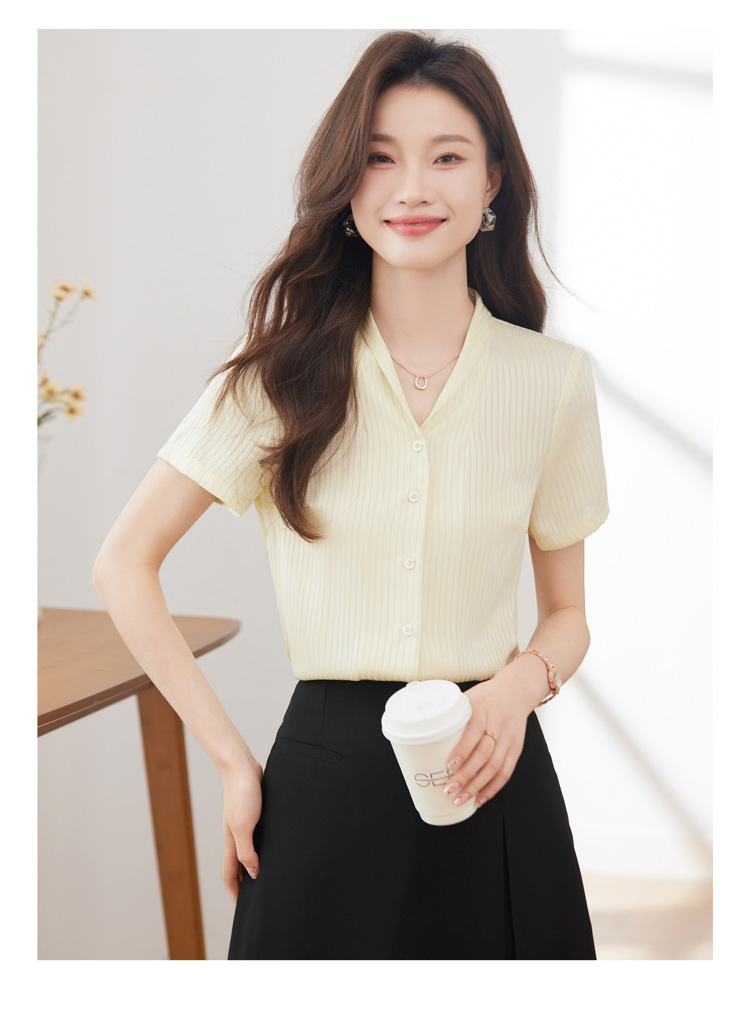 여름 2024 새로운 프랑스 스타일 우아한 셔츠 여성용 V 넥 슬림 핏 반팔 셔츠 우아한 OL 통근 탑 워크 의류