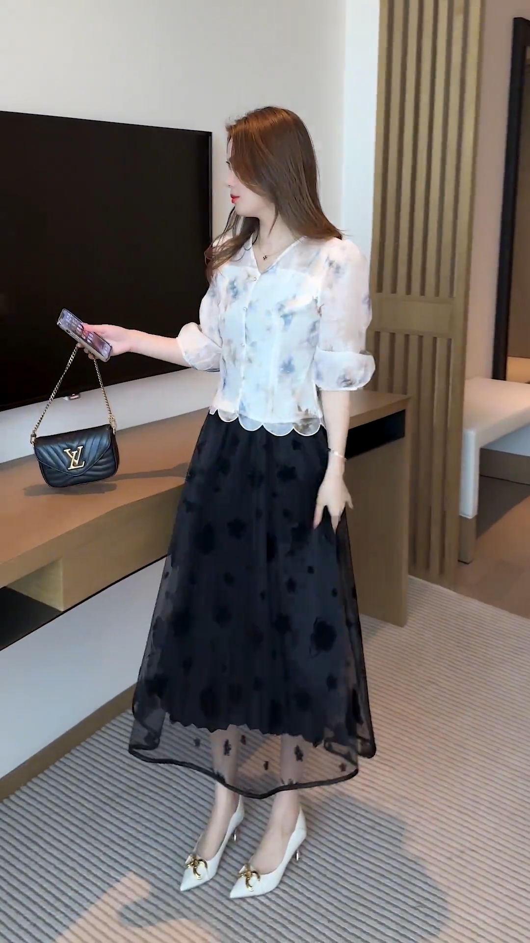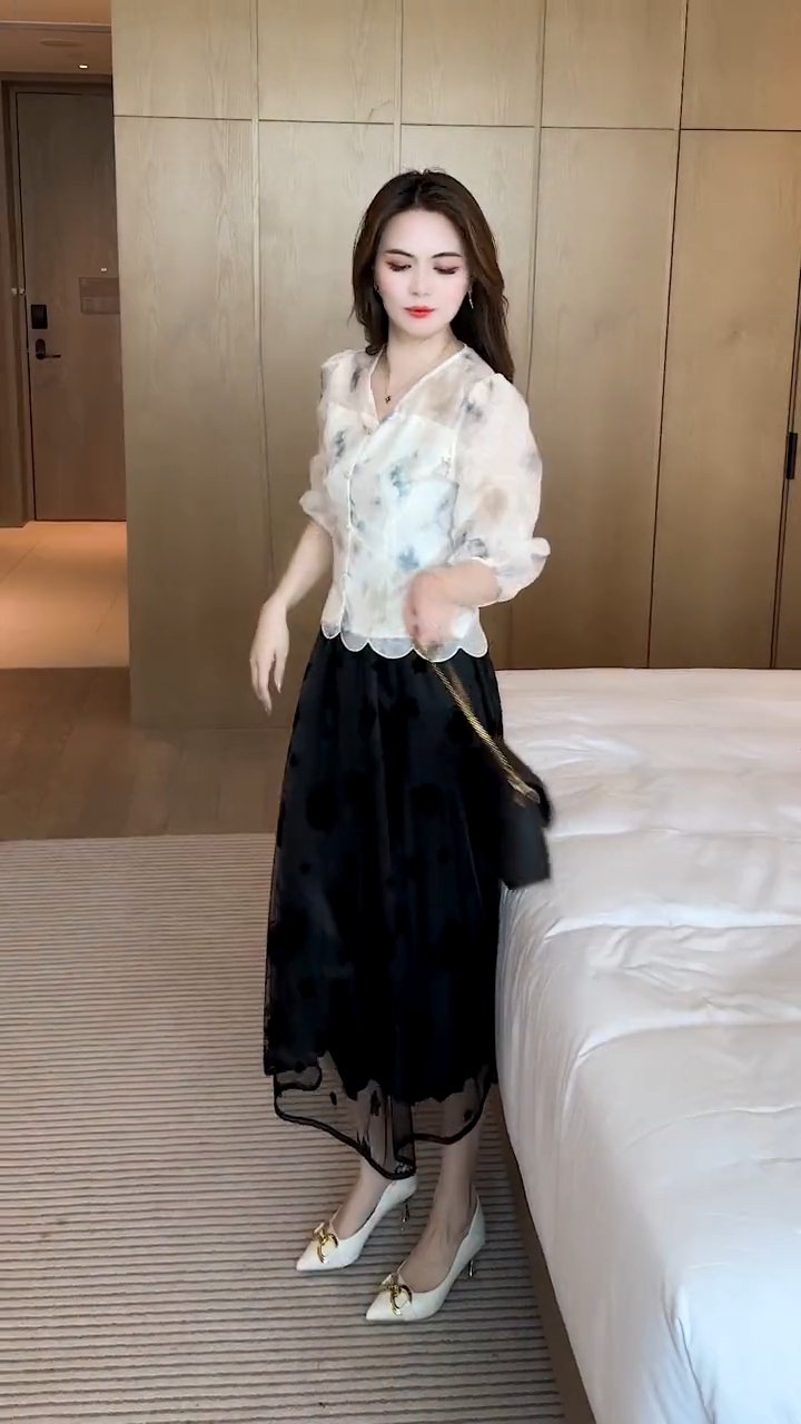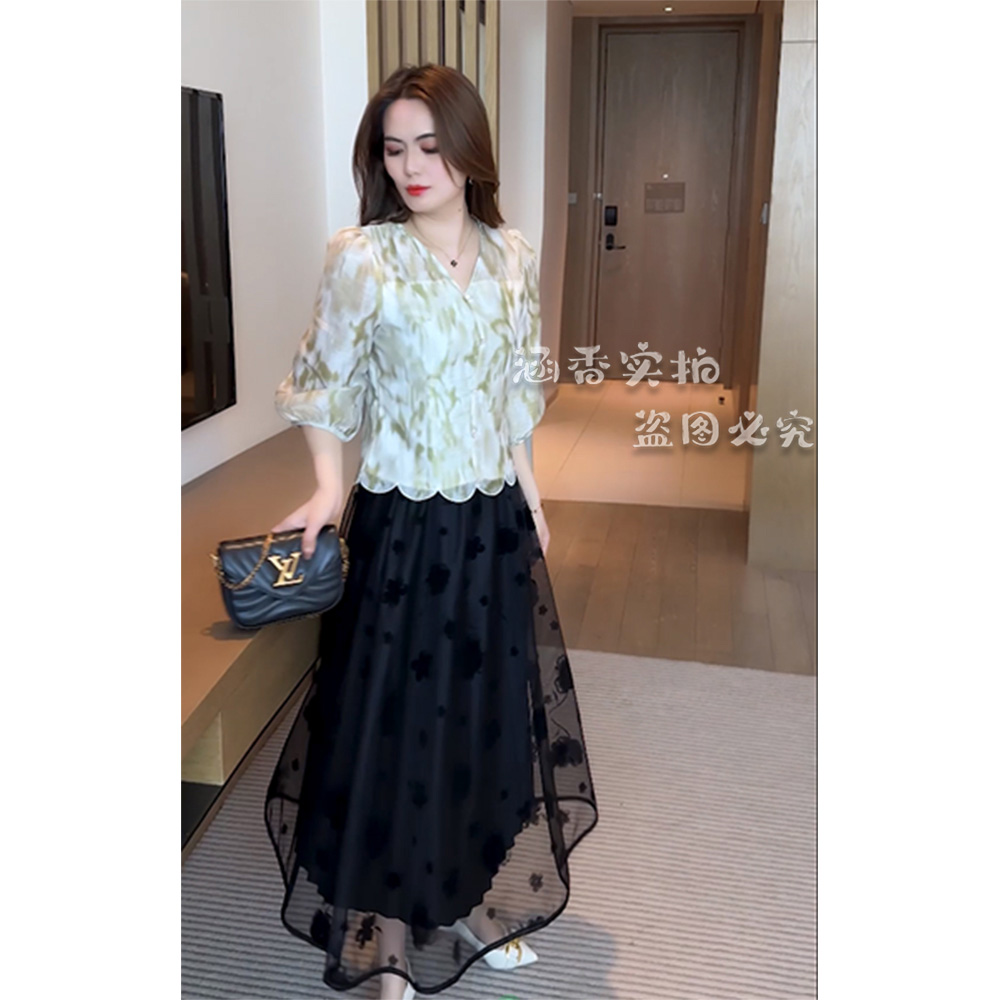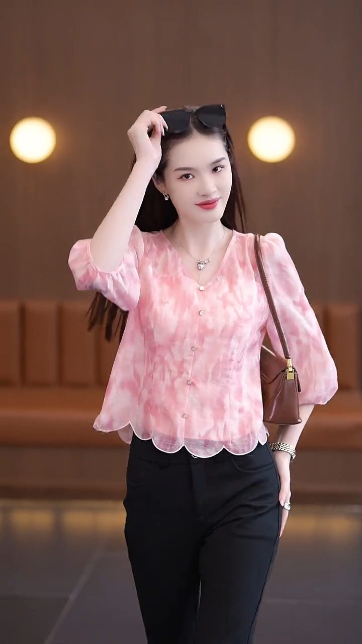 세련되고 스타일리쉬한 플로럴 시폰 셔츠 여성 7부 소매 브랜드 블라우스 2026 봄 신상 배를 가려주는 슬리밍 탑