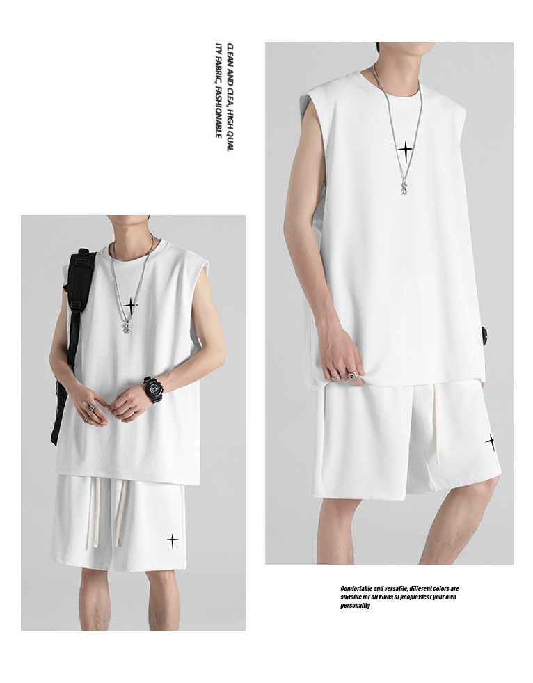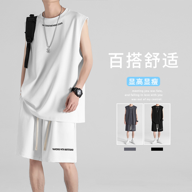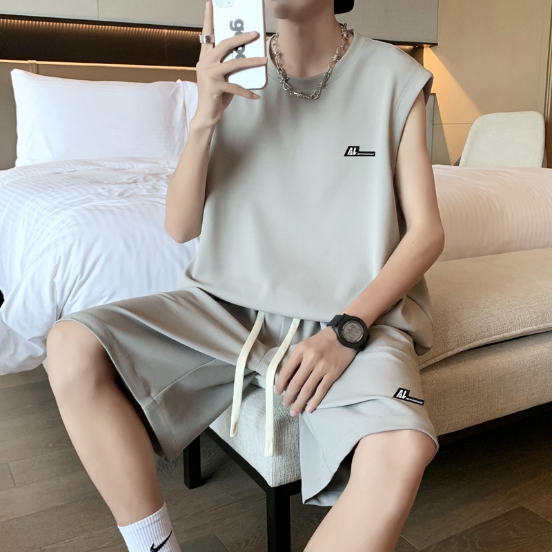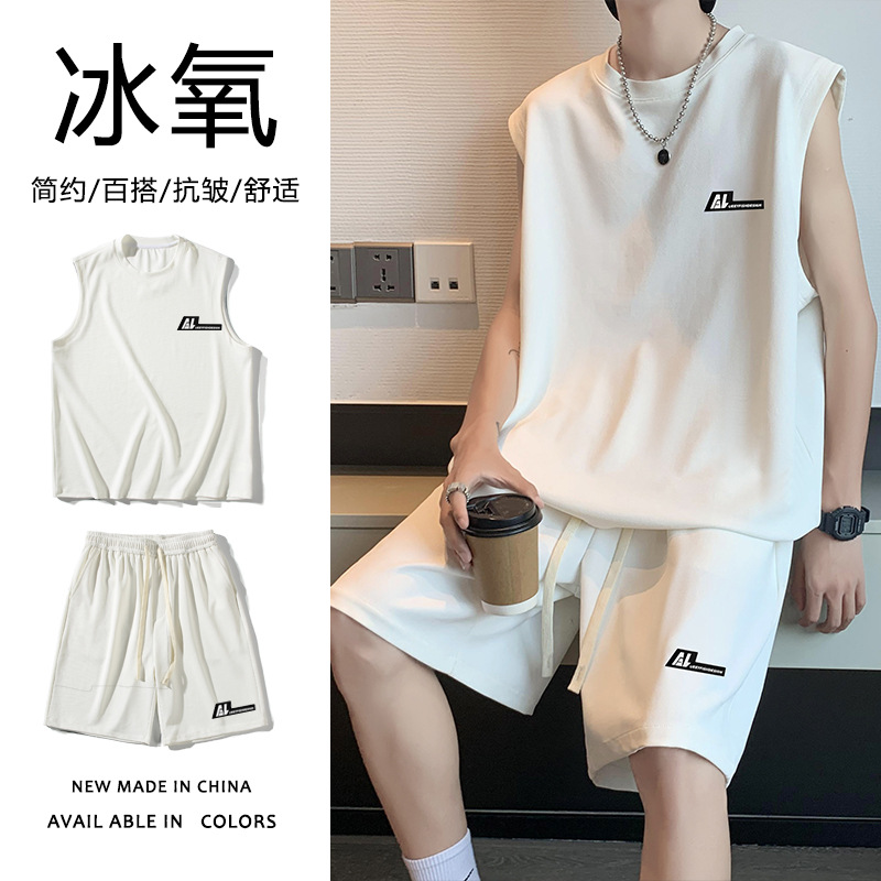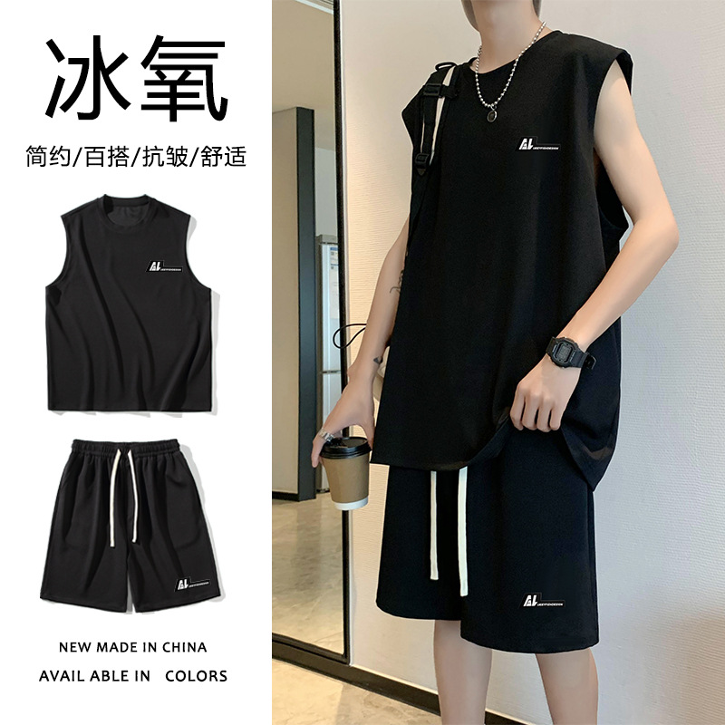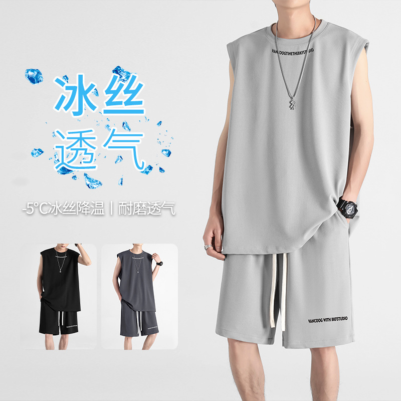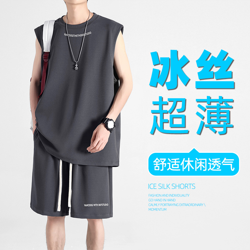 아이스 실크 스포츠 세트 남자 여름 유행 브랜드 남자 조끼 짧은 캐주얼 느슨한 남자의 빠른 건조 남성 의류 유행