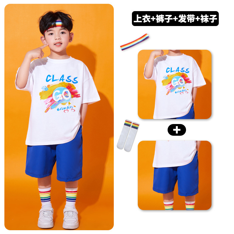 • 세트 [587T 블루 GO 짧은 소매 417D 순수한 흰색 반바지] 흰색 줄무늬 모자 무지개 양말