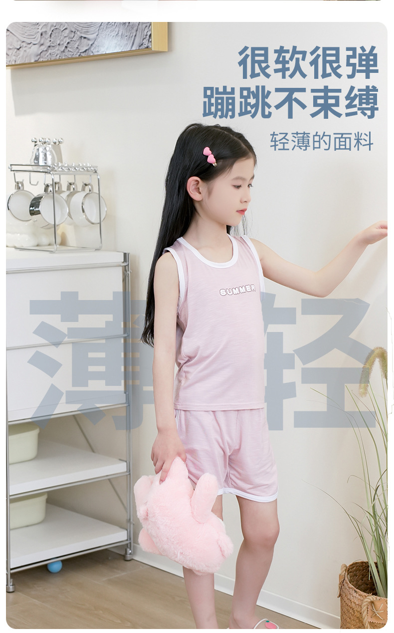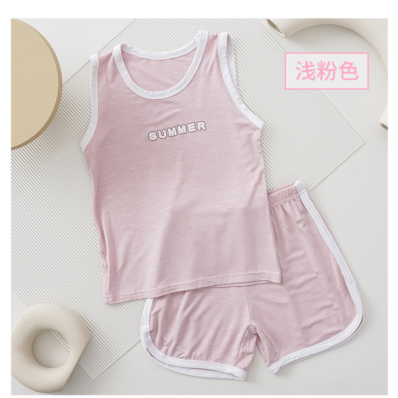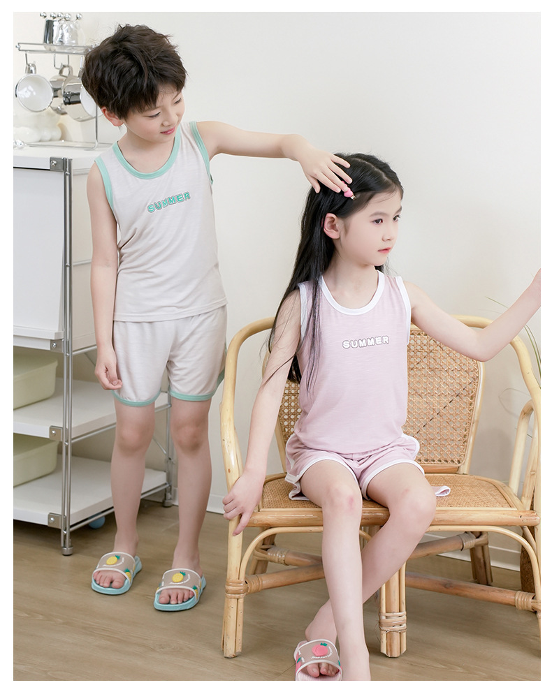 소년 소녀를위한 어린이 잠옷 아이스 실크 조끼 민소매 반바지 세트 큰 어린이 작은 소년의 집 옷 에어컨 옷