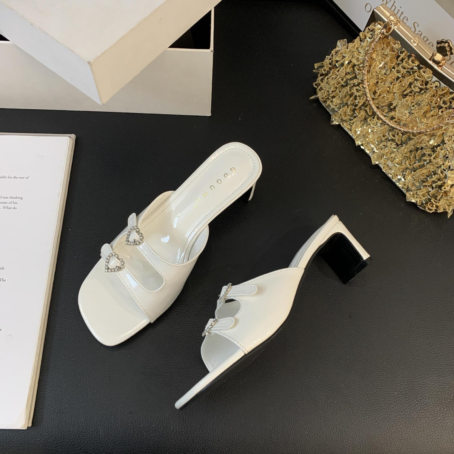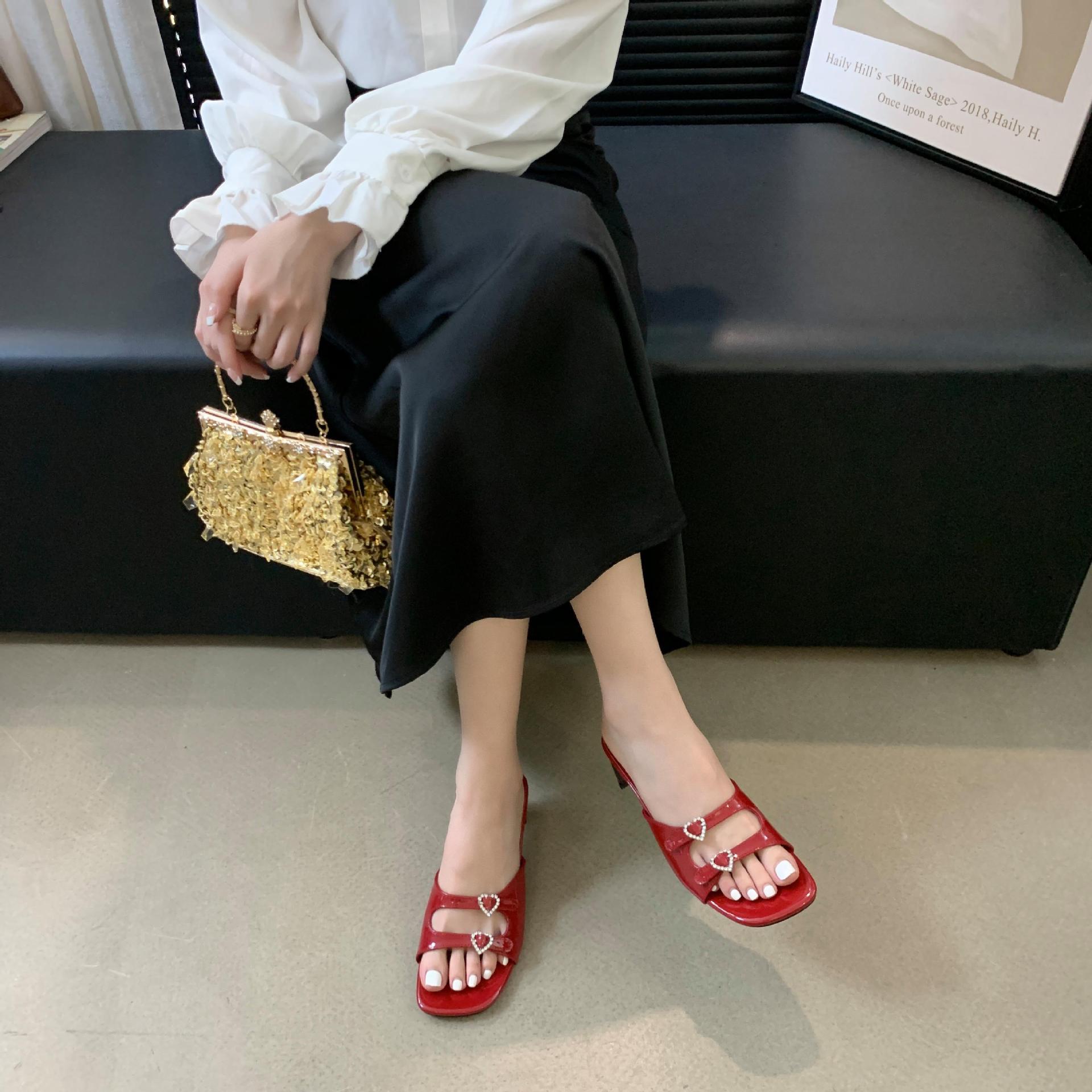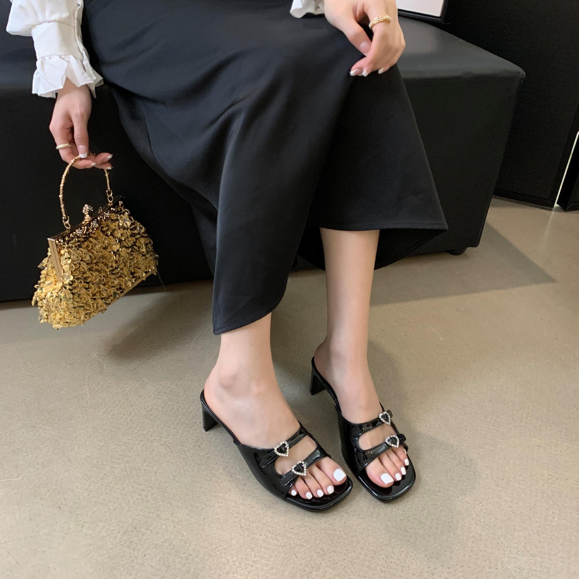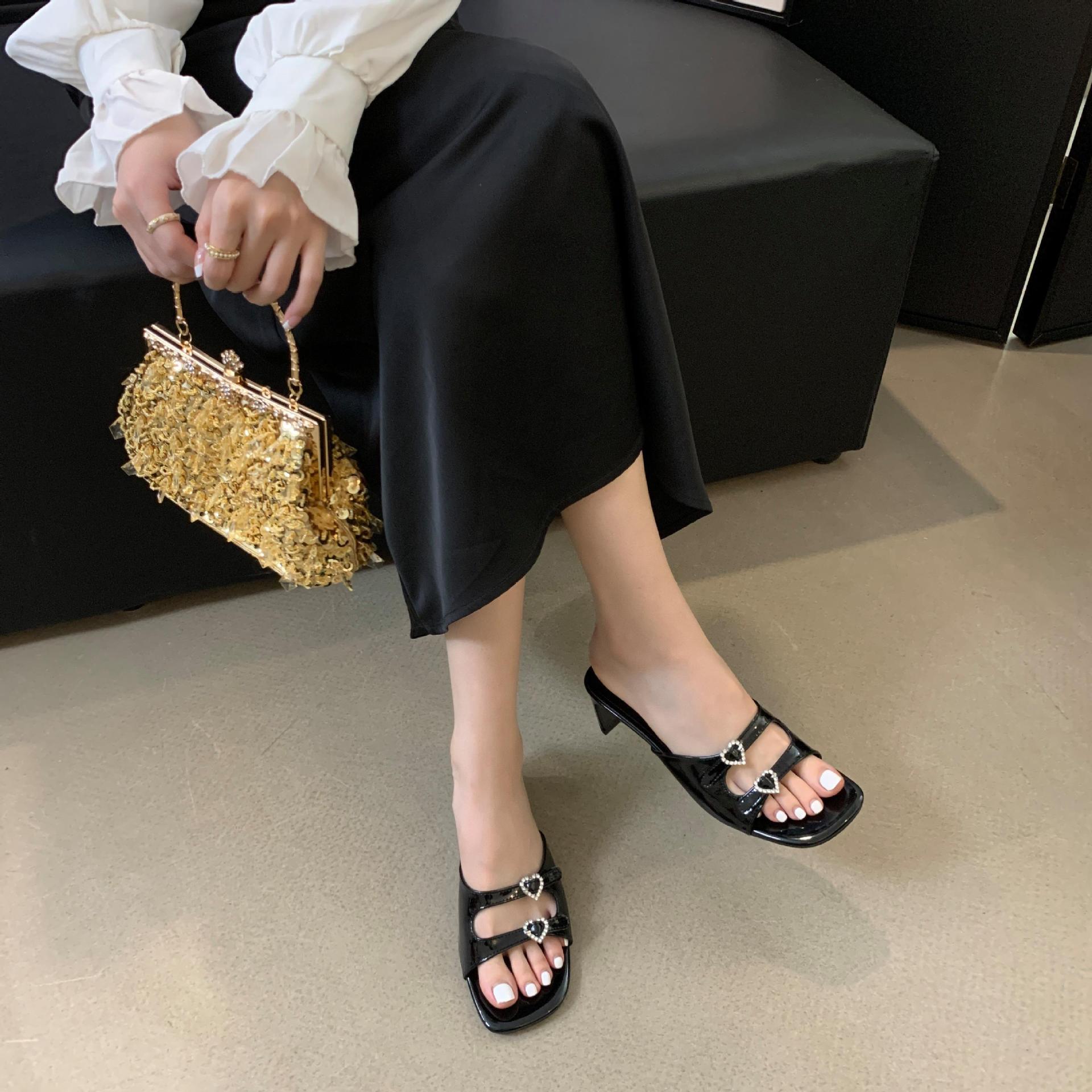 봄과 가을 2024 새로운 요정 사랑 라인스톤 오픈 발가락 슬리퍼 샌들 우아한 거친 미드 힐 샌들