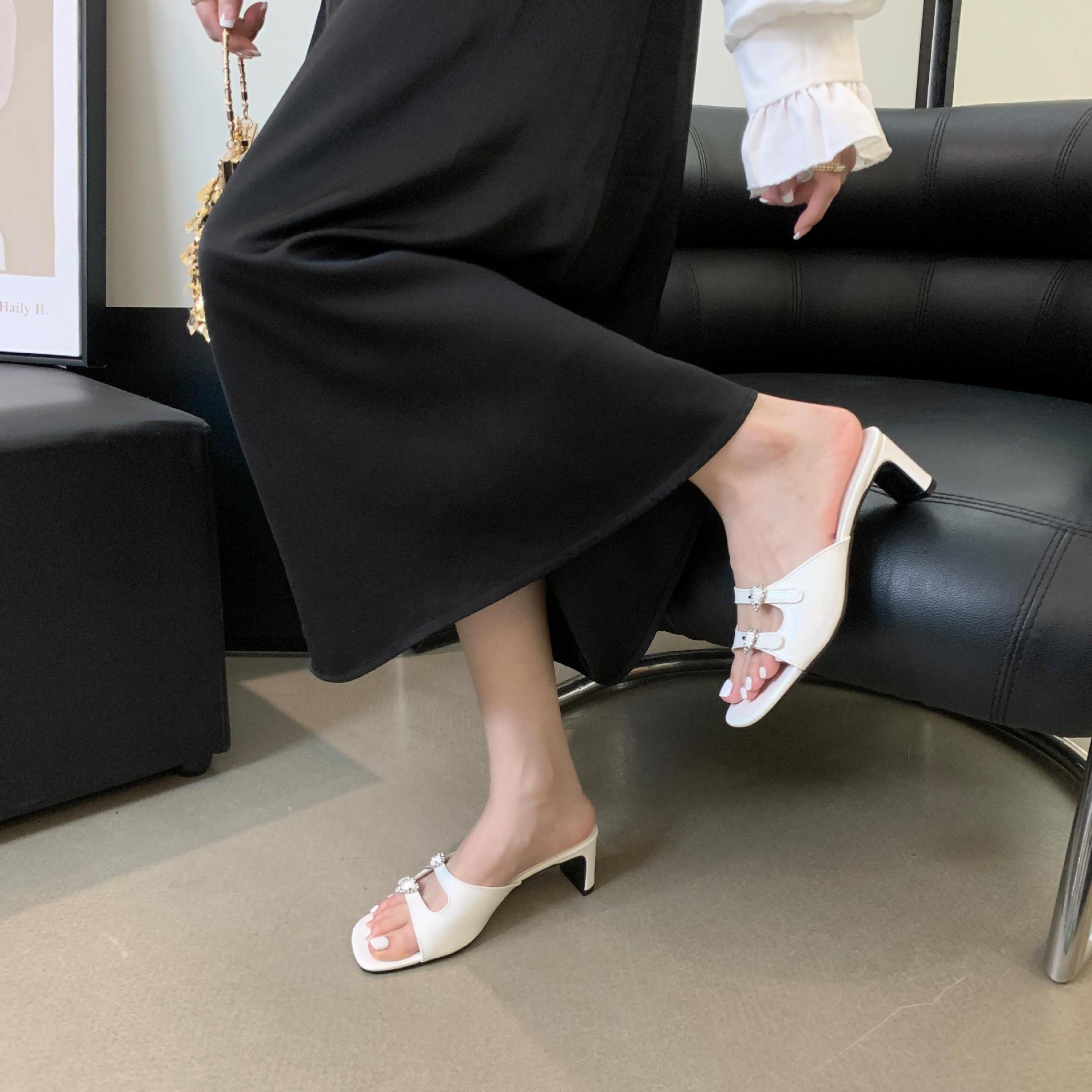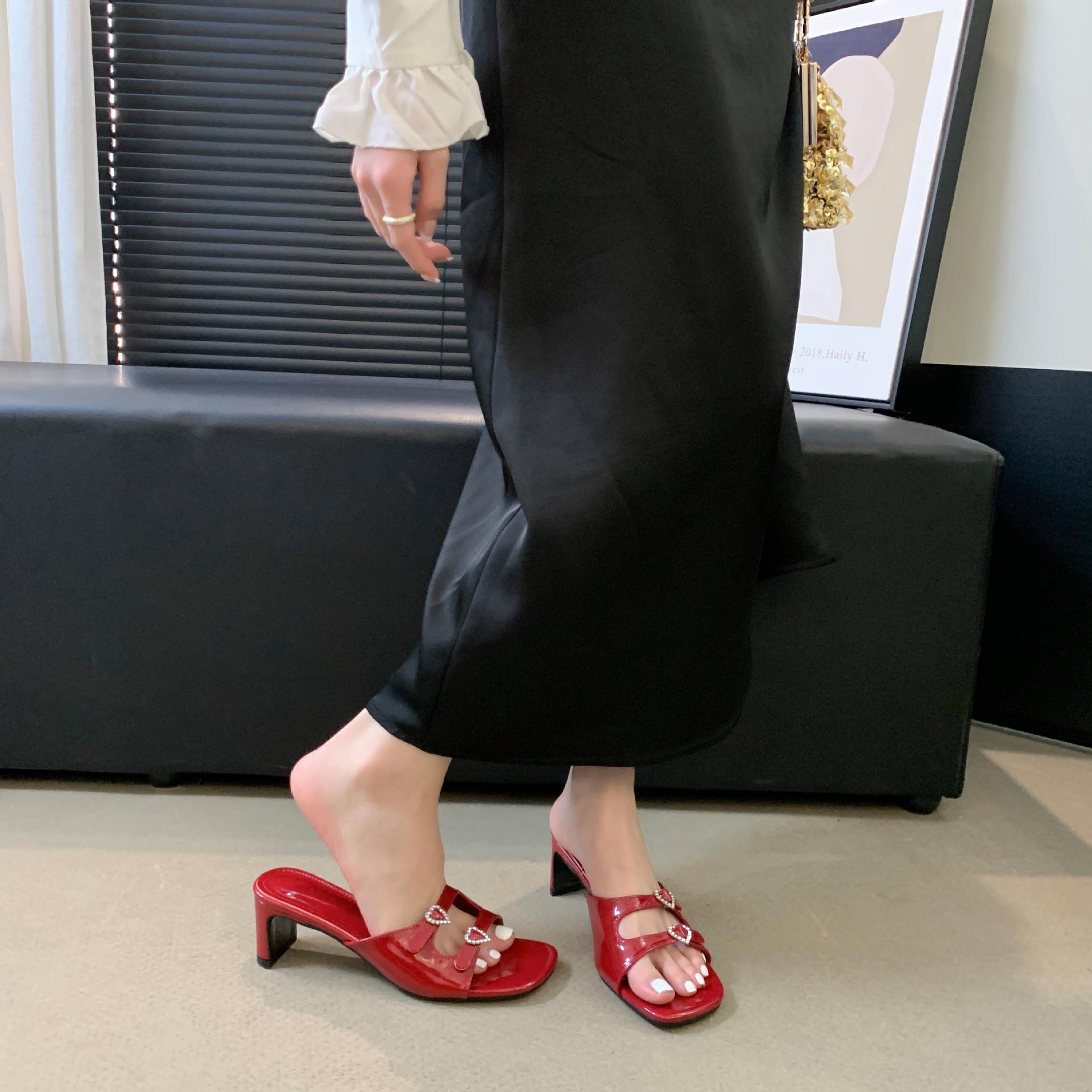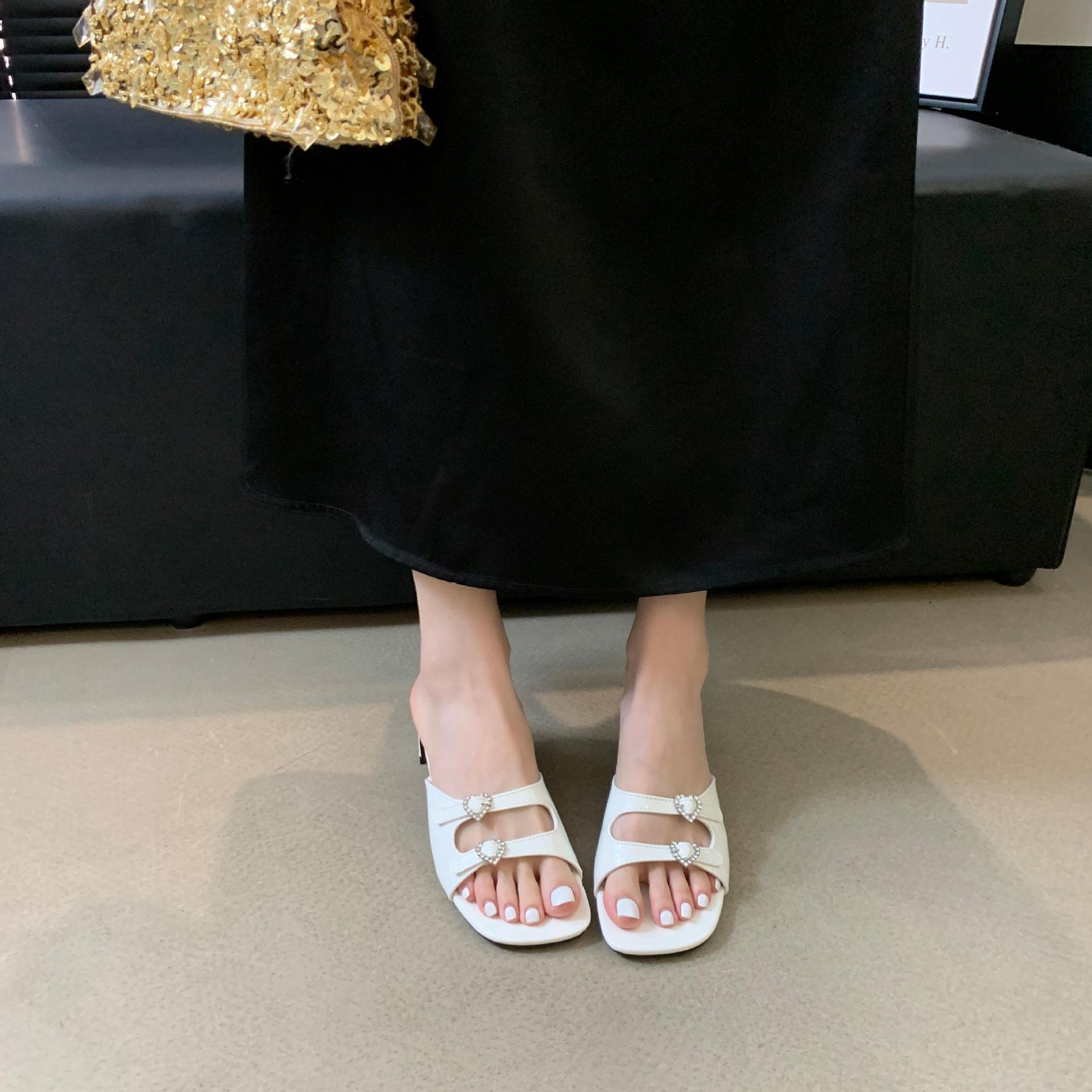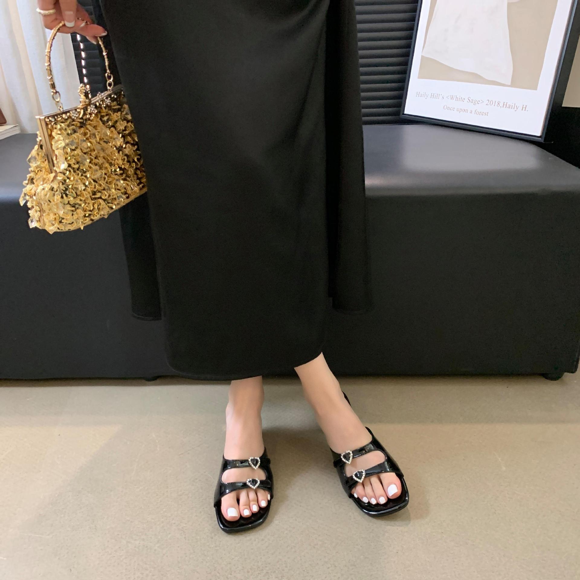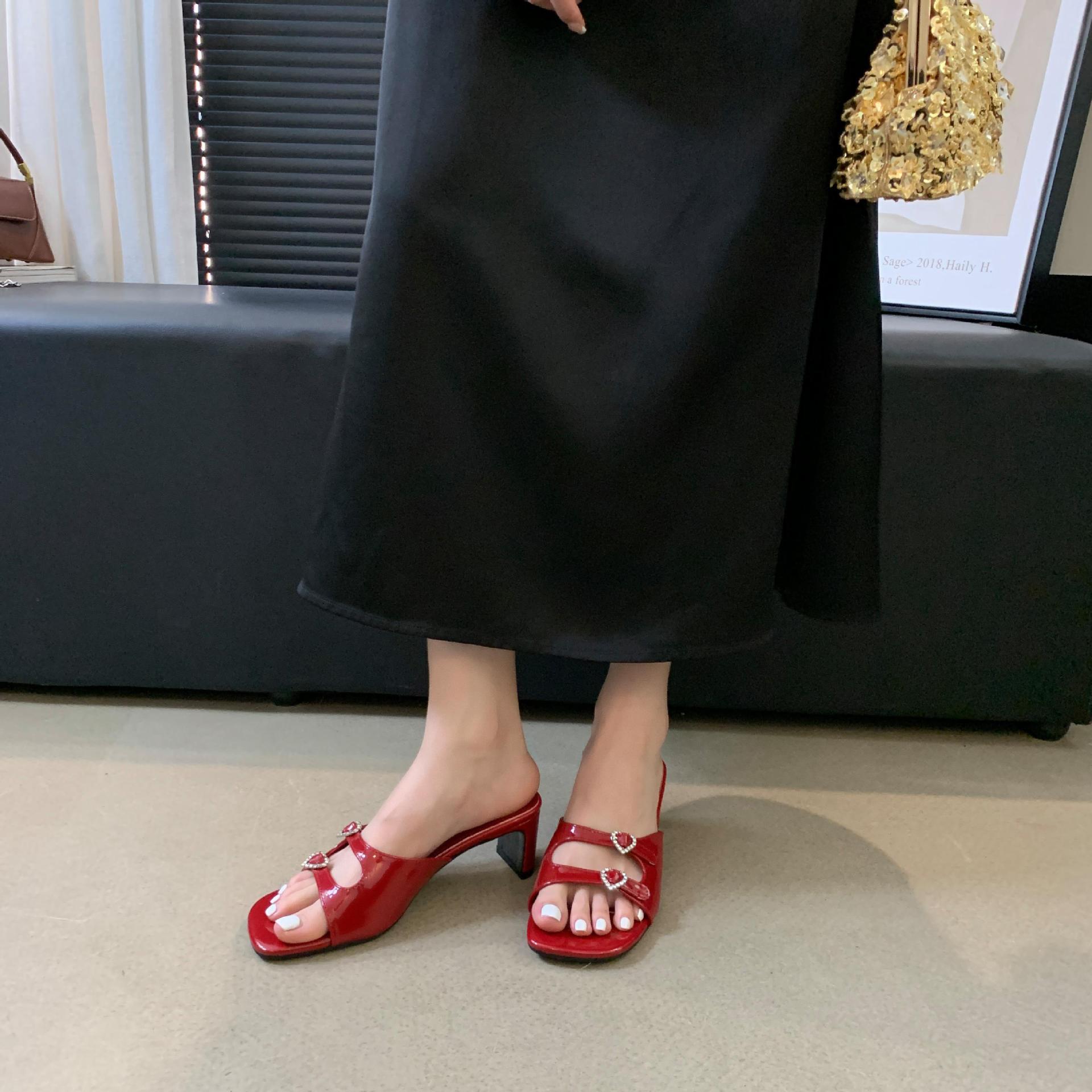 봄과 가을 2024 새로운 요정 사랑 라인스톤 오픈 발가락 슬리퍼 샌들 우아한 거친 미드 힐 샌들