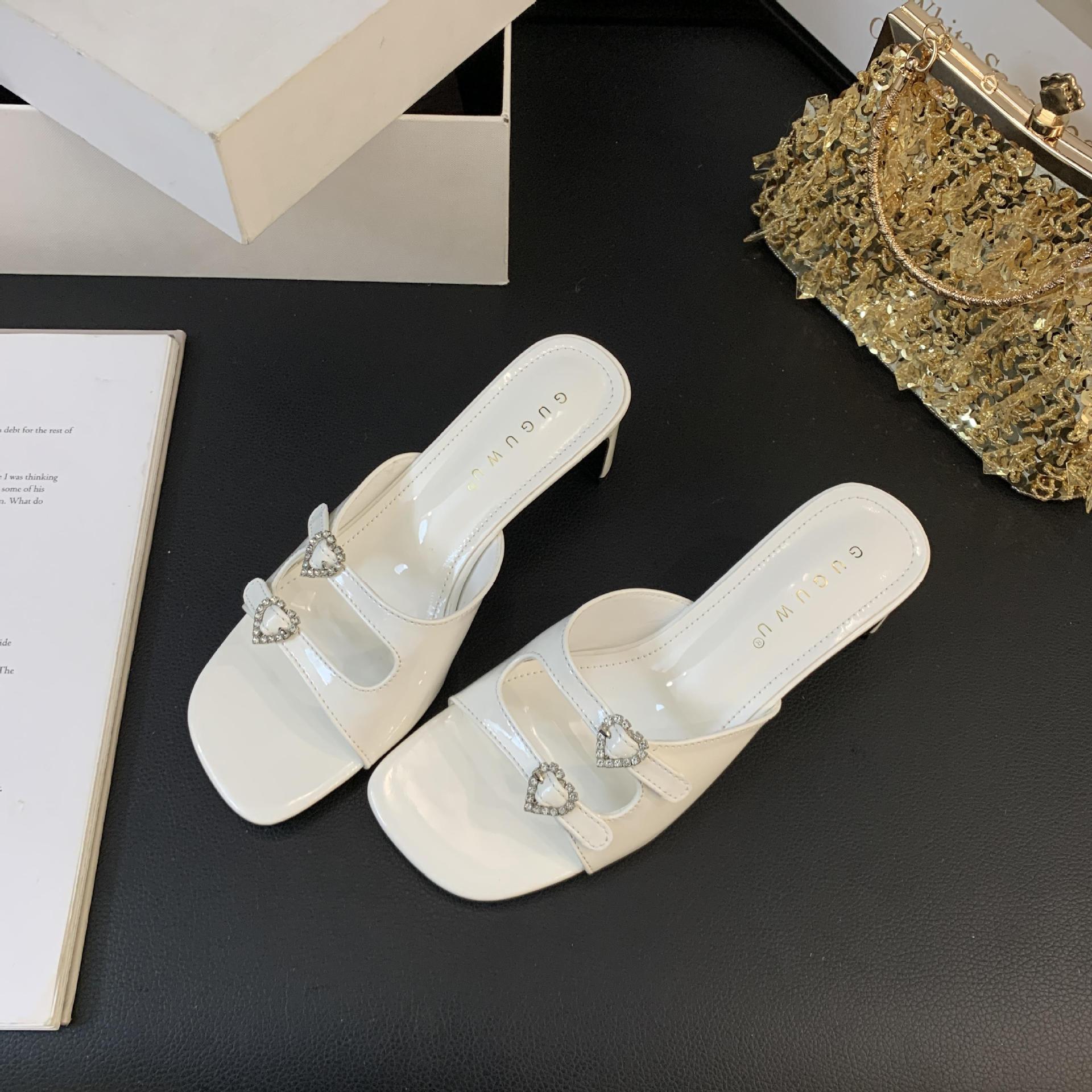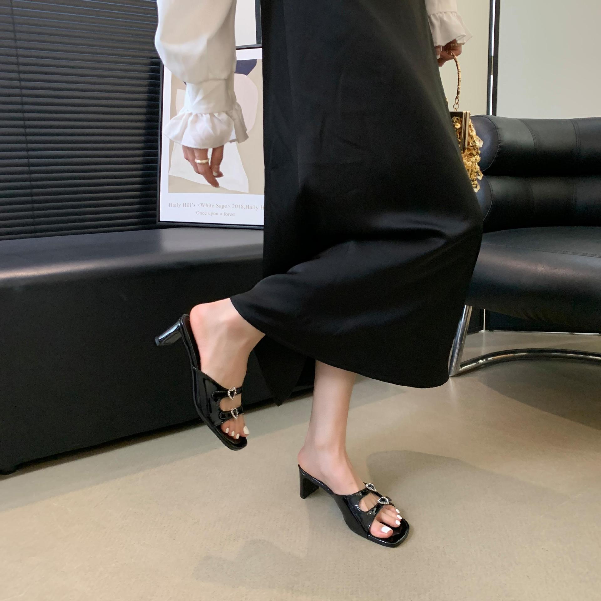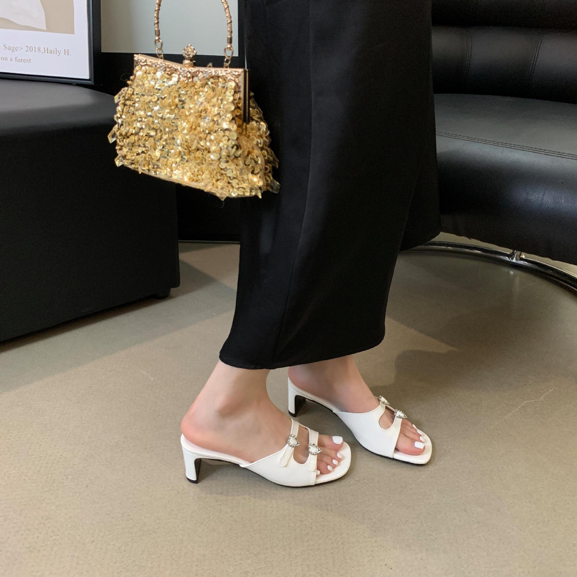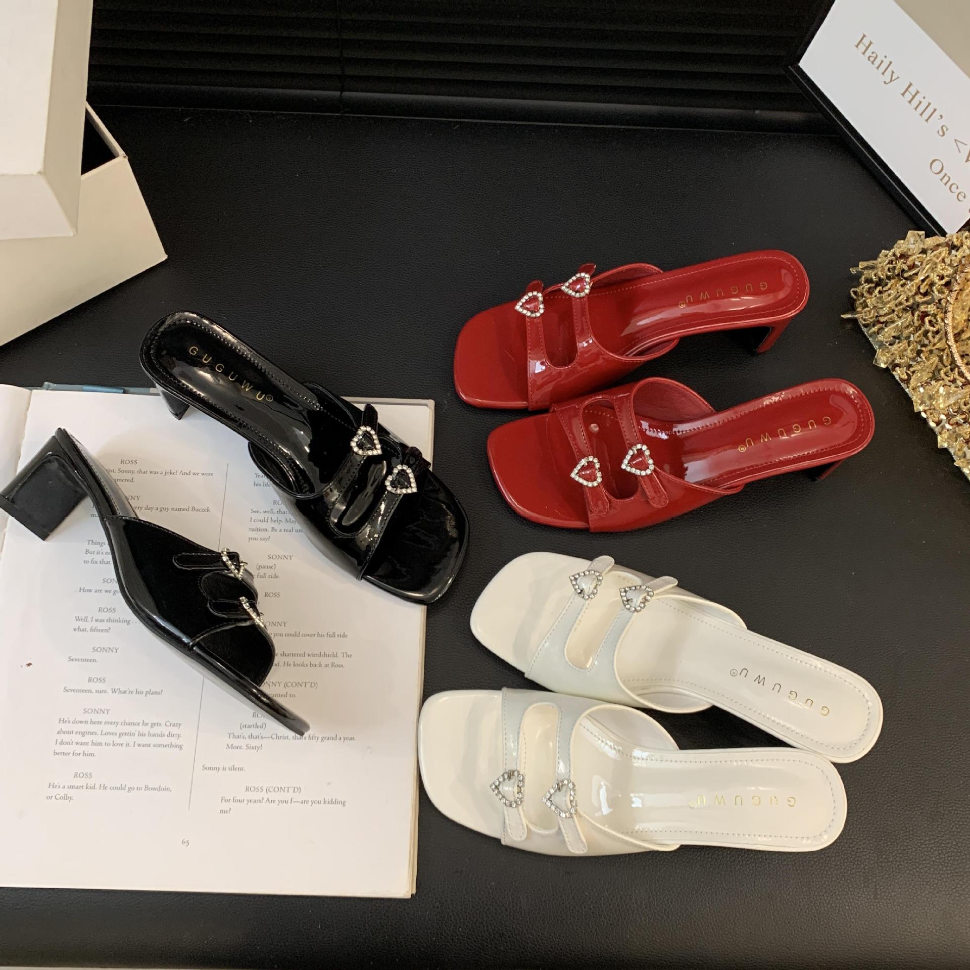 봄과 가을 2024 새로운 요정 사랑 라인스톤 오픈 발가락 슬리퍼 샌들 우아한 거친 미드 힐 샌들