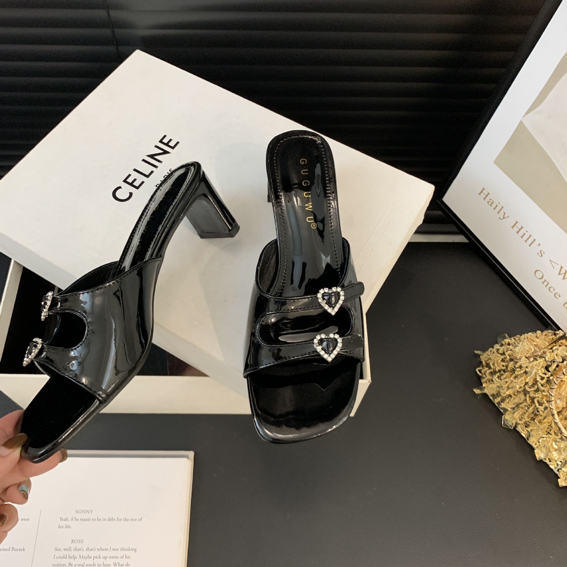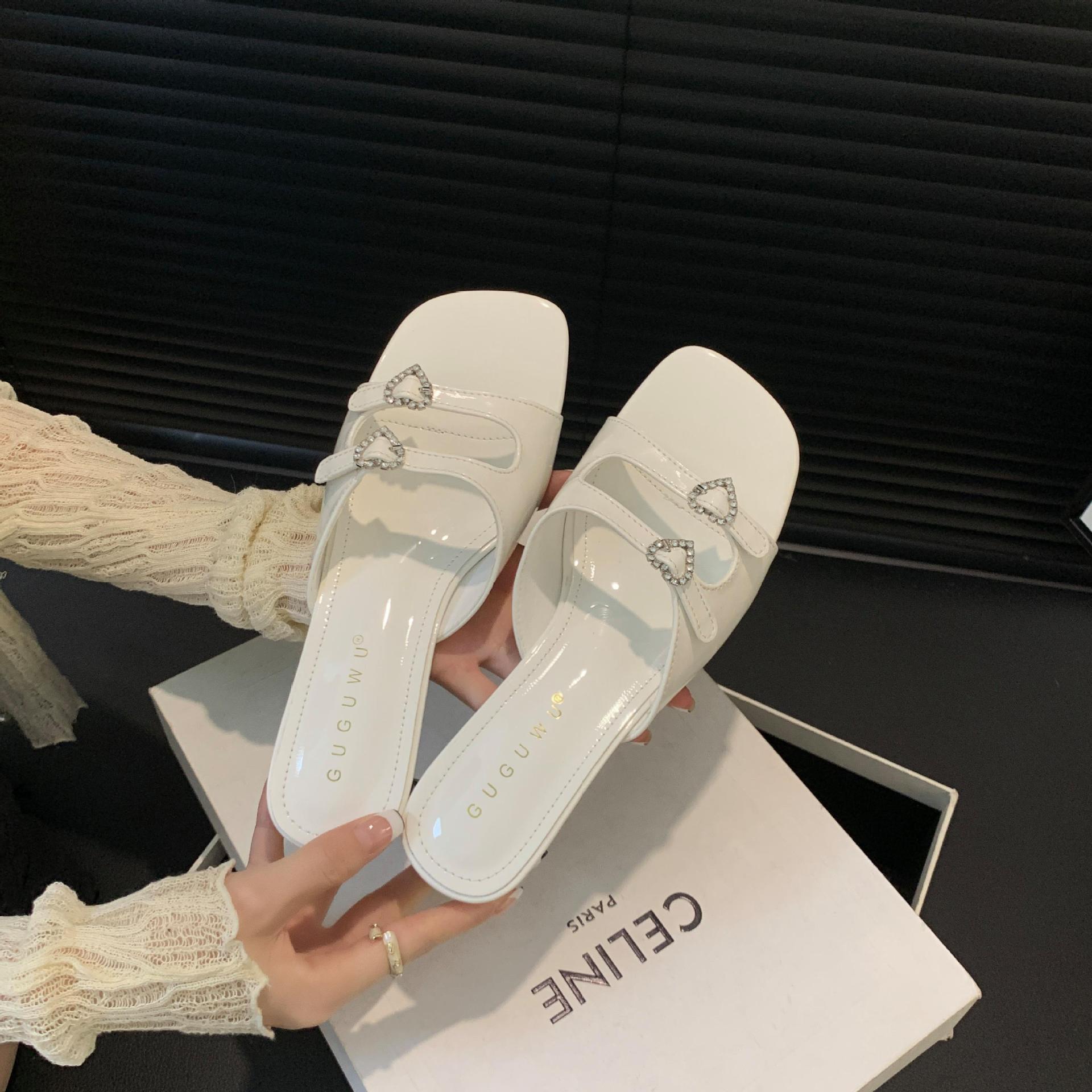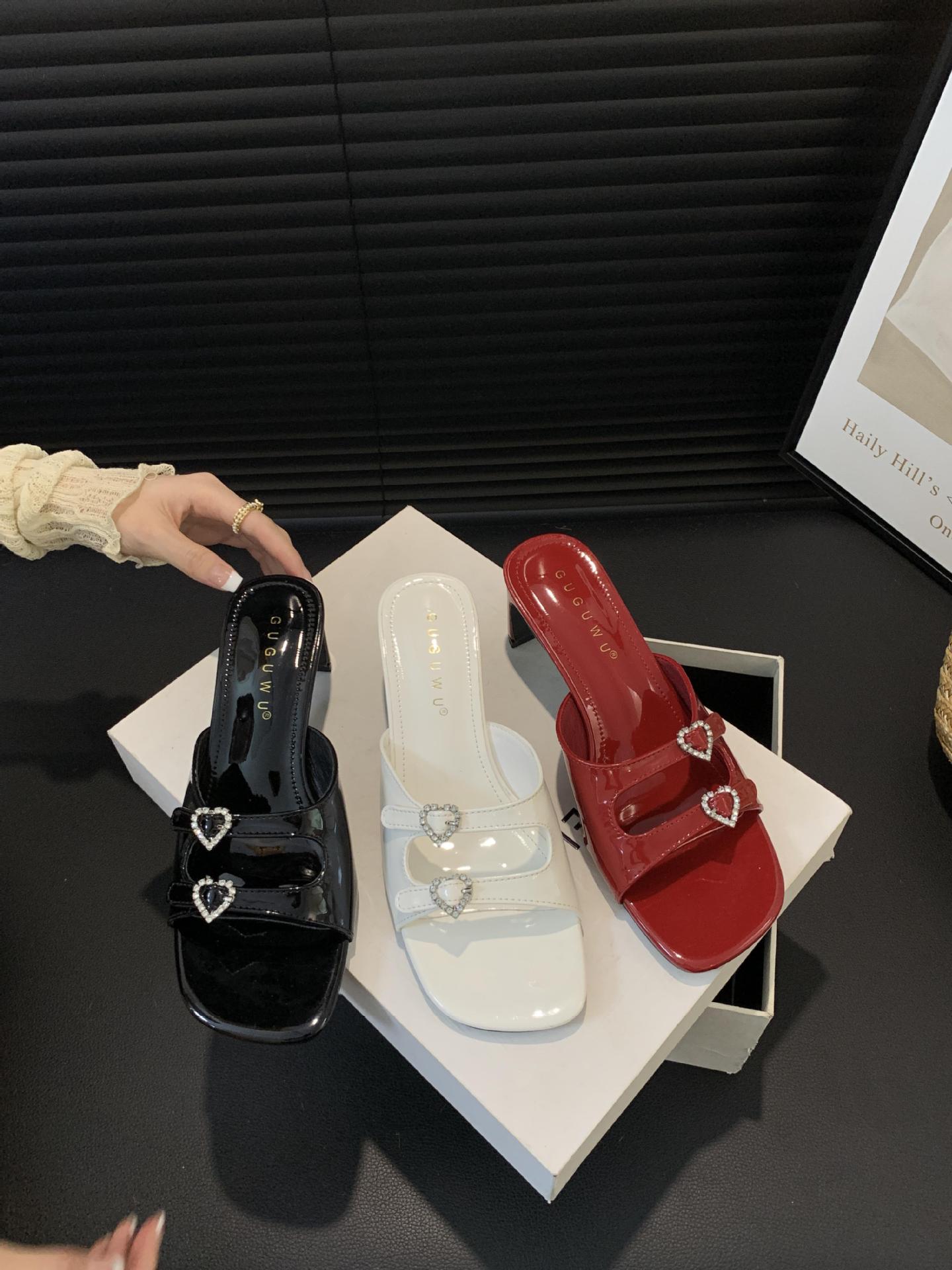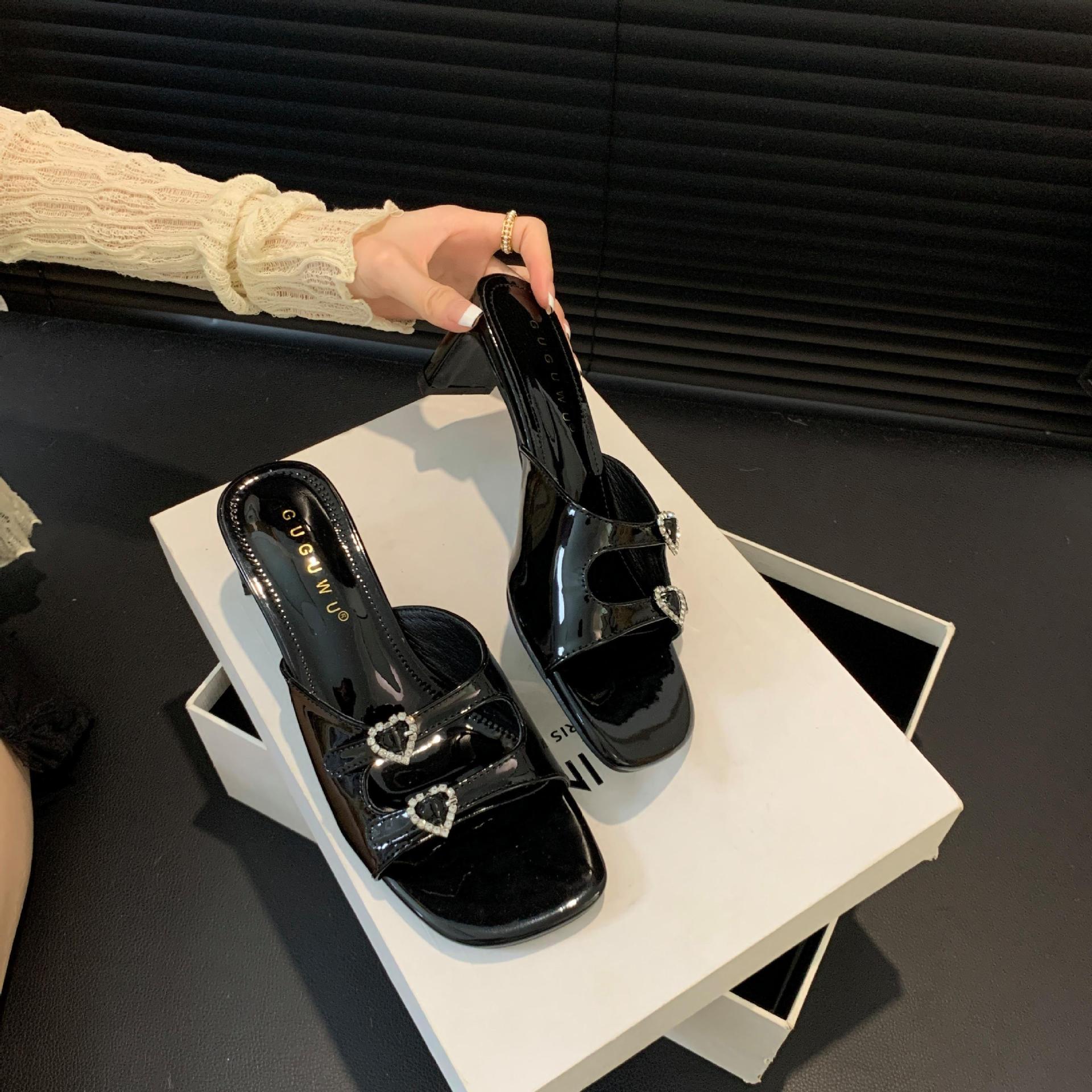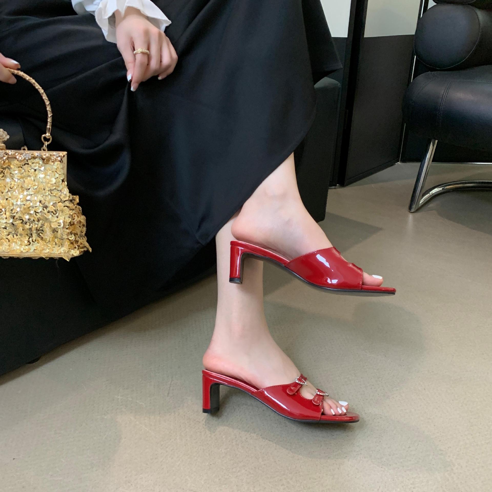 봄과 가을 2024 새로운 요정 사랑 라인스톤 오픈 발가락 슬리퍼 샌들 우아한 거친 미드 힐 샌들