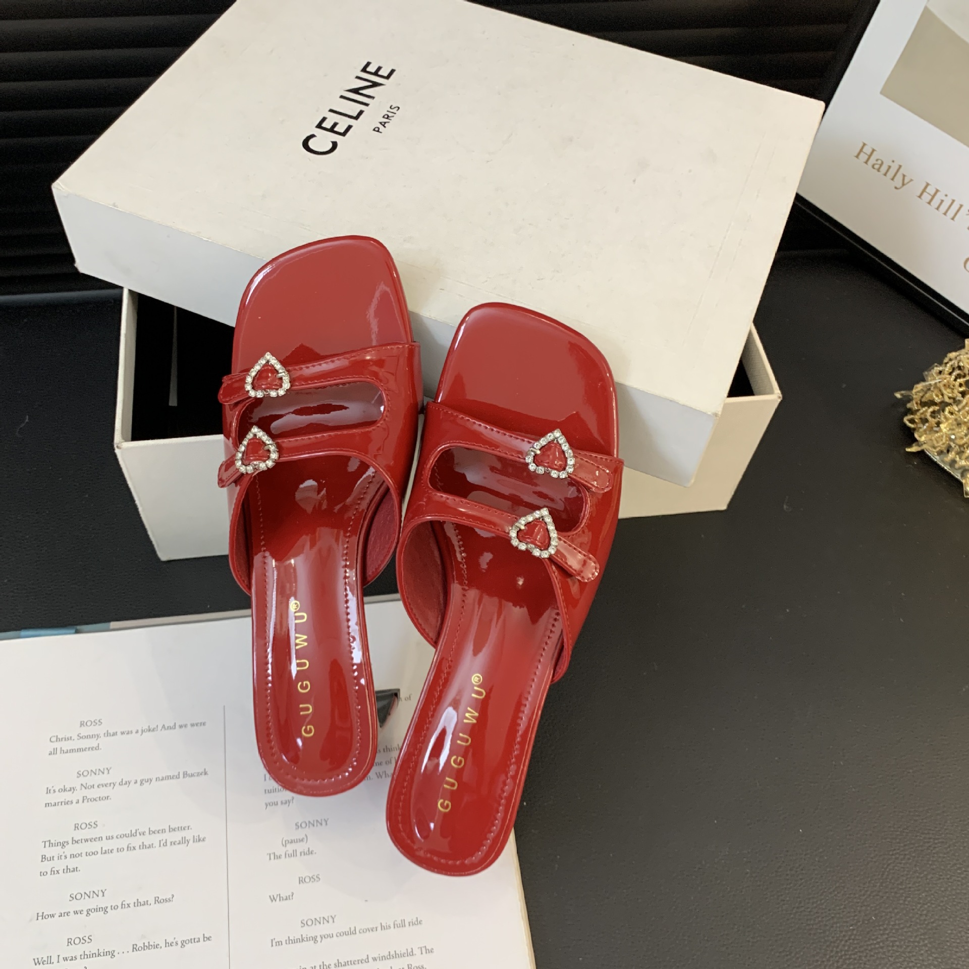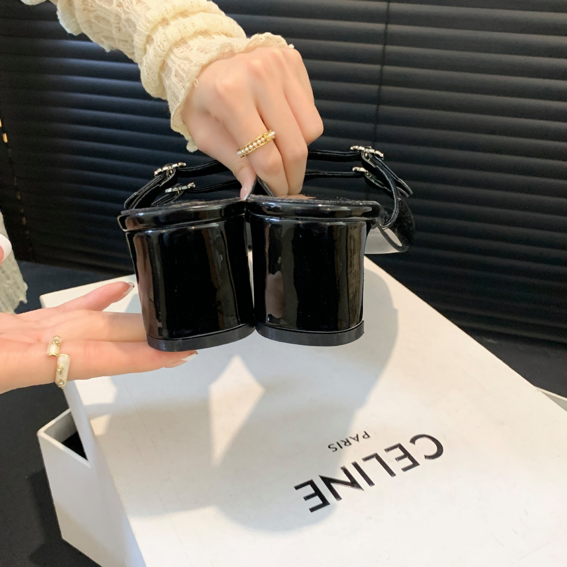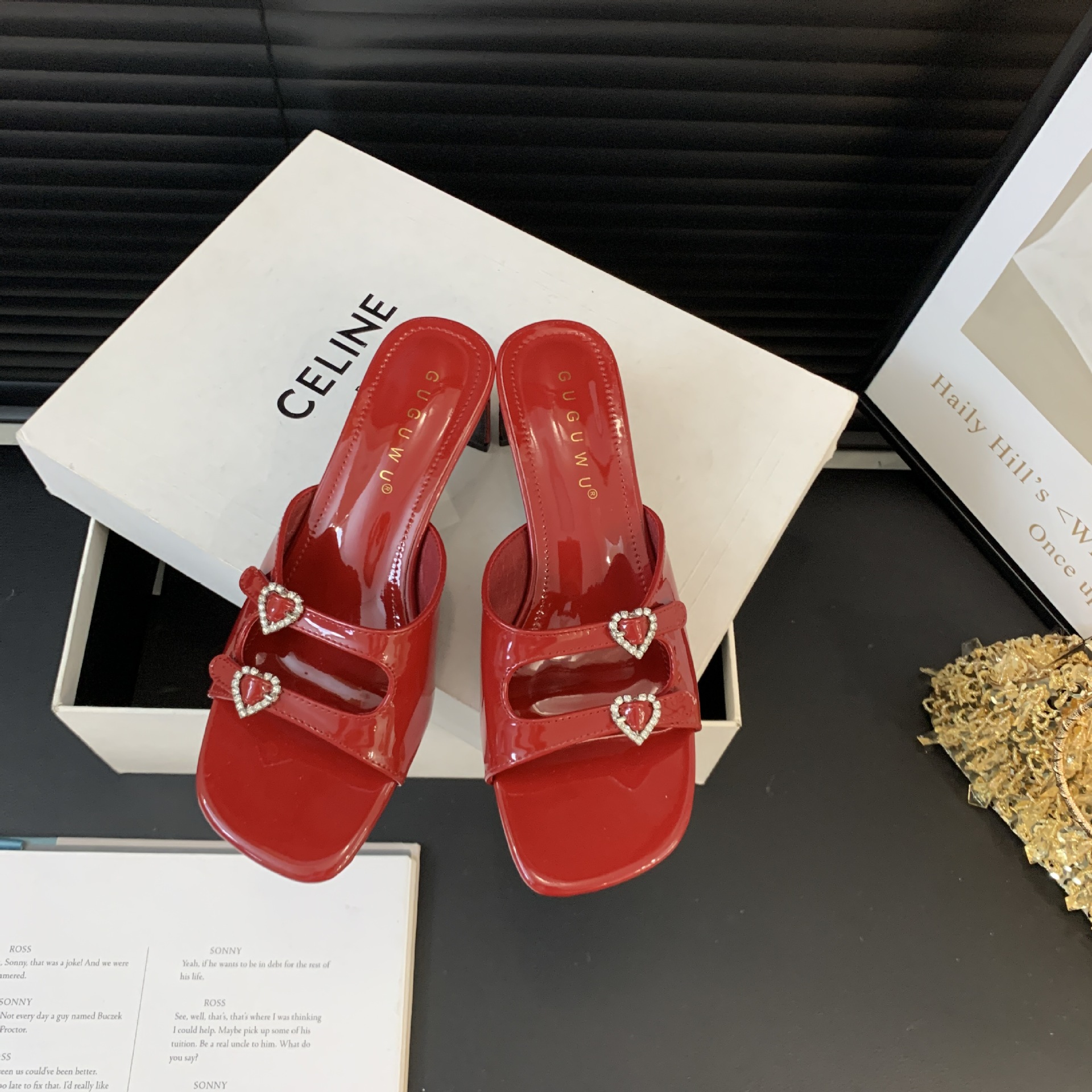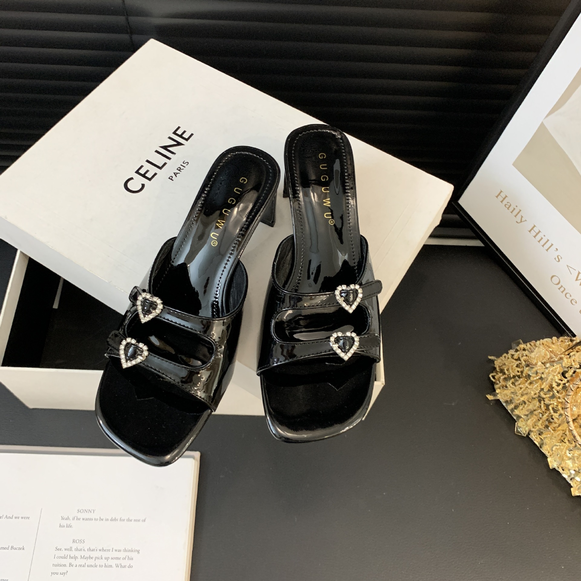 봄과 가을 2024 새로운 요정 사랑 라인스톤 오픈 발가락 슬리퍼 샌들 우아한 거친 미드 힐 샌들