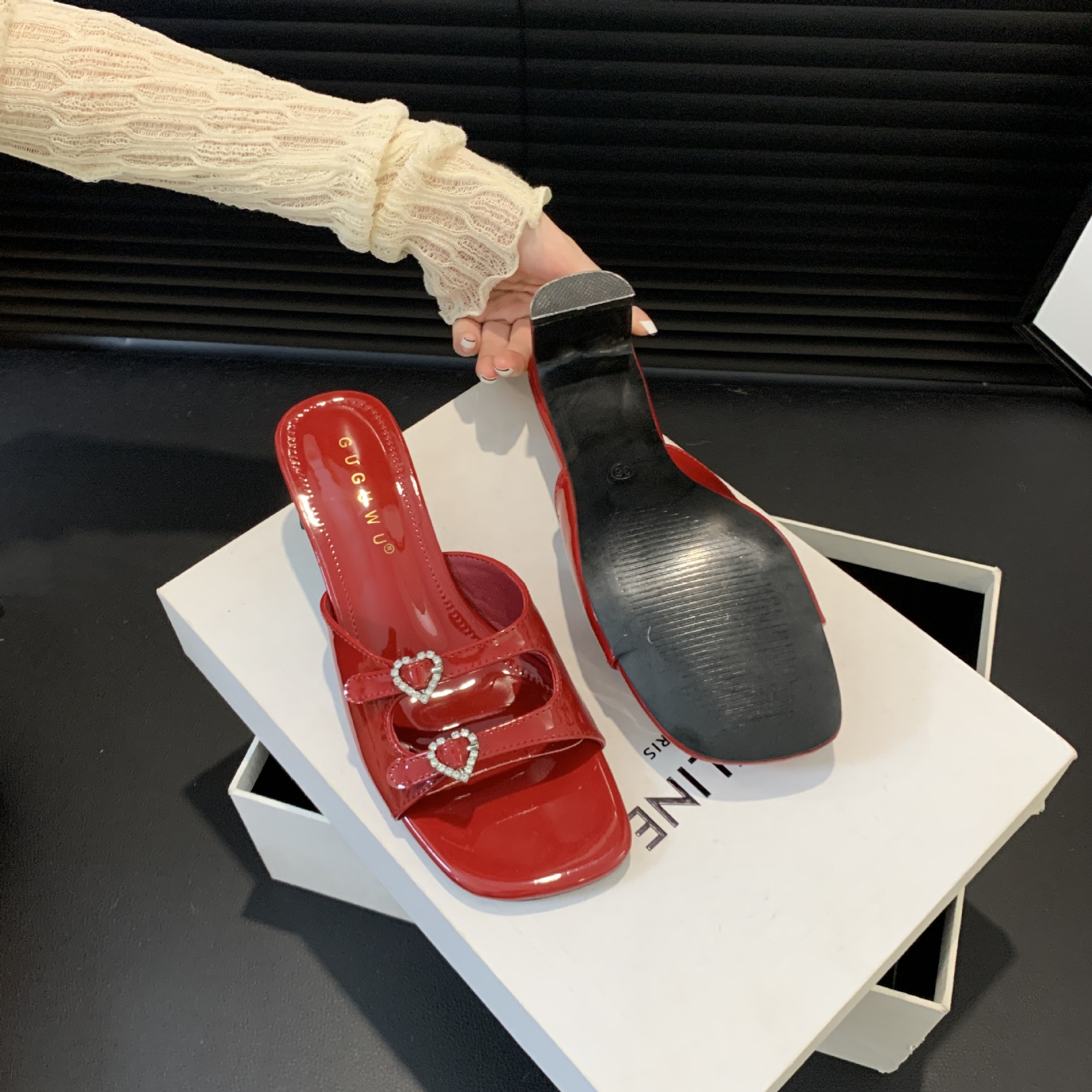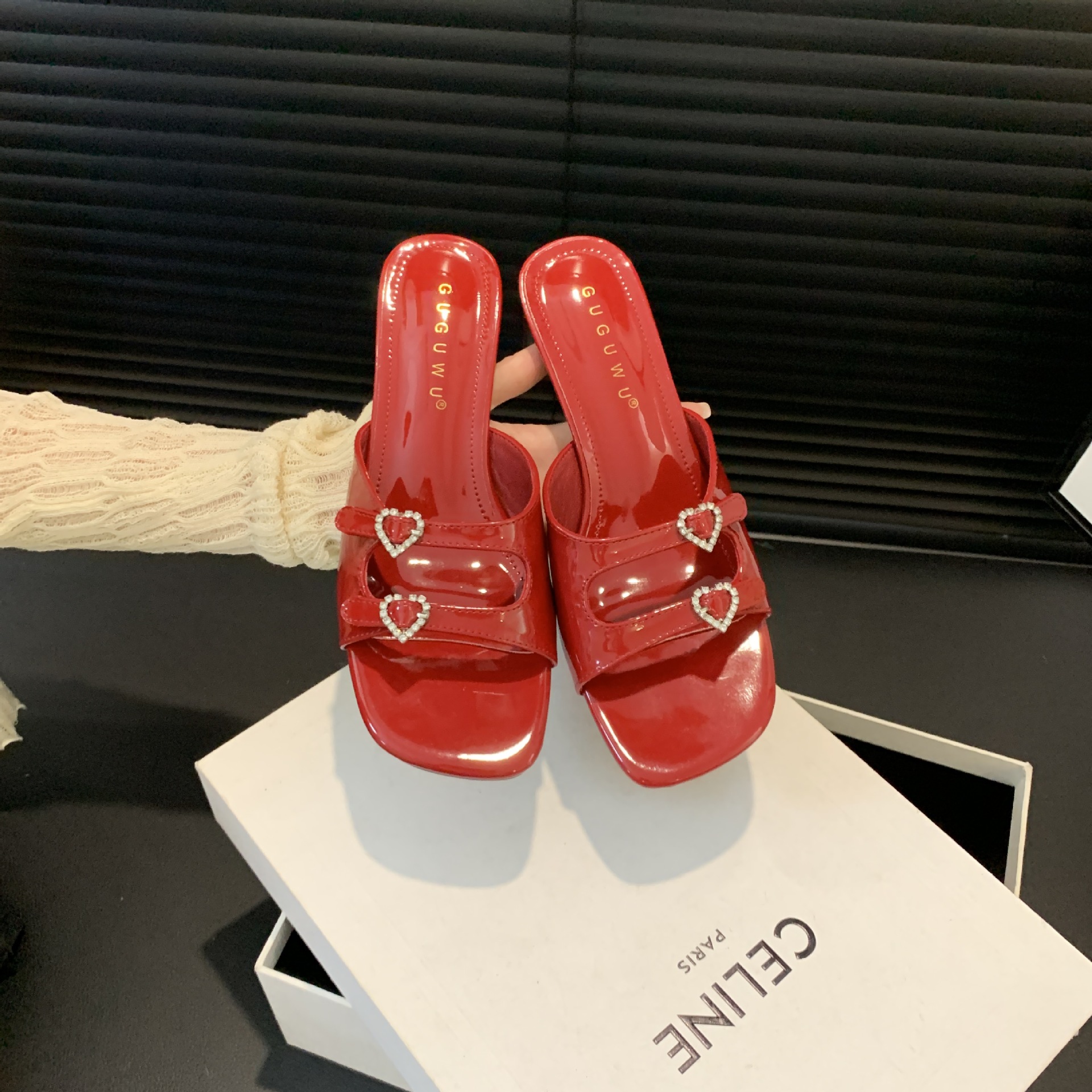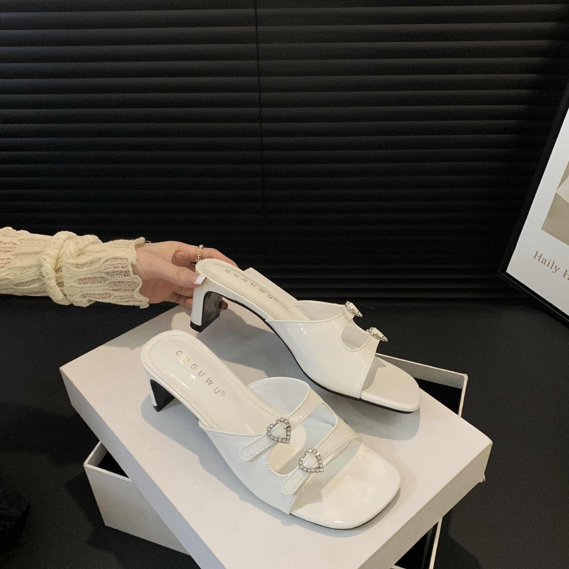 봄과 가을 2024 새로운 요정 사랑 라인스톤 오픈 발가락 슬리퍼 샌들 우아한 거친 미드 힐 샌들스토어 가기