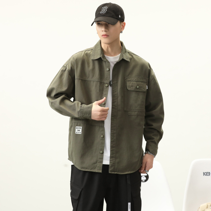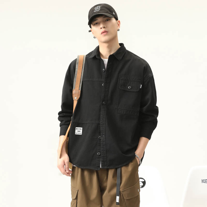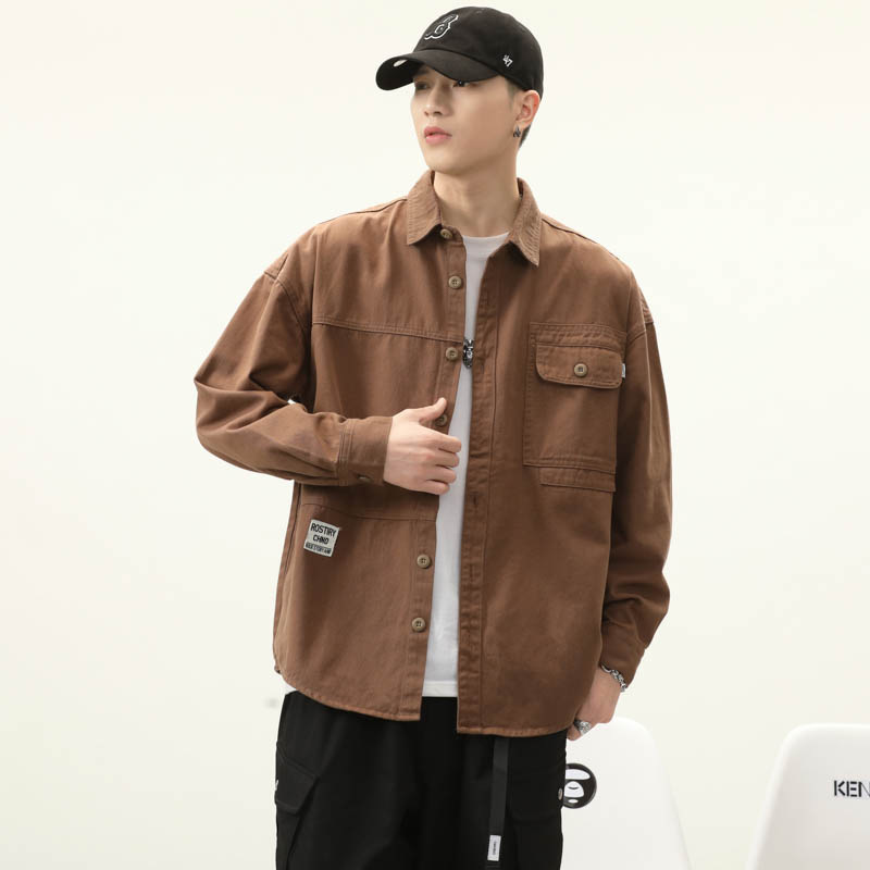 봄 2024 미국 스타일 트렌디 한 캐주얼 긴 소매 셔츠 남성용 느슨한 대형 솔리드 컬러 작업 셔츠 데님 재킷 트렌디스토어 가기