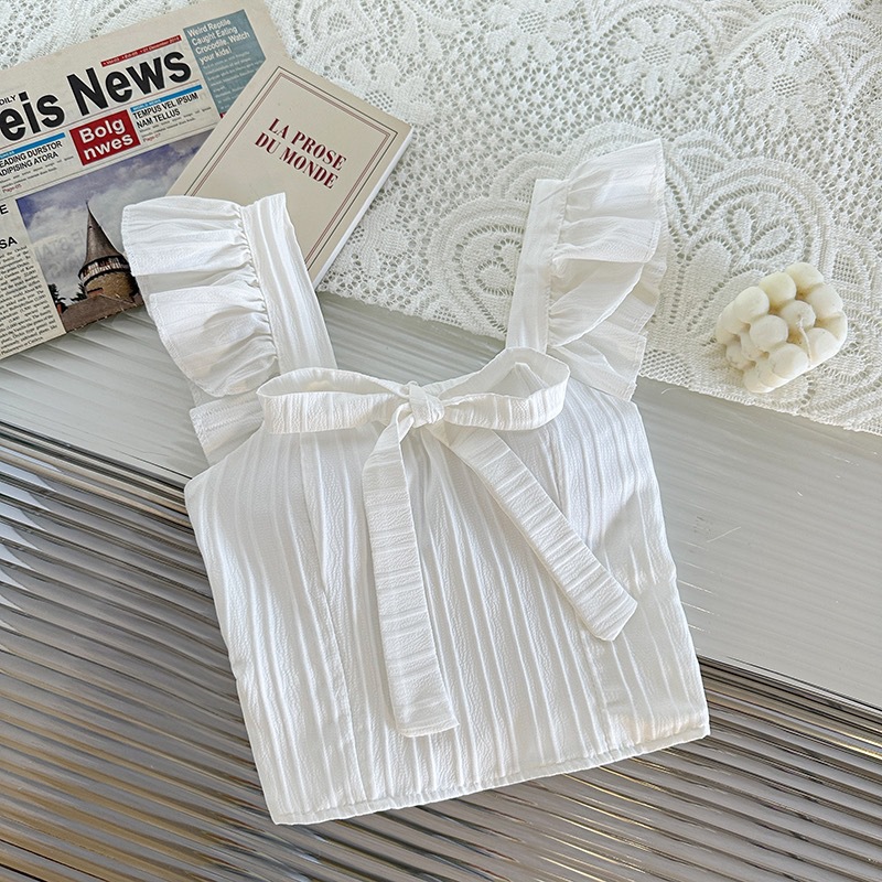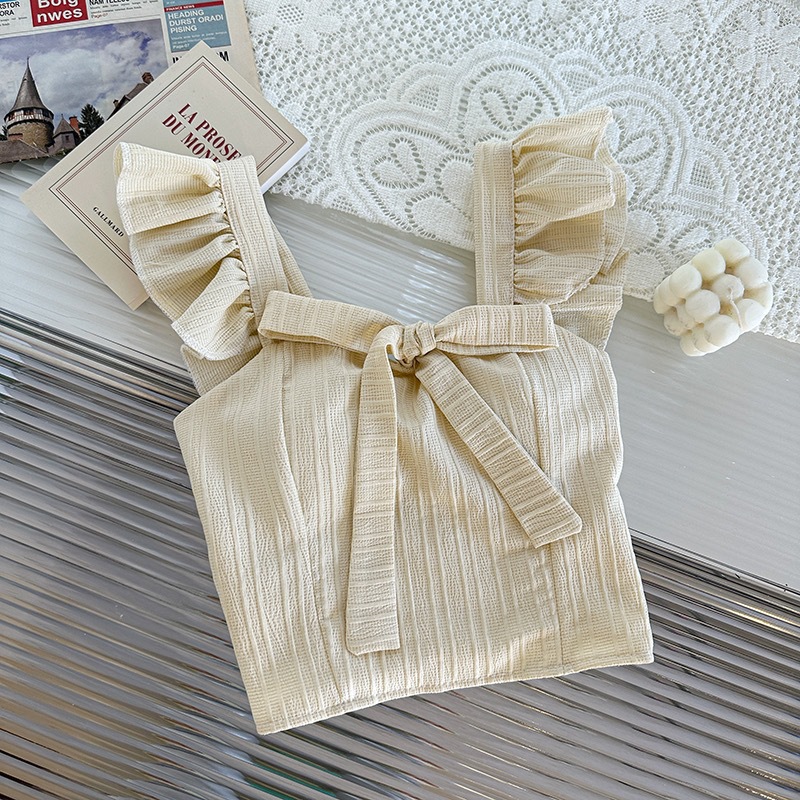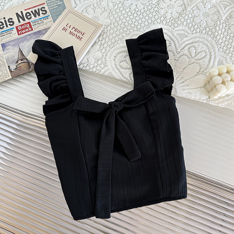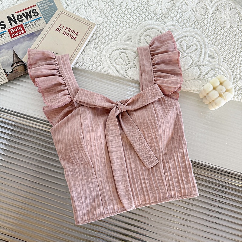 프랑스 스타일 달콤한 얇은 벨트 활 우드 이어 짧은 조끼 섹시한 아름다운 등 달콤한 슬림 핏 슬리밍 탑 슬링