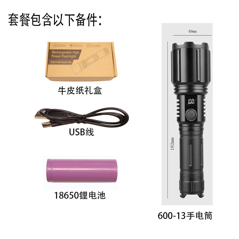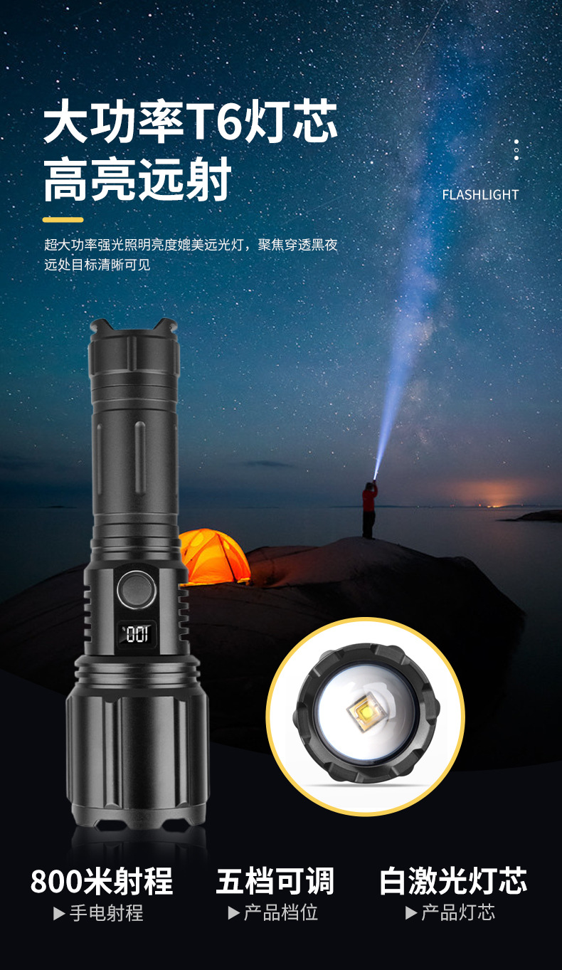 야외 손전등 강한 빛 레이저 총 장거리 다기능 슈퍼 밝은 줌 휴대용 긴 배터리 수명 USB 충전 비상