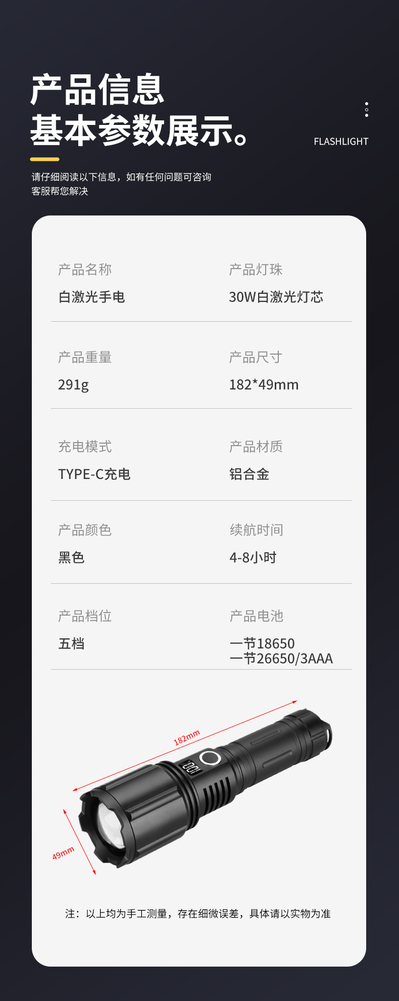 • 손전등 + 충전 케이블 + 18650 리튬 배터리(1800mAh) + 크래프트 종이 선물 상자