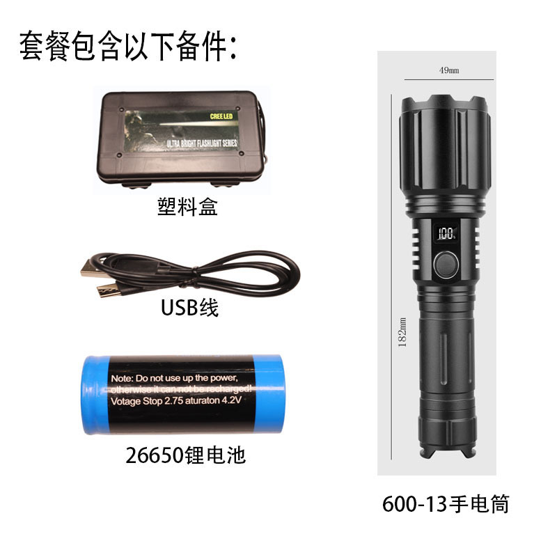• 손전등 + 충전 케이블 + 26650 리튬 배터리 + ABS 플라스틱 상자