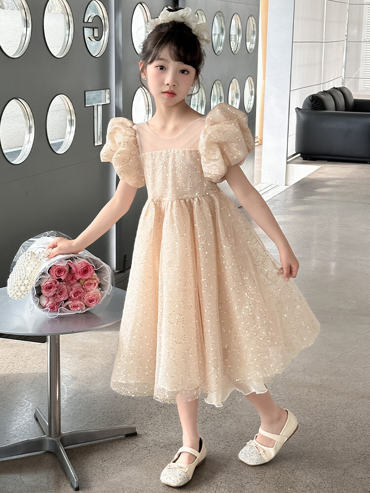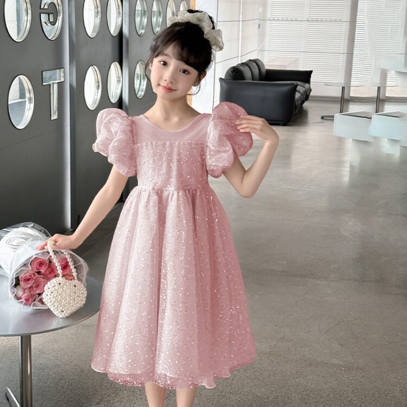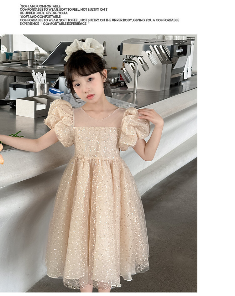원피스 공주 원피스 2024 여름 새 소녀 퍼프 소매 스팽글 공주 원피스 메쉬 나비