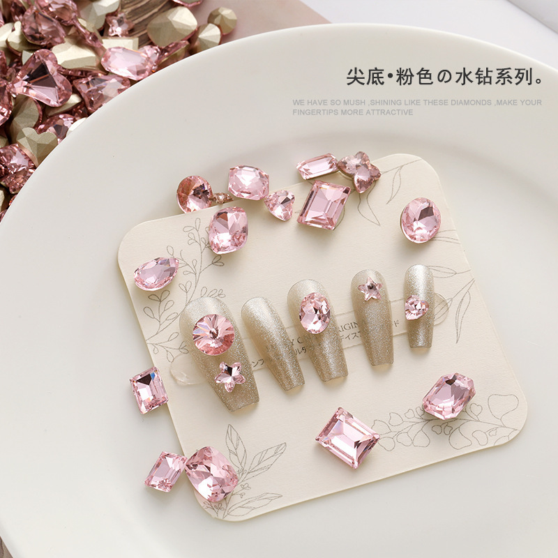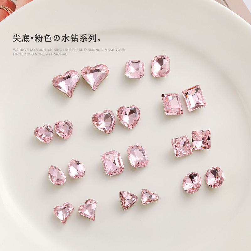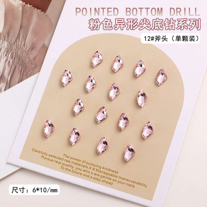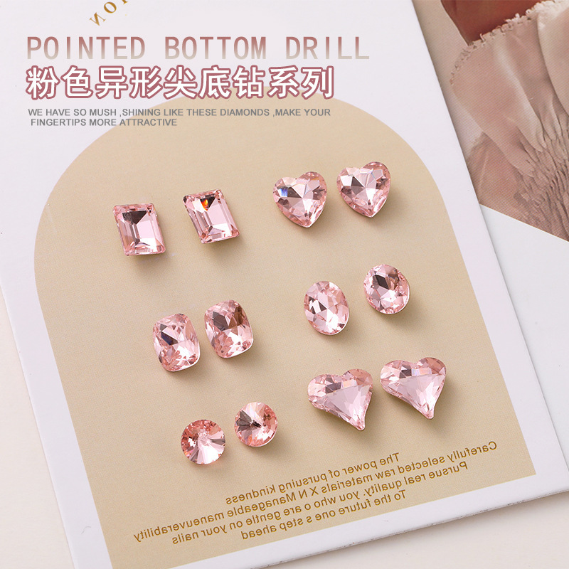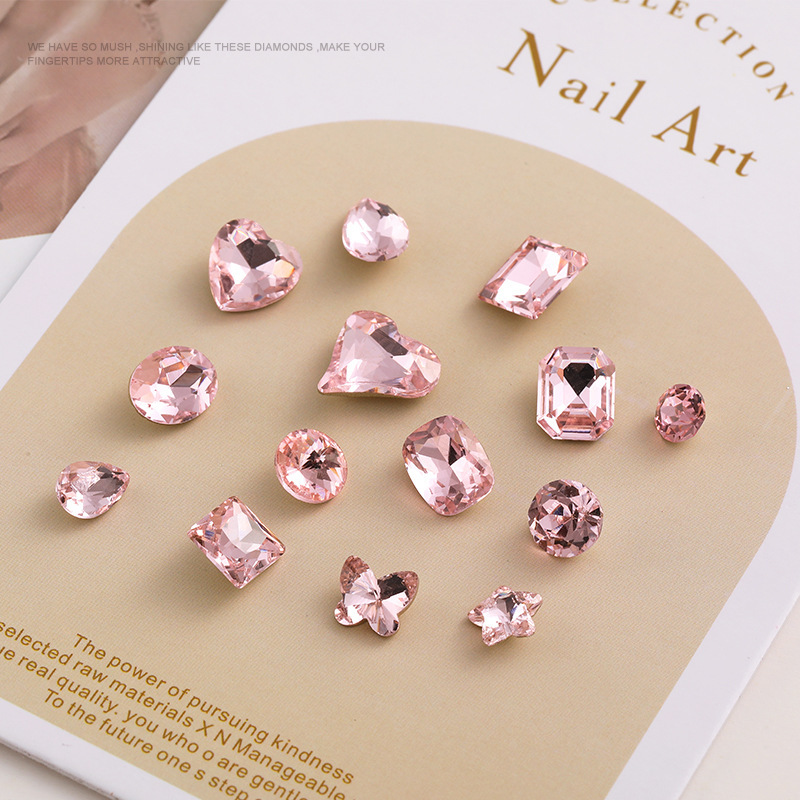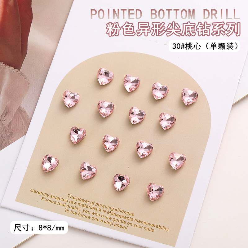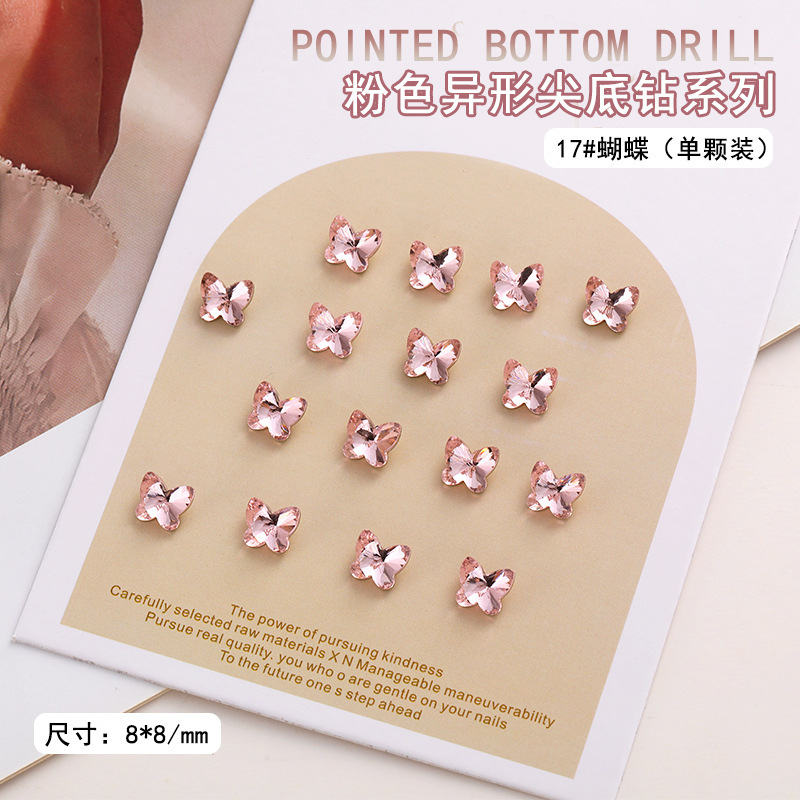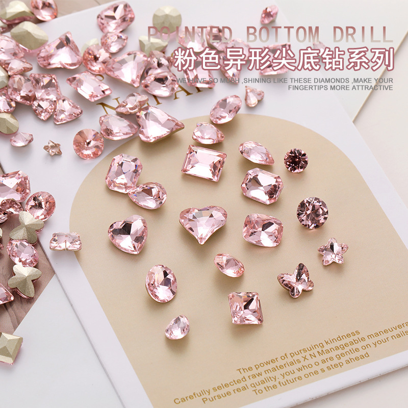 나비 모양의 뾰족한 도끼 모양의 액세서리, 하트 모양의 네일 장식, 특별한 모양의 핑크색 네일 크리스탈스토어 가기