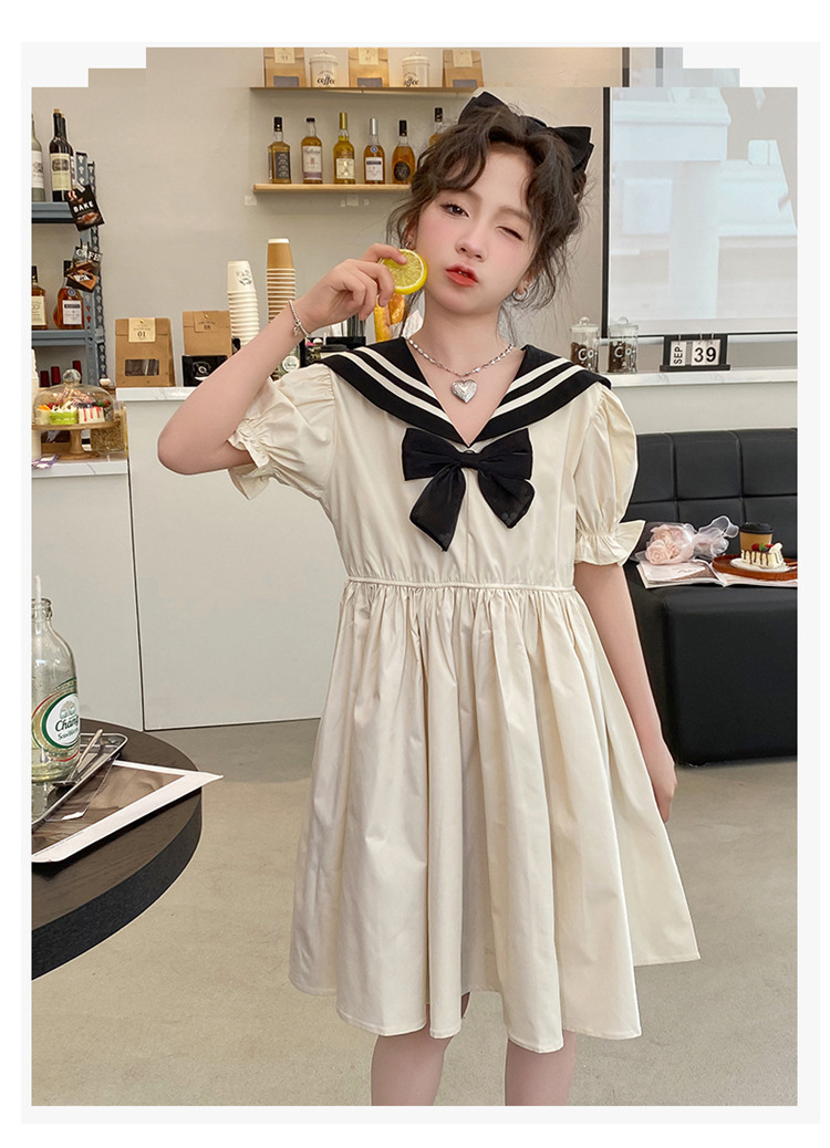 여자 여름 해군 칼라 컬러 블록 원피스 2024 새로운 어린이 스타일 귀여운 공주 원피스 소녀