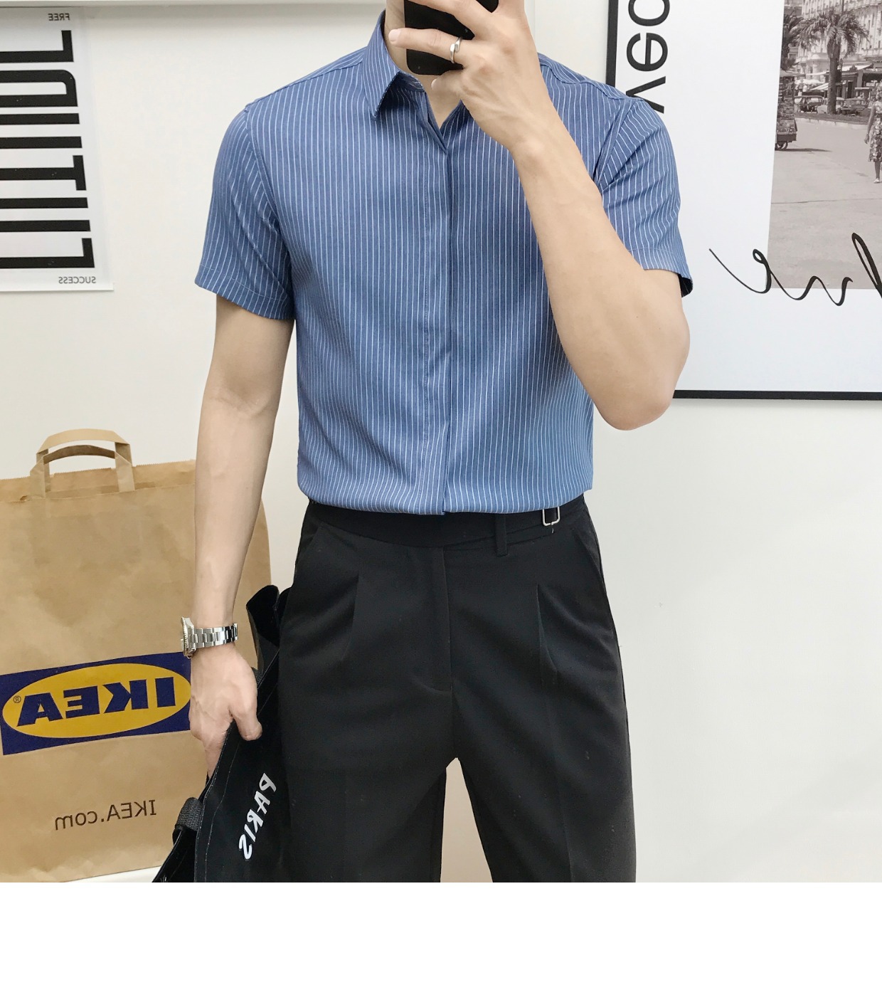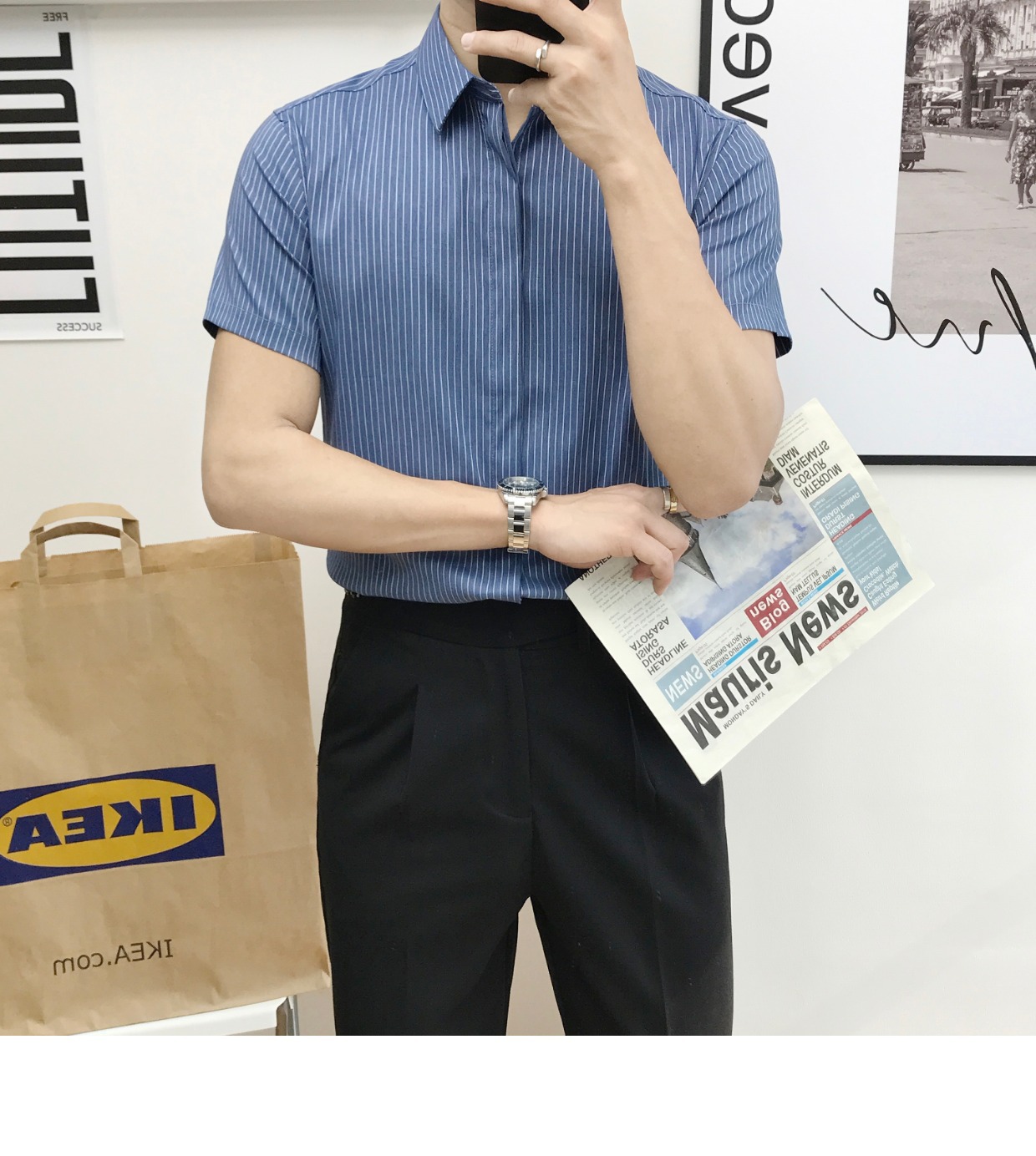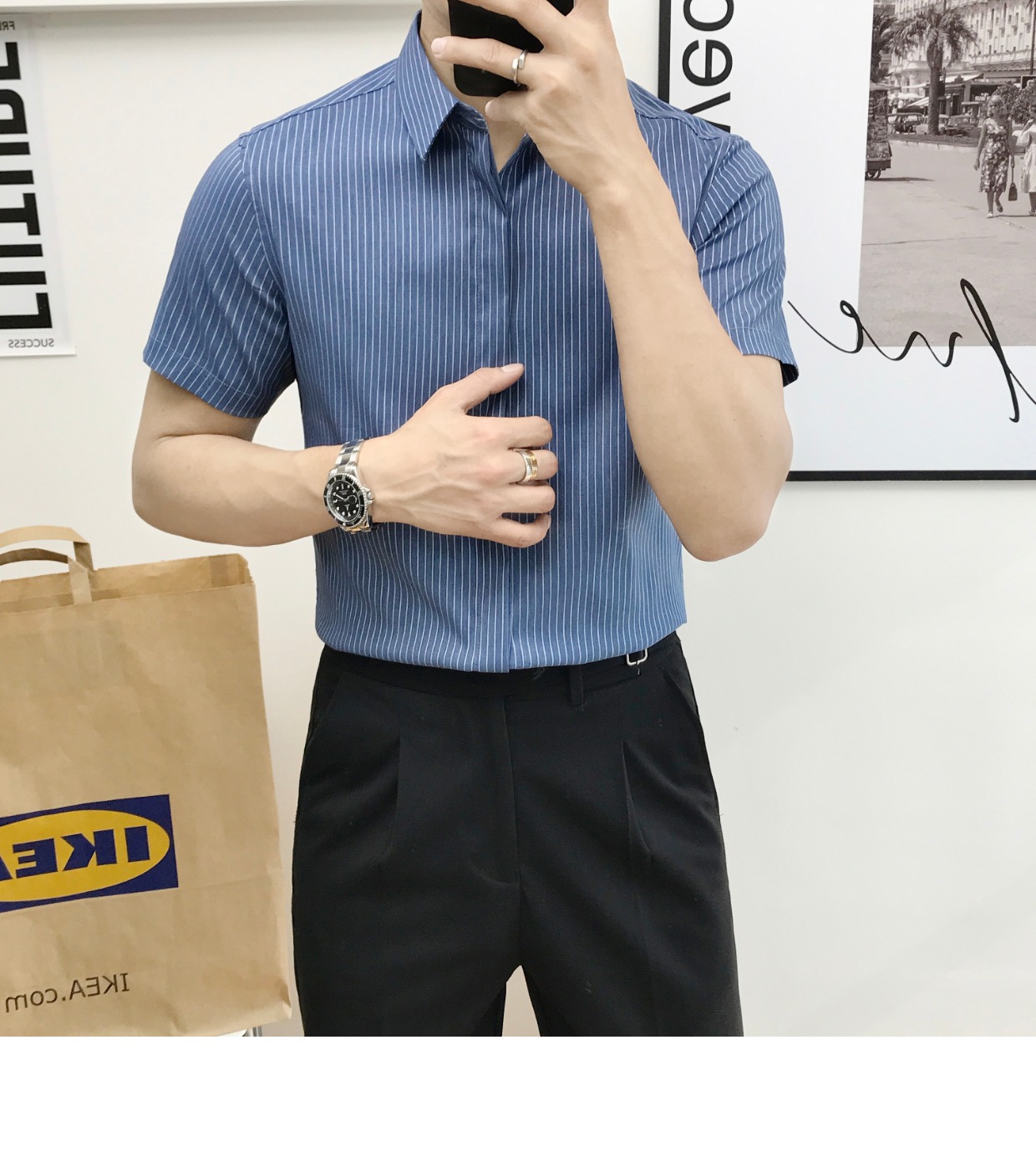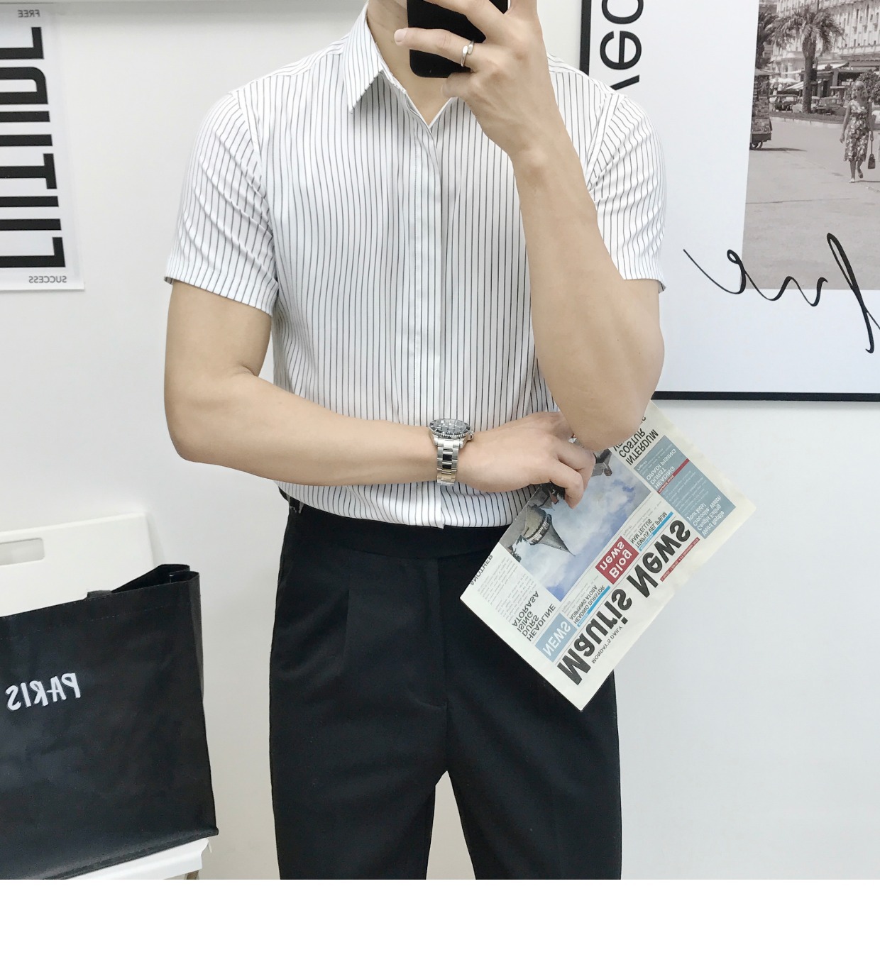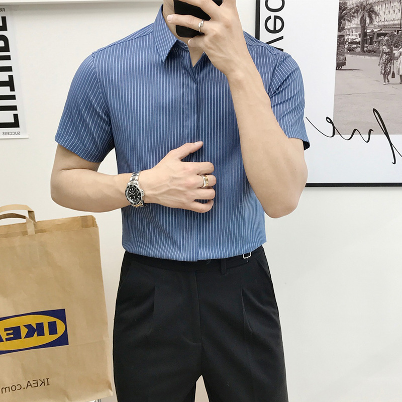 여름 얇은 줄무늬 셔츠 남자 반팔 한국 유행 잘 생긴 셔츠 다크 버튼 남자 비 다림질 반팔 셔츠스토어 가기