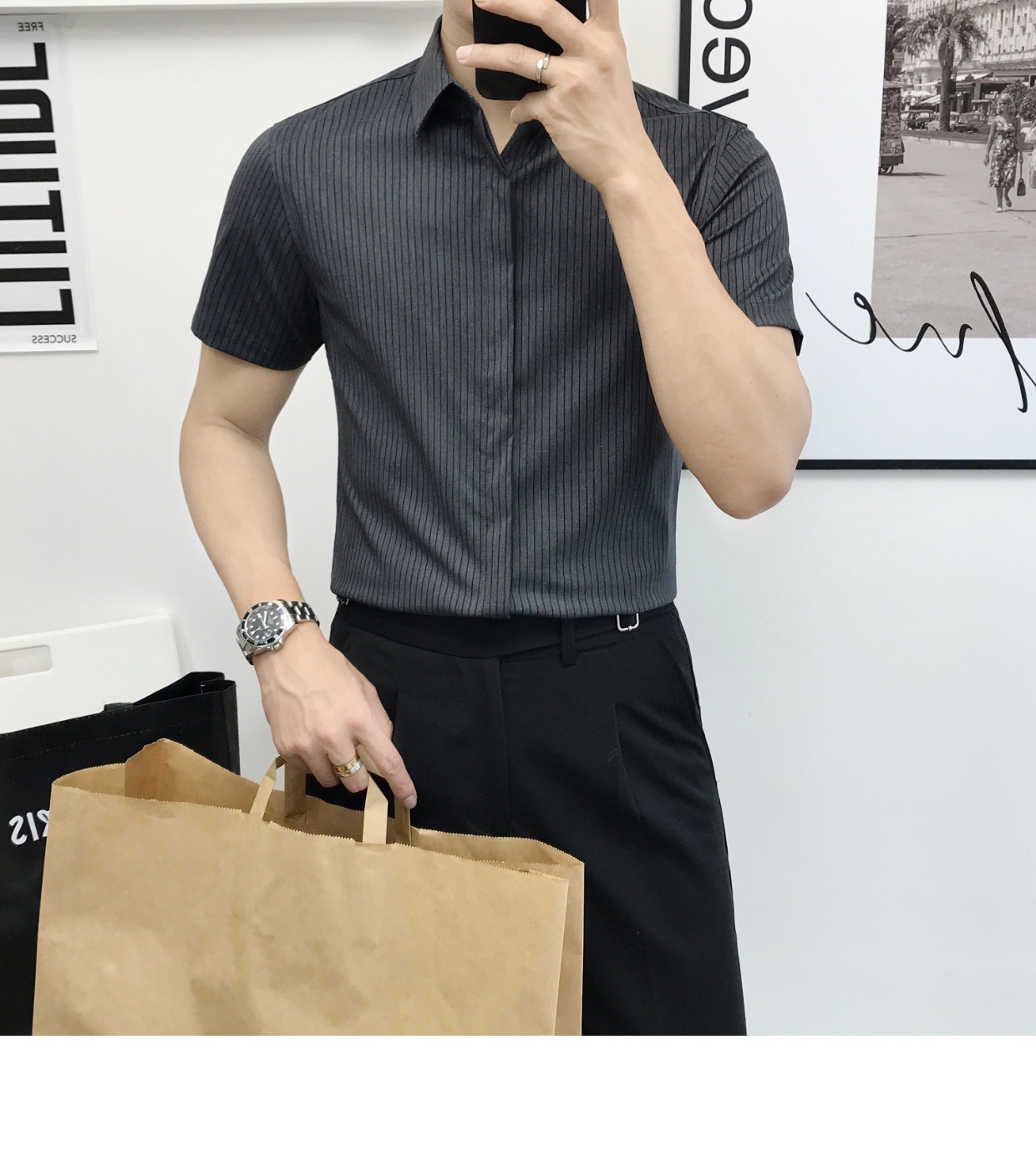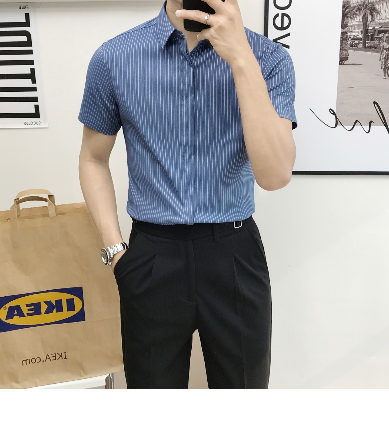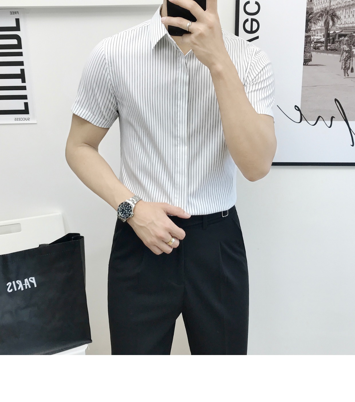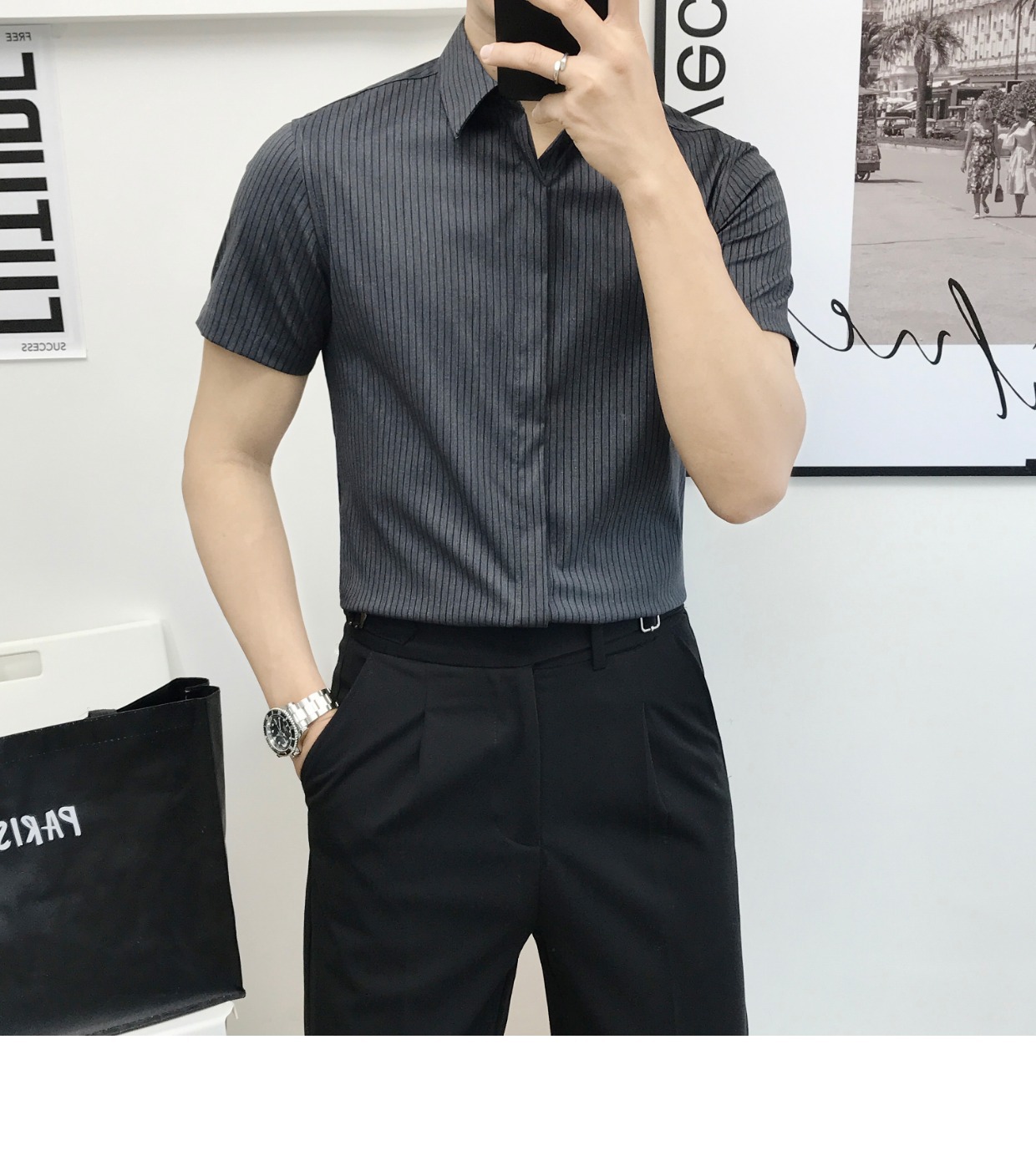 여름 얇은 줄무늬 셔츠 남자 반팔 한국 유행 잘 생긴 셔츠 다크 버튼 남자 비 다림질 반팔 셔츠스토어 가기