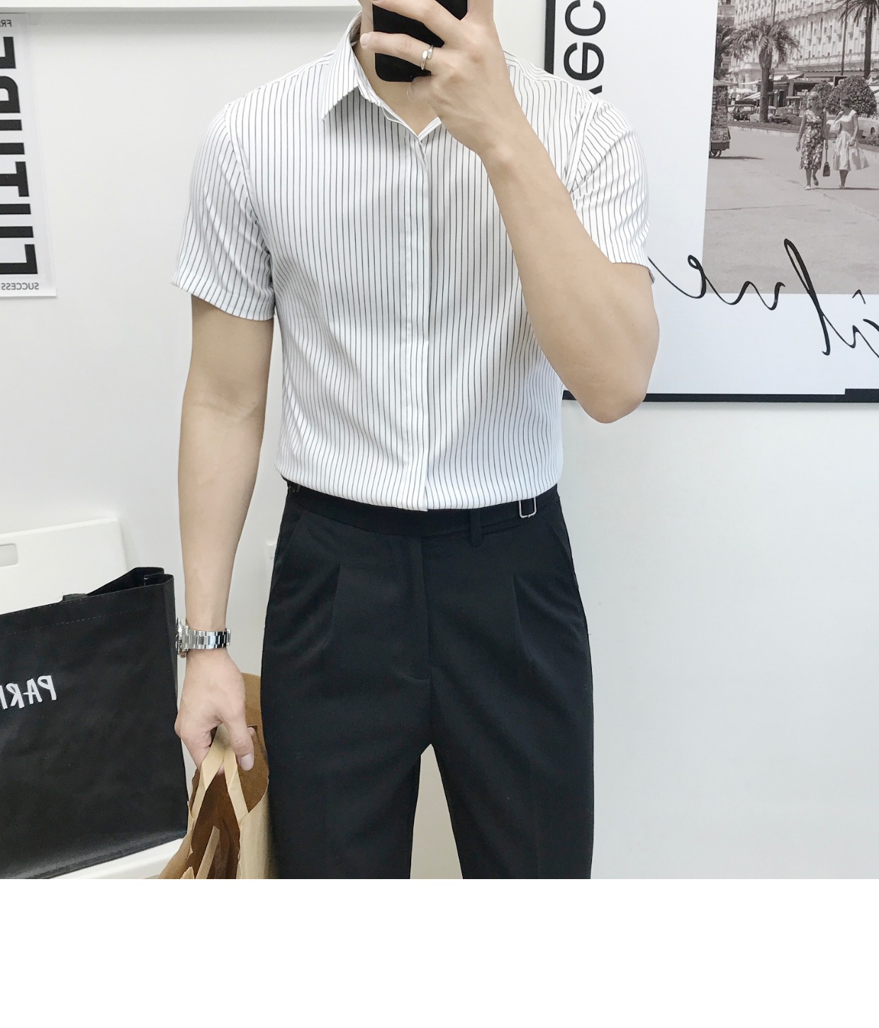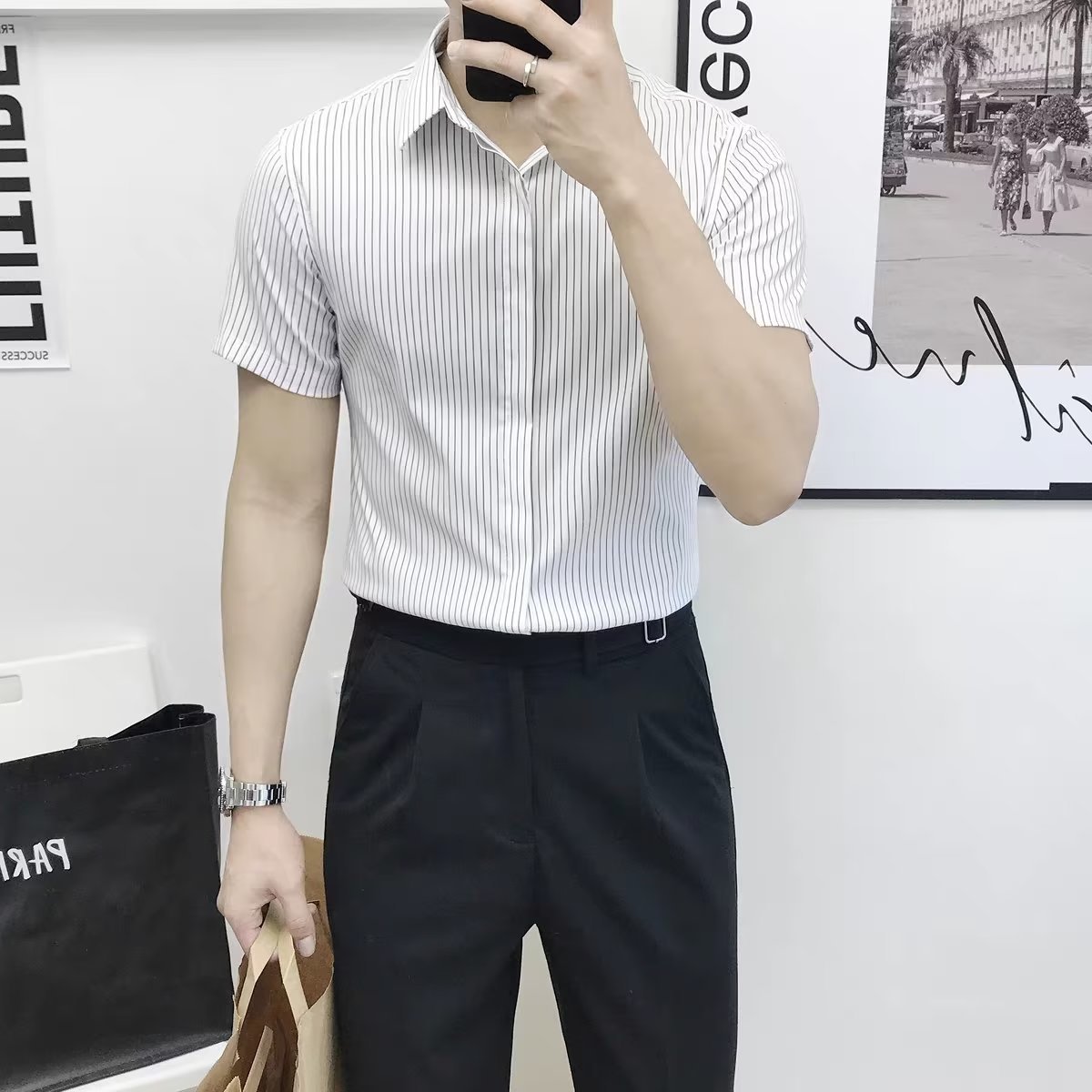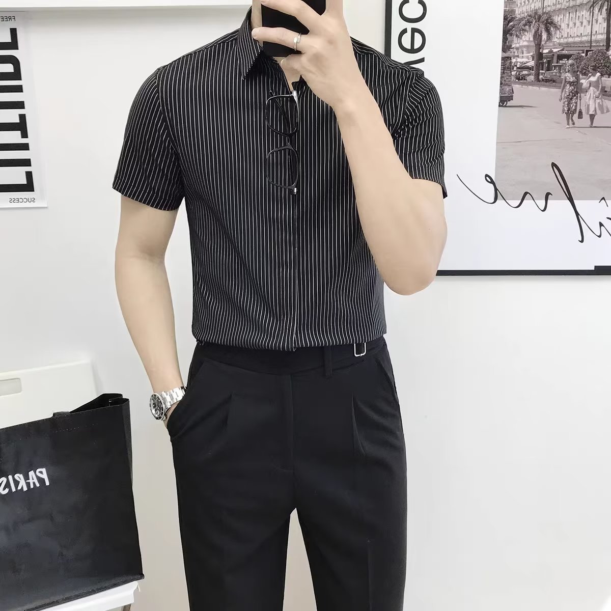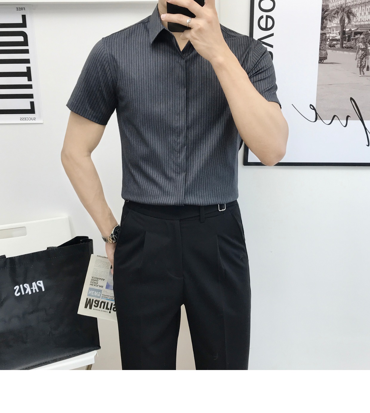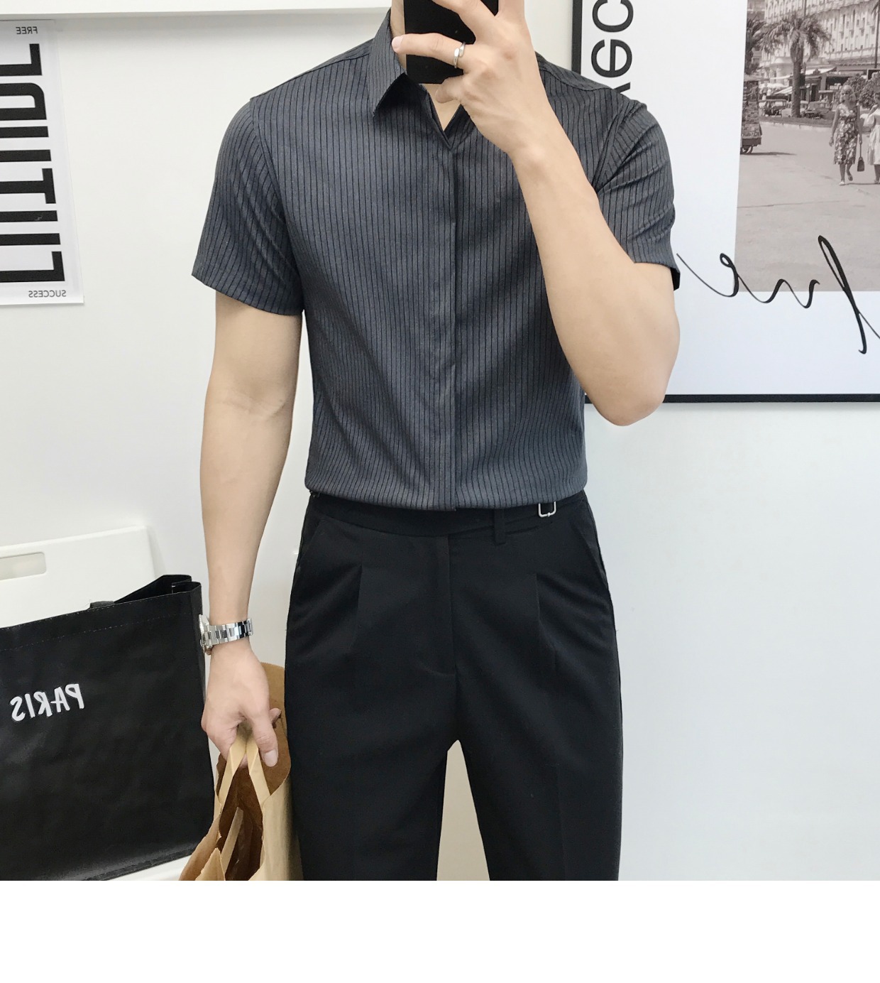 여름 얇은 줄무늬 셔츠 남자 반팔 한국 유행 잘 생긴 셔츠 다크 버튼 남자 비 다림질 반팔 셔츠스토어 가기