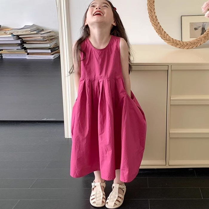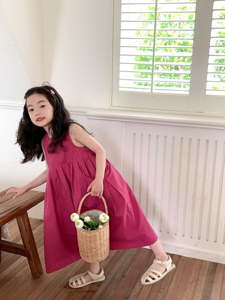소녀 한국 스타일 2024 새로운 여름 원피스 패션 세련된 비스코스 원피스 어린이 대형 스커트 소매 스커트스토어 가기
